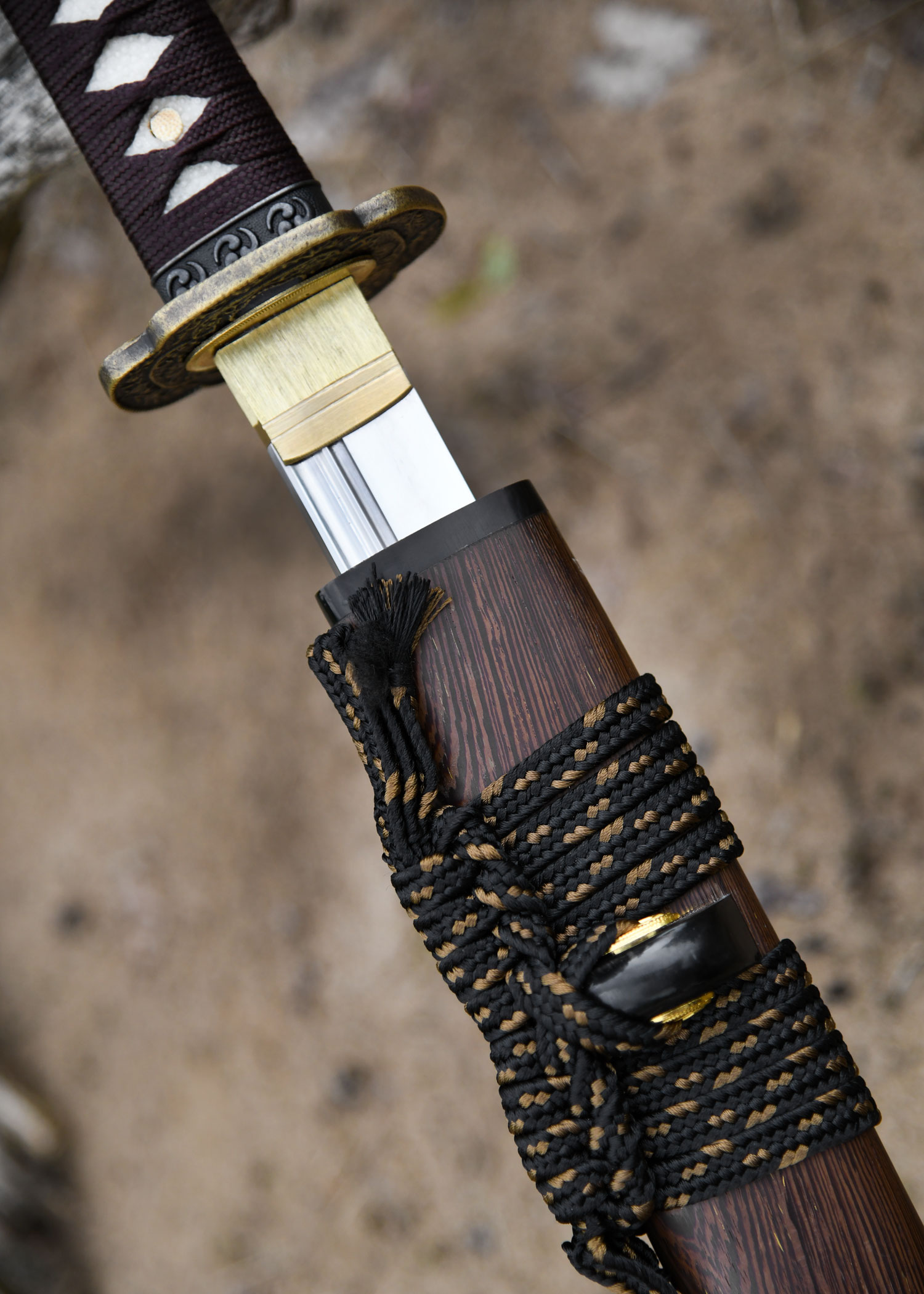 Die Herstellung eines besonderen Schwertes erfordert eine besondere Scheide. Nagi-Gatana's vollständig maßgefertigte, edle Hartholz-Saya ist mit einer goldgepunkteten schwarzen Seiden Sageo und Büffelhorn Kurigata und Koiguchi gepaart. Die Schicht aus hellbrauner Holzbeize verleiht der Saya einen Hauch von Luxus. Jede der atemberaubenden Sayas wurde von Hand gefertigt und genau an ihr Schwert angepasst, was bedeutet, dass kein anderes Schwert, nicht einmal ein anderes Nagi-Gatana von BattleBlades, in diese Saya passen würde.