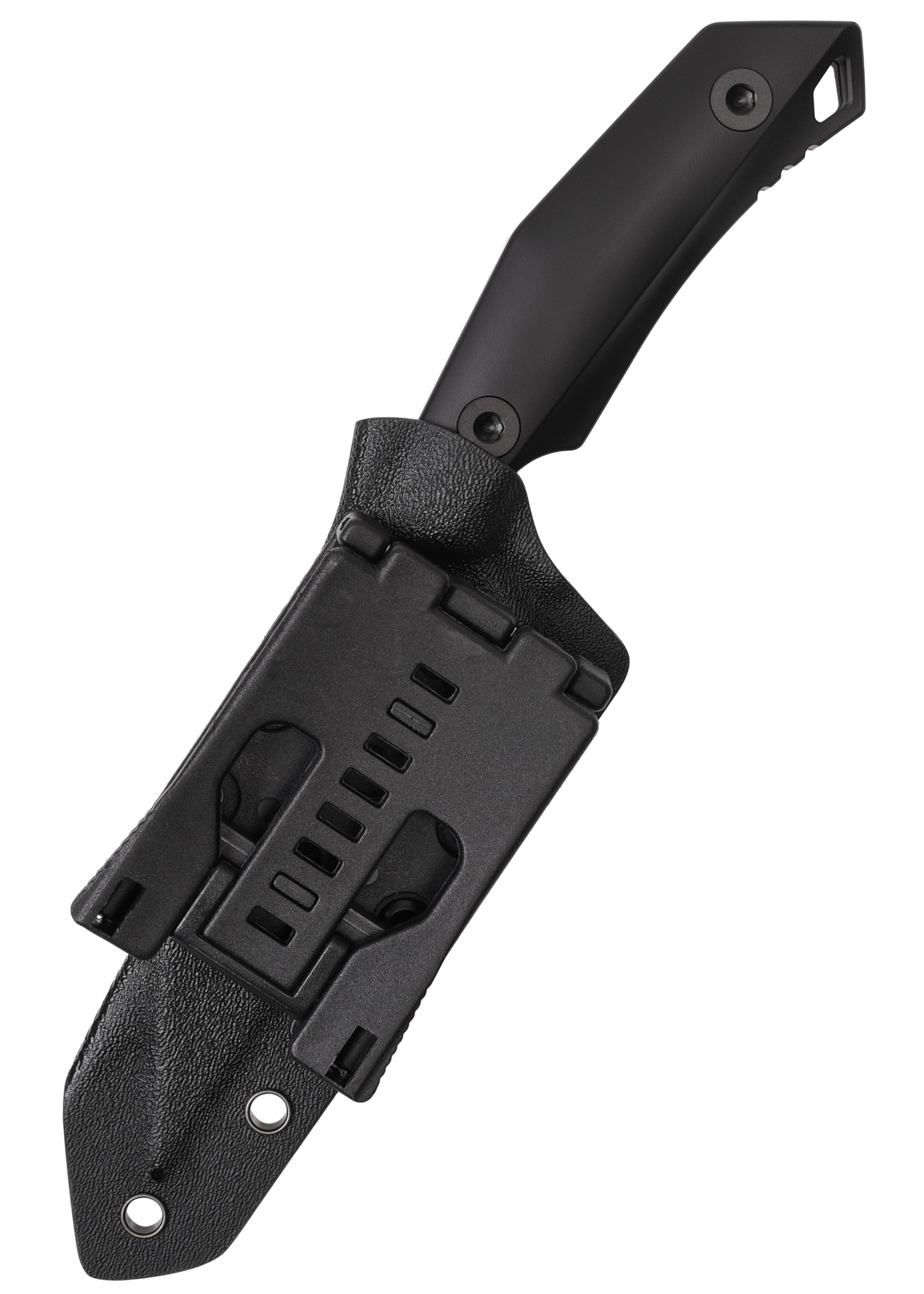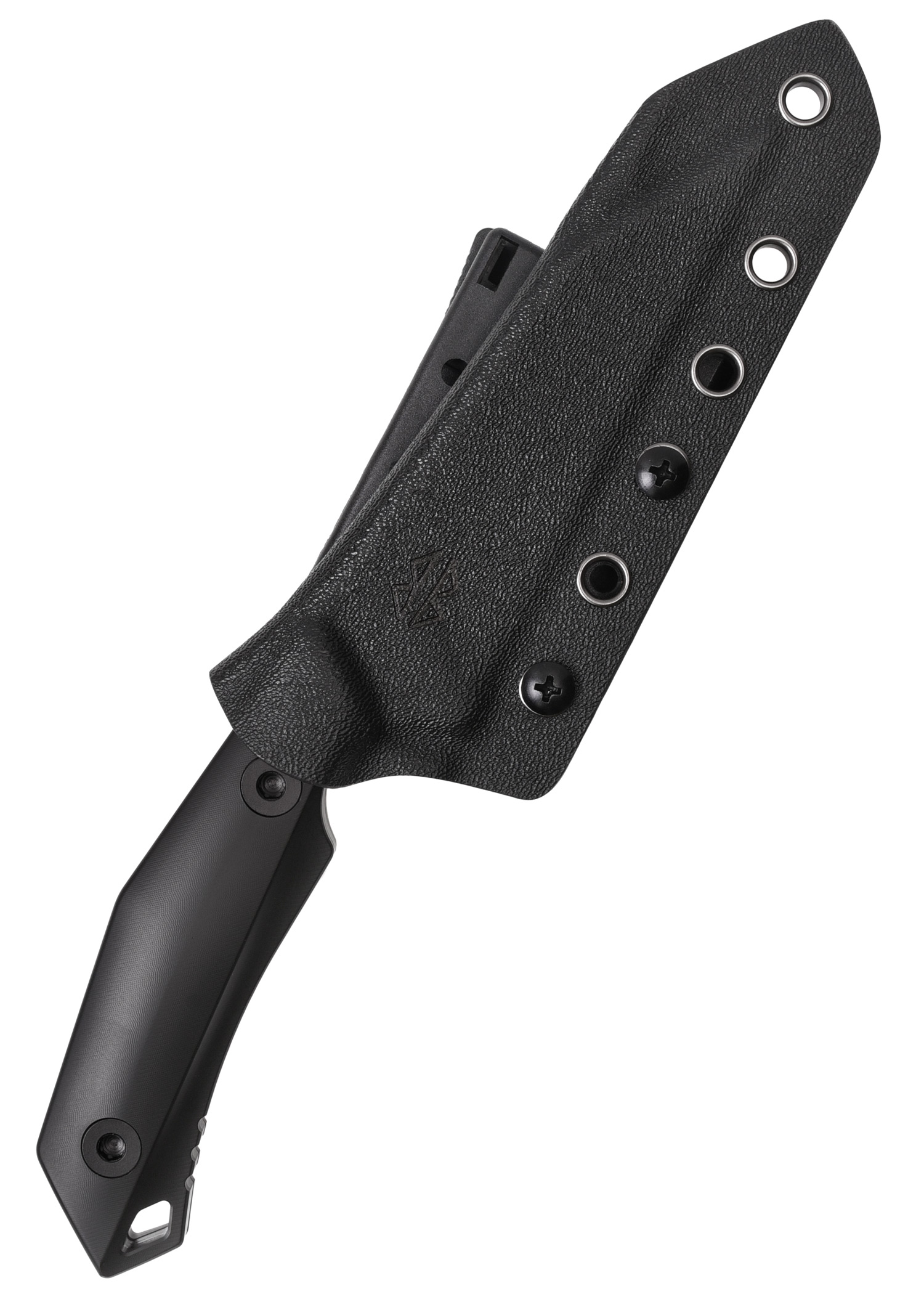 Die 4 Millimeter starke Klinge aus Böhler N690 Edelstahl ist flachgeschliffen und verspricht hervorragende Ergebnisse bei einer Schneidenlänge von ca. 10,5 cm. Zur Griffpartie hin ziert ein funktionales Jimping sowie das tiefengeätzte Berserk Blades Logo Klingenrücken und Ricasso. Der Griff dieses Fulltang-Messers übernimmt vom YARR und dem RAK den unverkennbaren großen Fingerchoil, welcher ein Hauptmerkmal dieser Serie darstellt und für eine angenehme Handlage und Balance sorgt. Griffschalen aus 3D-gefrästen und gestrahltem schwarzen Acryl geben dem THARN einen modernen bzw. cleanen Look und erzielen ein angenehmes Gefühl beim Halten des Messers. Das in der Messerwelt nur selten zum Einsatz kommende Acryl ist sehr stabil und zugleich witterungsbeständig. Um sich auf eigenen Wunsch hin einen Fangriemen zu installieren verfügt das THARN im unteren Bereich des Griffendes ein der Kontur folgendes Loch zur Befestigung. Getragen wird das Messer in einer Scheide aus unverwüstlichem und jeglicher Witterung trotzenden Kydex. Eine Daumenrampe erhöht den Komfort beim Herausziehen des Messers. Die Ösen an der Kydex erlauben die Befestigung der unterschiedlichsten Trage-Systeme. Im Lieferumfang enthalten ist das beliebte Multimontagesystem, welches das Messer horizontal oder vertikal tragbar macht. Des Weiteren bieten wir zu unseren Modellen sogenannte Beltloops an, die an den Ösen angebracht werden können und somit ein horizontales Tragen quer zum Gürtel (Scout Carry) möglich macht.