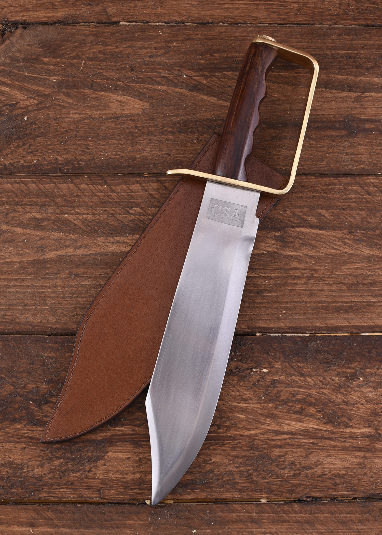 Diese Replik des Bowie-Messers aus dieser Zeit besitzt eine ungeschärfte Klinge aus Kohlenstoffstahl auf der CSA (Confederate States Army) eingearbeitet ist. Der Griff besteht aus dunklem Holz und besitzt einen Handschutzbügel aus Messing.