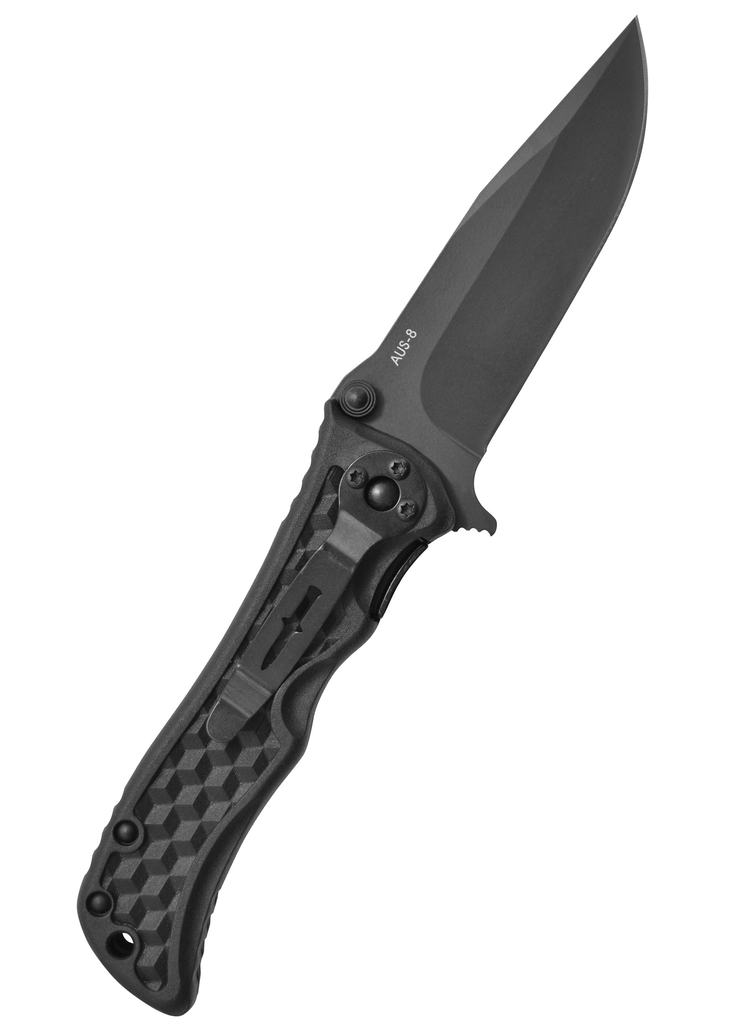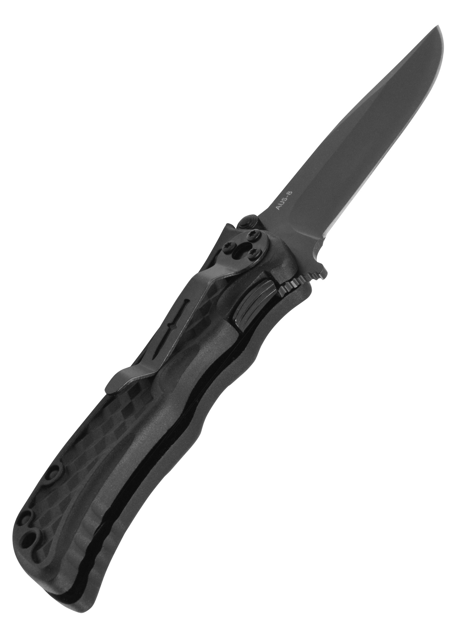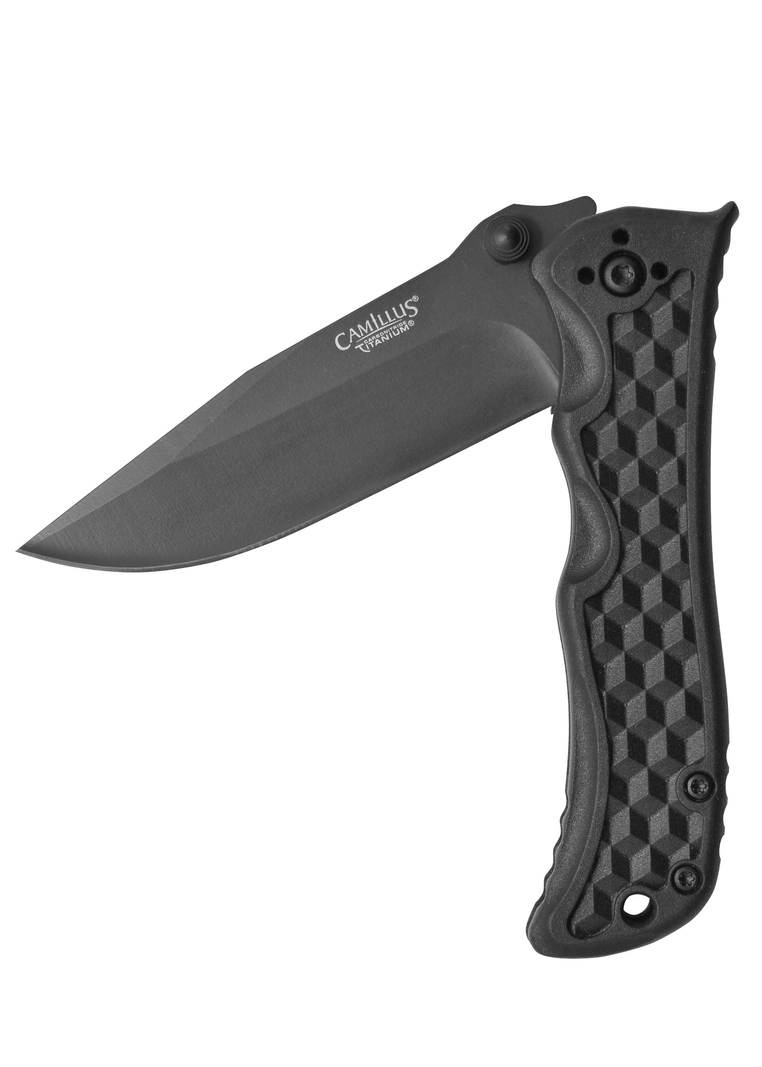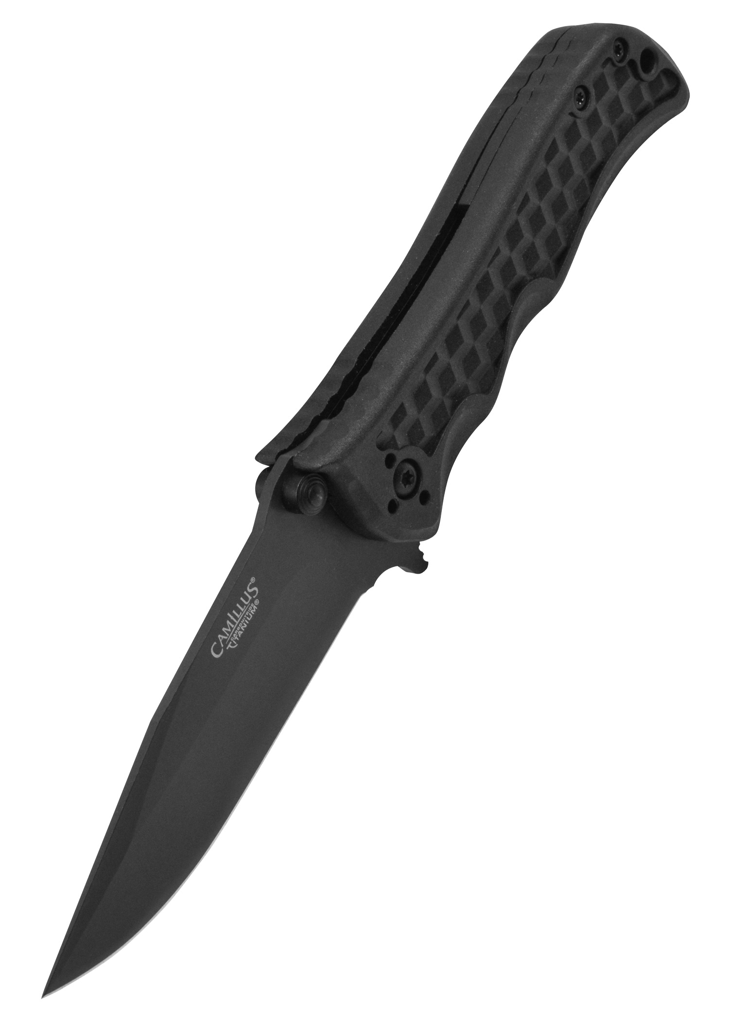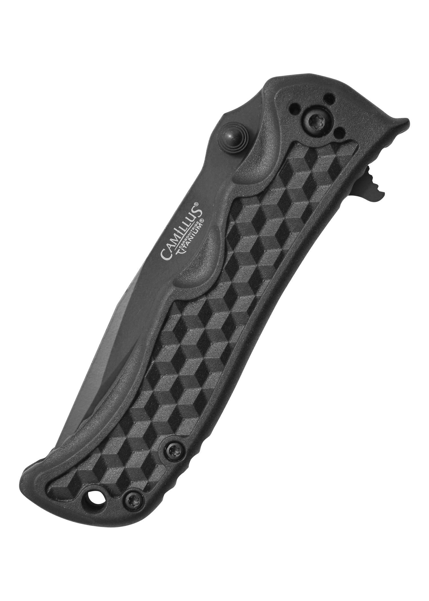 Das Camillus REVERB Klappmesser mit Öffnungspins und Flipper lässt sich dank des Quick Launch Bearing Systems einfach öffnen. Seine 7,6 cm lange Drop-Point Stahlklinge aus AUS-8 mit Hohlschliff ist schwarz und dank der Carbonitride Titanium Veredelung besonders hart und korrosionsbeständig. Fixieren und lösen lässt sich die Klinge per Liner-Lock Arretierung.