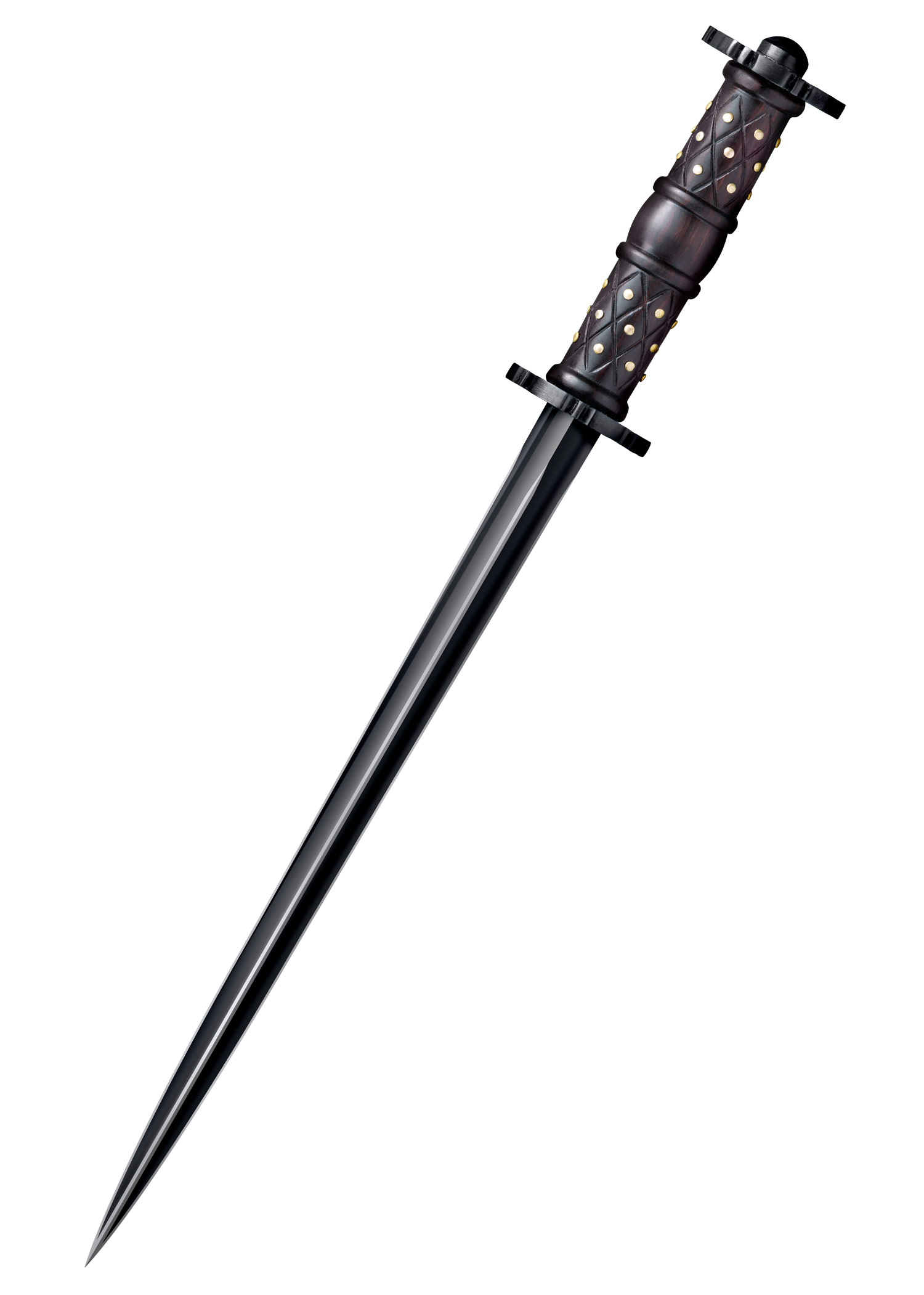 Die lange, gerade Klinge von Cold Steels® Scheibendolch ist hohlgeschliffen und verfügt über drei Schneiden. Sie ist unglaublich biegesteif und verjüngt sich zu einem extrem spitzen Ort. Außerdem wurde sie tief gebläut und ihre Schneidkanten von Hand poliert, was dem Dolch eine wunderschöne Optik verleiht. Der gedrechselte Griff aus malaysischem Salholz ist mit aufwendigen Handschnitzereien verziert und mit kleinen Messingstiften versehen, die zugleich dekorativ sind und für mehr Griffigkeit sorgen. Die stilechten Scheiben am Parier und Knauf wurden mit Feilarbeiten verschönert und bieten hervorragenden Schutz für die Hand.