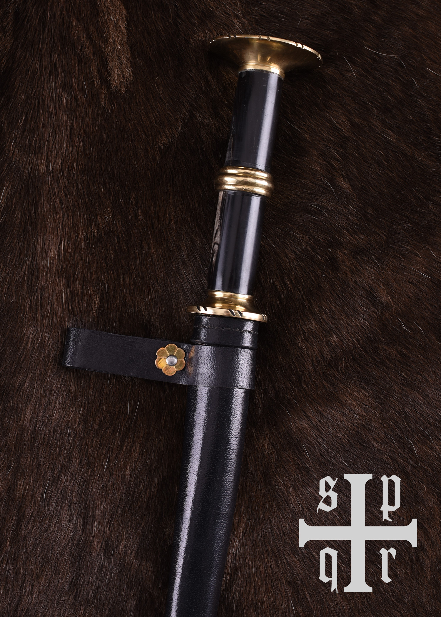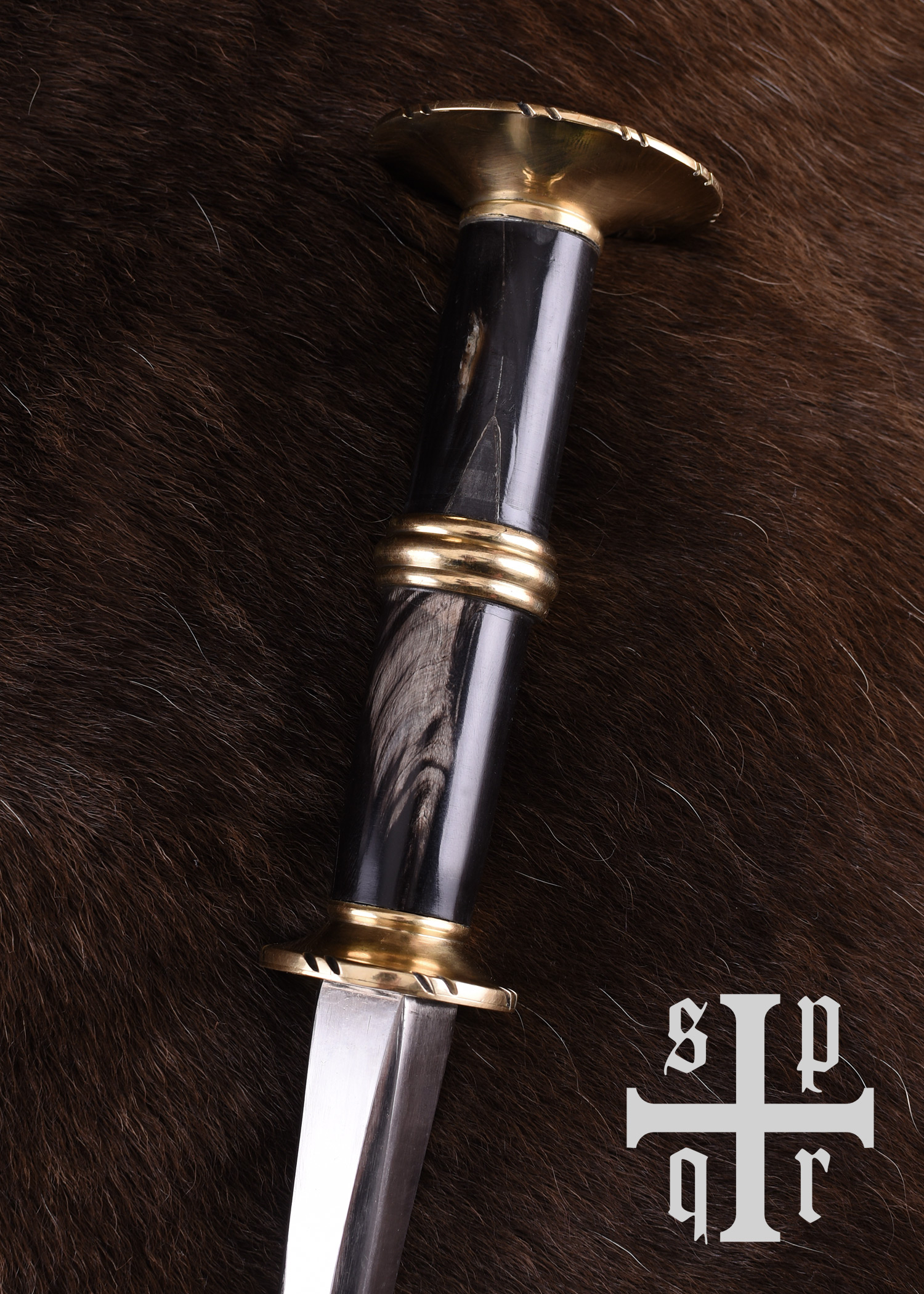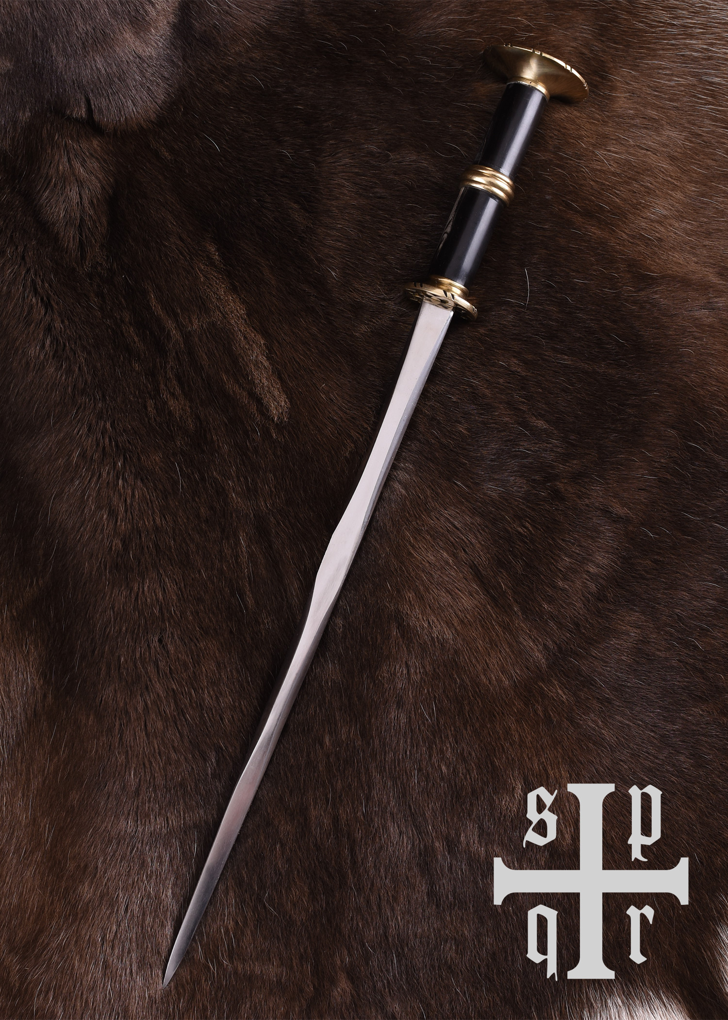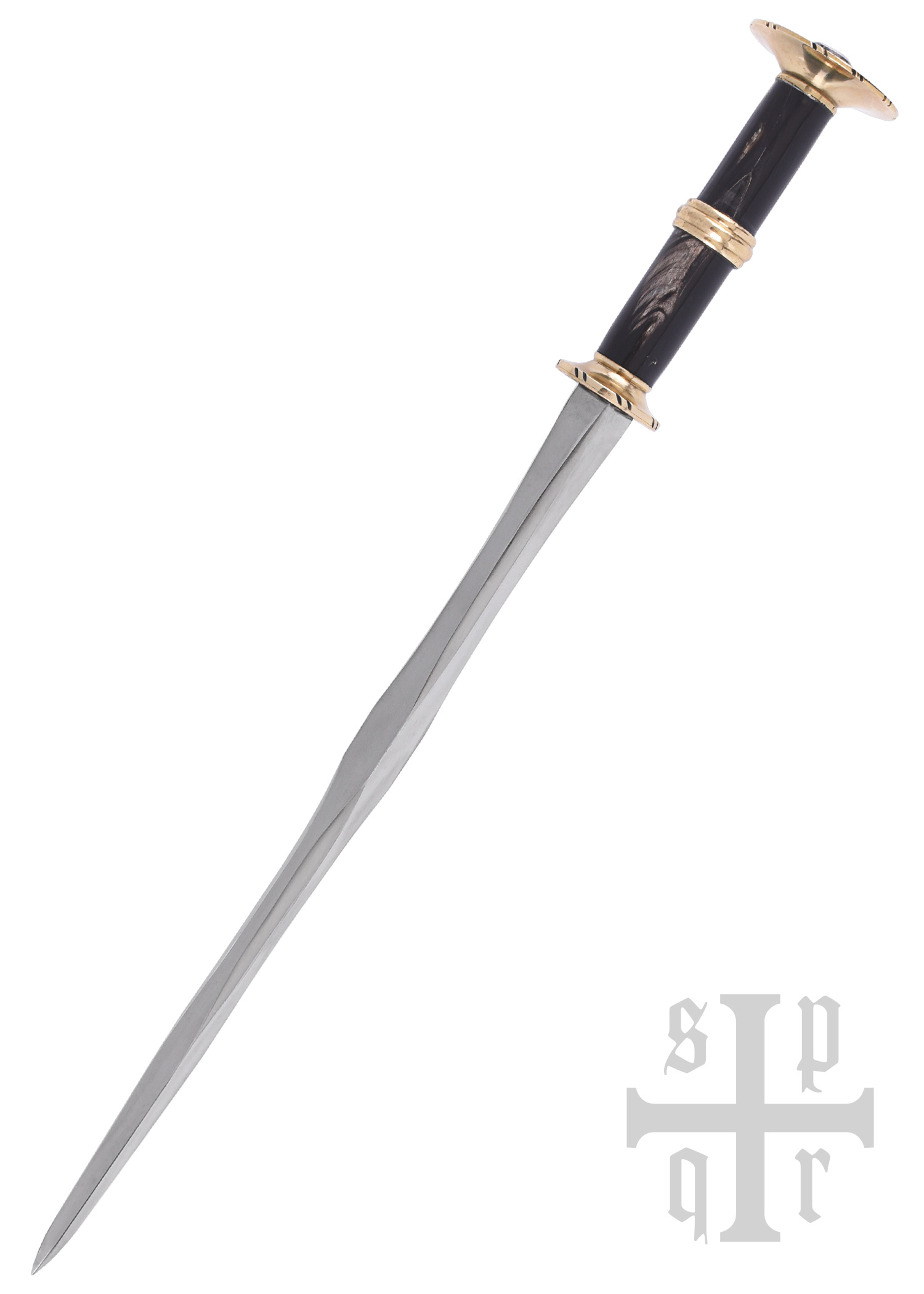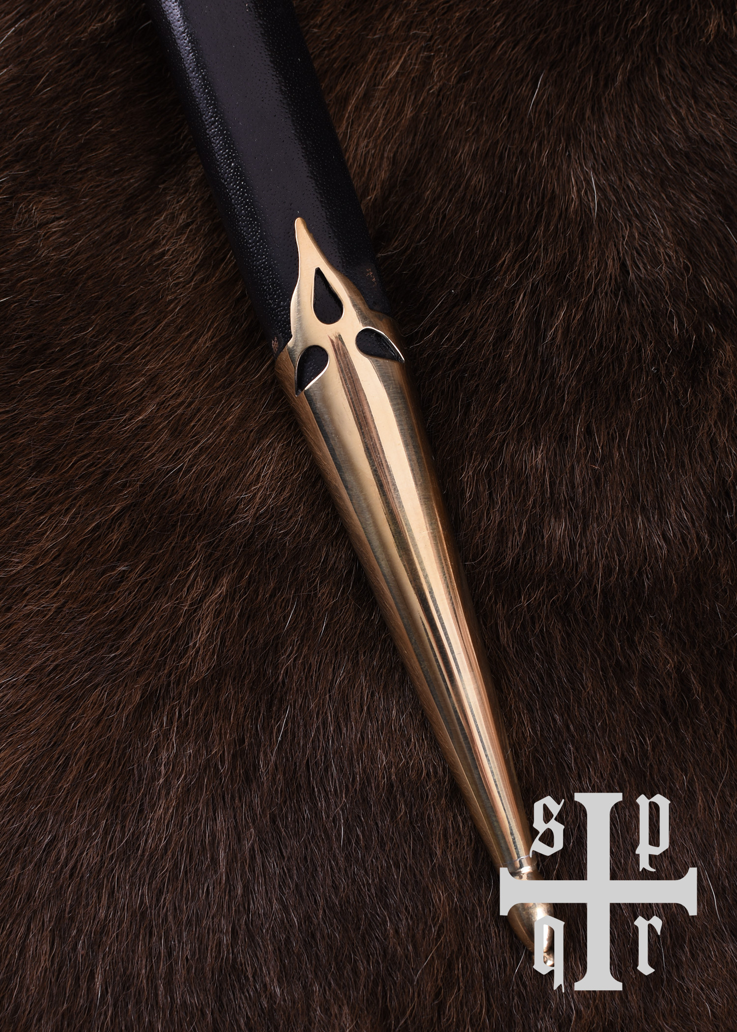 Diese wunderschöne Reproduktion besitzt eine kräftige Stahlklinge mit viereckigem Querschnitt, abgerundeten, stellenweise konkaven Kanten und spitzem Ort. Die stilechten, tellerförmigen Scheiben am Parier und Knauf sowie der Mittelring am Griff sind aus Messing und das Griffstück aus Horn gefertigt.