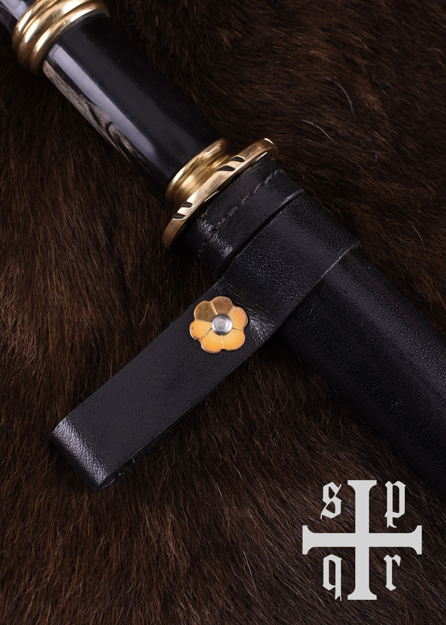- Scheide aus vegetabil gegerbtem Leder mit Ortblech aus Messing und Gürtelschlaufe