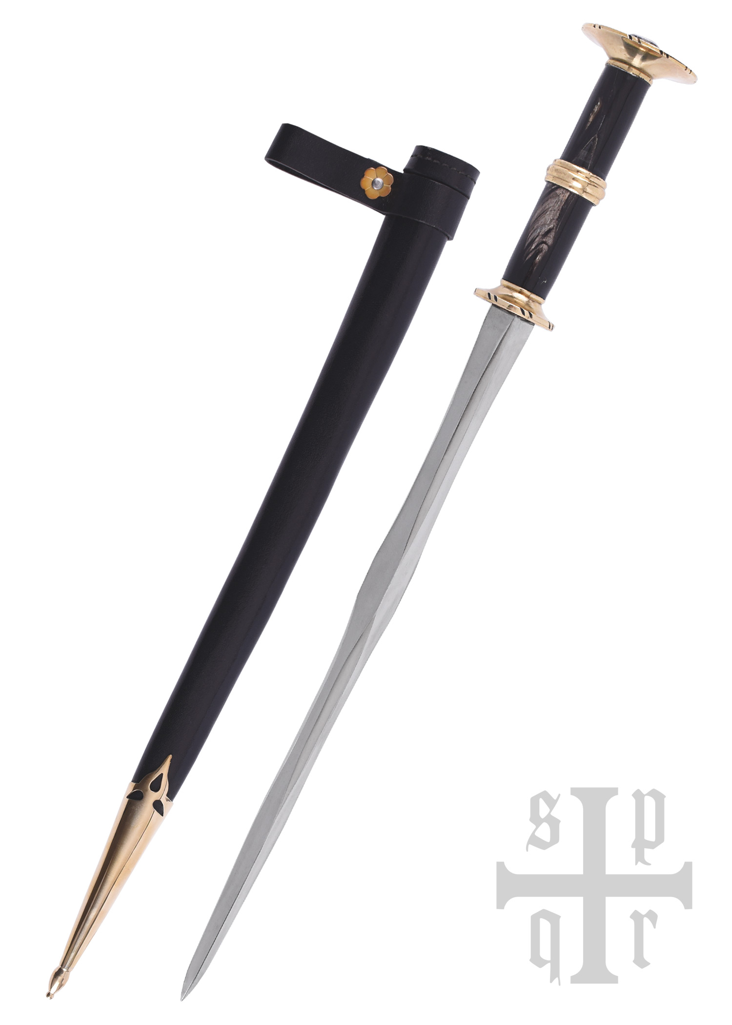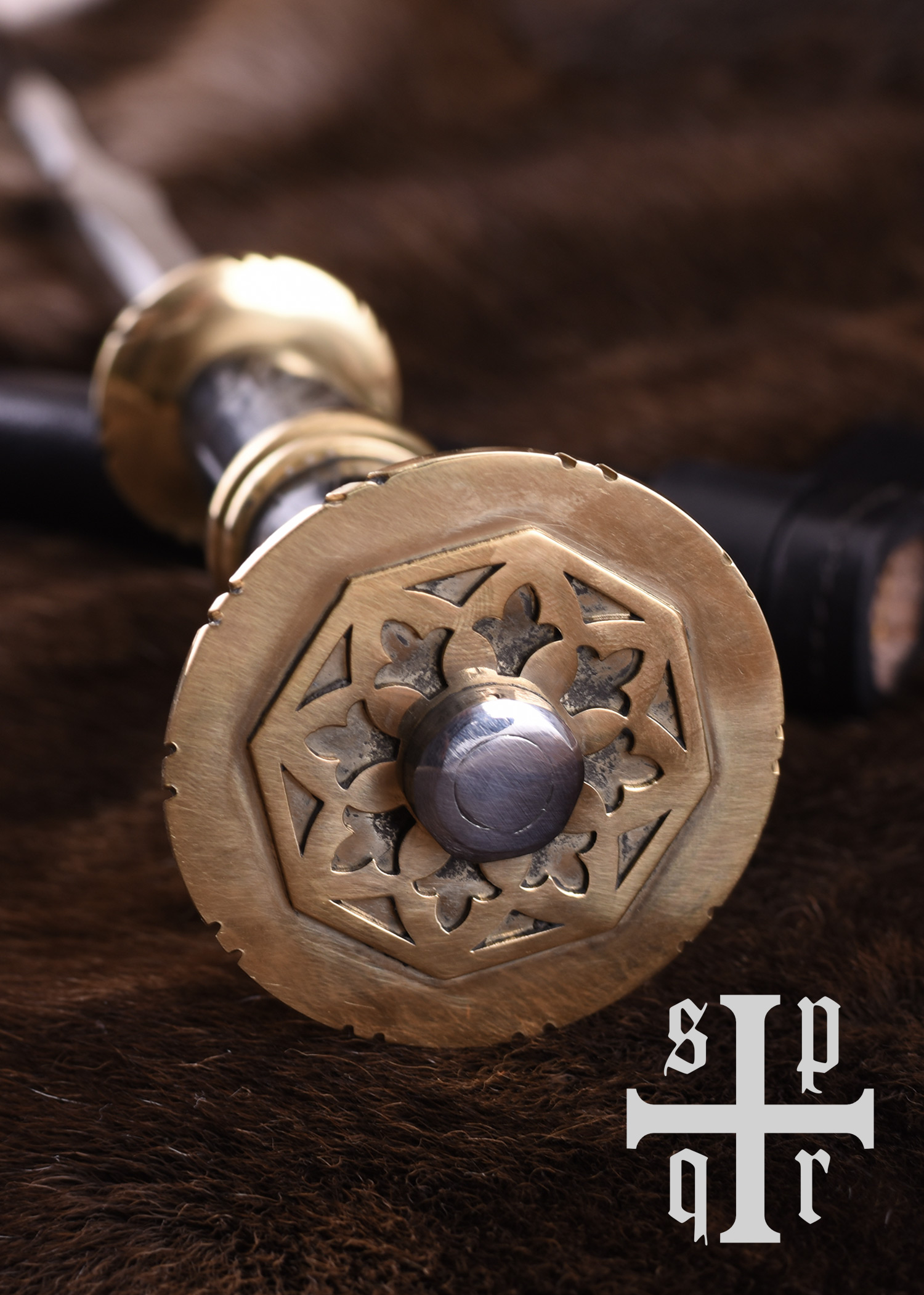 Als Vorbild für die Gestaltung dieser schönen spätmittelalterlichen Blankwaffe dienten originale Scheibenknaufdolche aus Deutschland, die dem späten 14. bzw. frühen 15. Jh. zugeordnet sind. Diese Nahkampfwaffe wird aufgrund ihres tellerartigen Parierelements sowie ihres flachen, ebenfalls scheibenförmigen Knaufs als Scheibendolch (engl. rondel dagger oder roundel dagger) bezeichnet. Dieser besondere Dolchtyp erfreute sich nicht nur im späten Mittelalter, sondern auch bis in die Renaissance hinein großer Beliebtheit bei allen sozialen Schichten und wurde - in verschiedenen Formen - vom einfachen Bauer und Händler bis hin zum Landsknecht oder schwer bepanzerten Ritter verwendet.