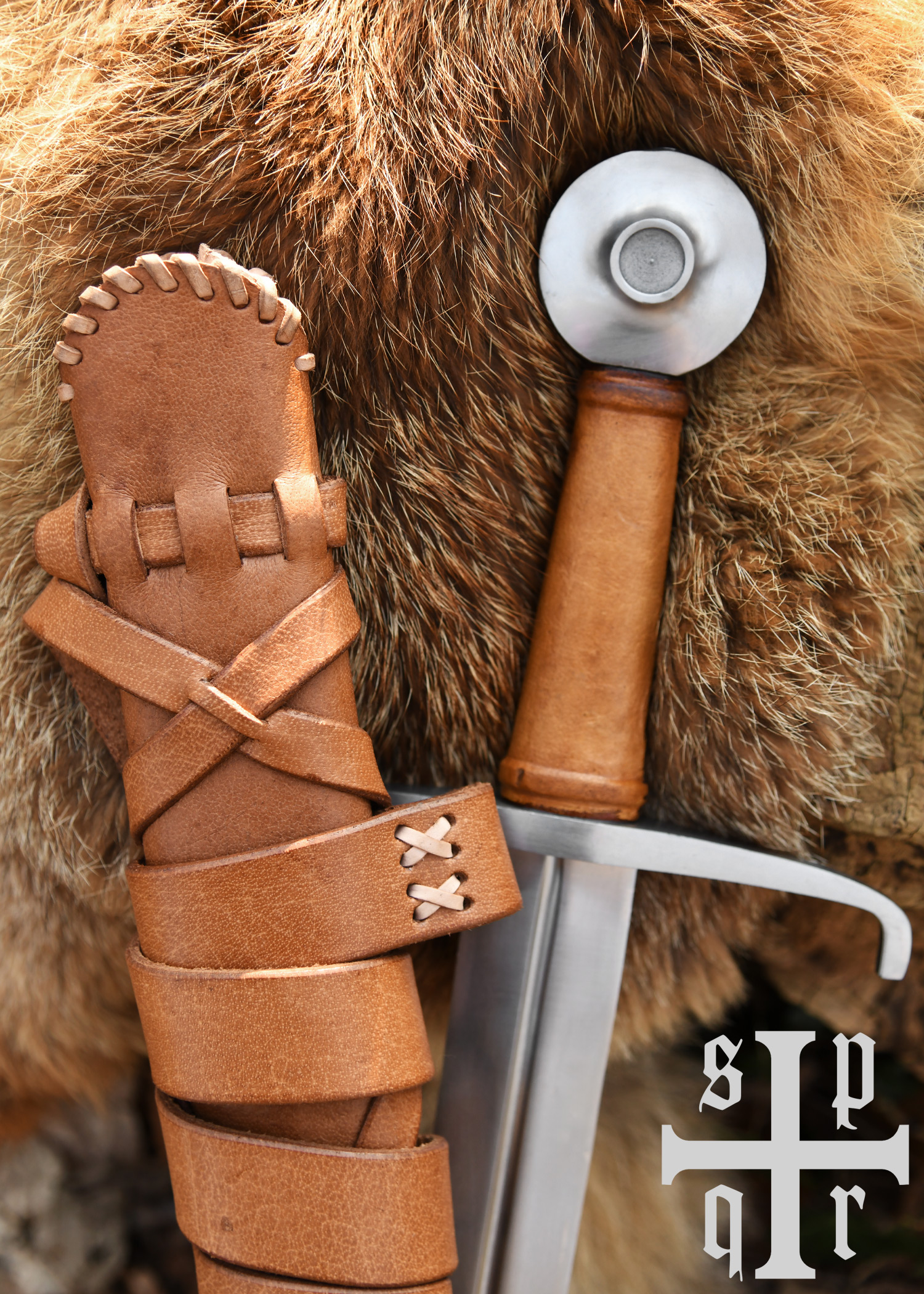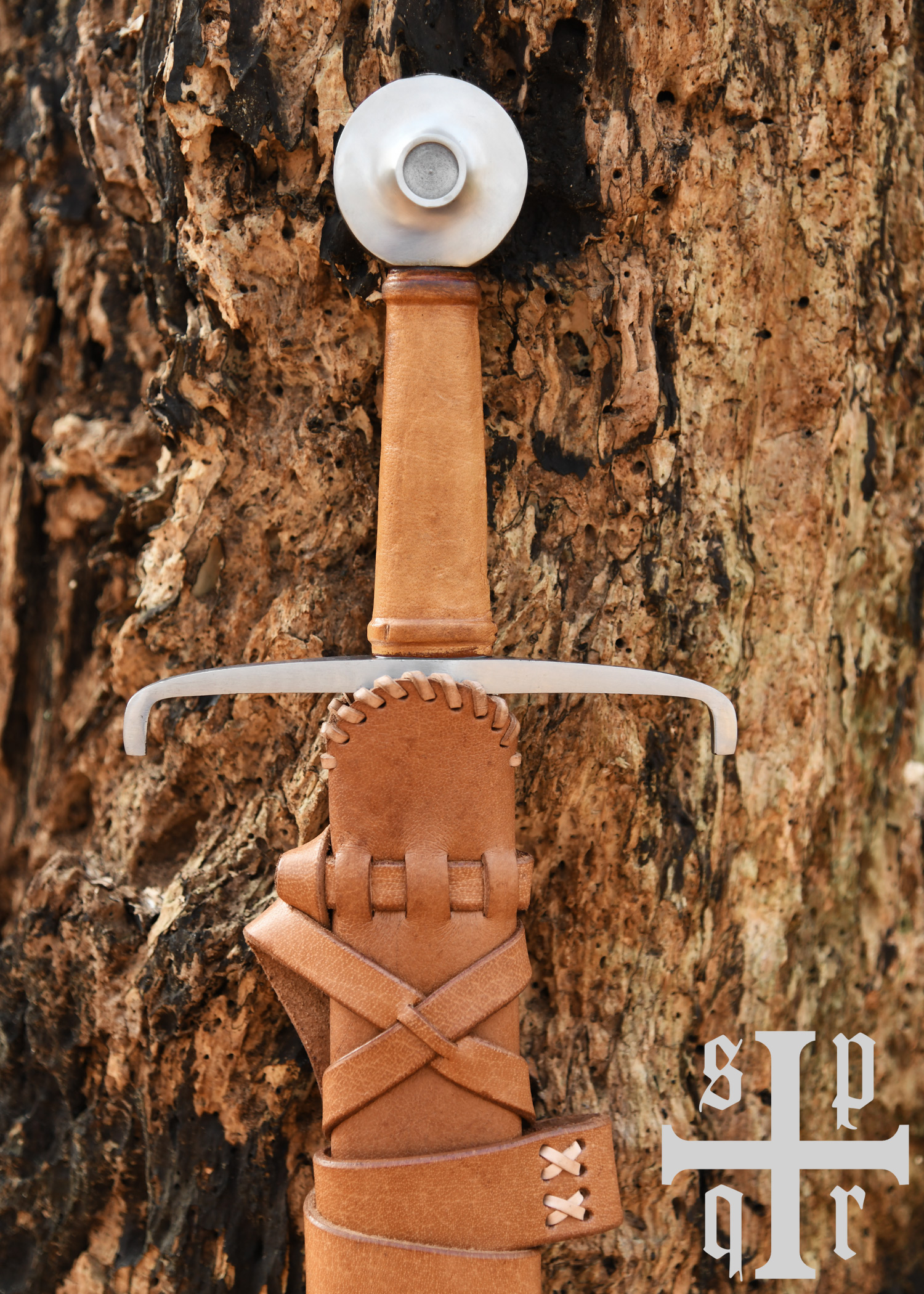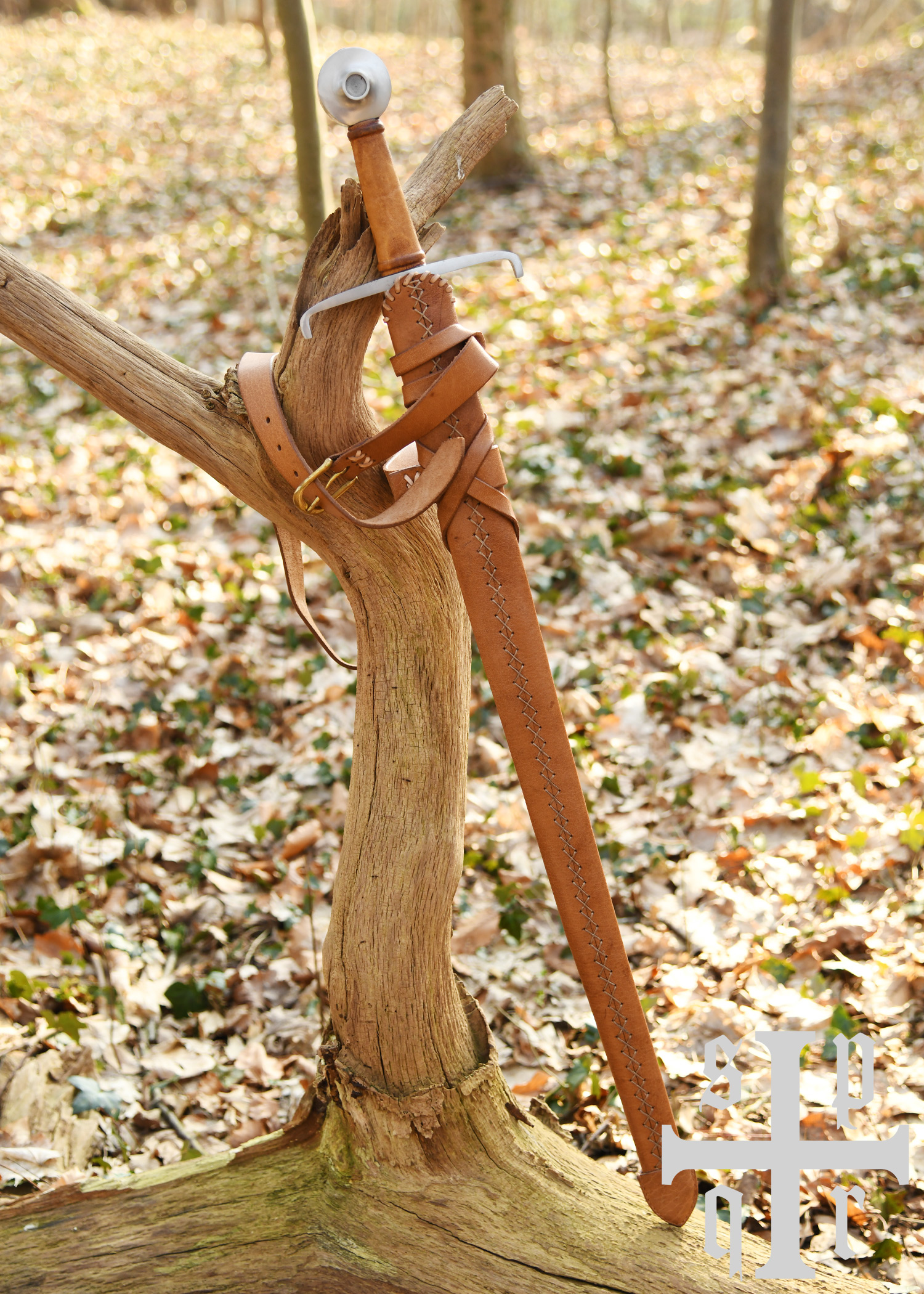 Diese Replik besitzt eine gehärtete, auf ca. 48 HRC angelassene Federstahlklinge, die bis zum Knauf durchgeschmiedet und dort am Griffende vernietet ist. Die Parierstange aus Stahl hat abgebogene Enden und der mit Leder bezogene Holzgriff schließt mit einem stabilen Scheibenknauf aus Stahl ab. Die wunderschöne Schwertscheide ist aus vegetabil gegerbtem, gefärbtem Leder gefertigt und wurde abschließend mit einem Tragegurt ausgestattet, der um die Scheide gewickelt ist.