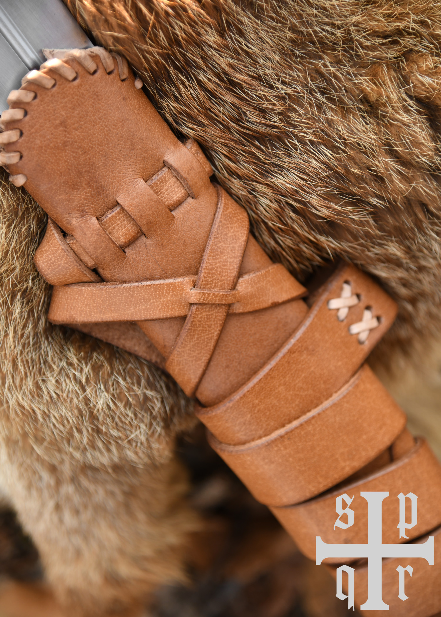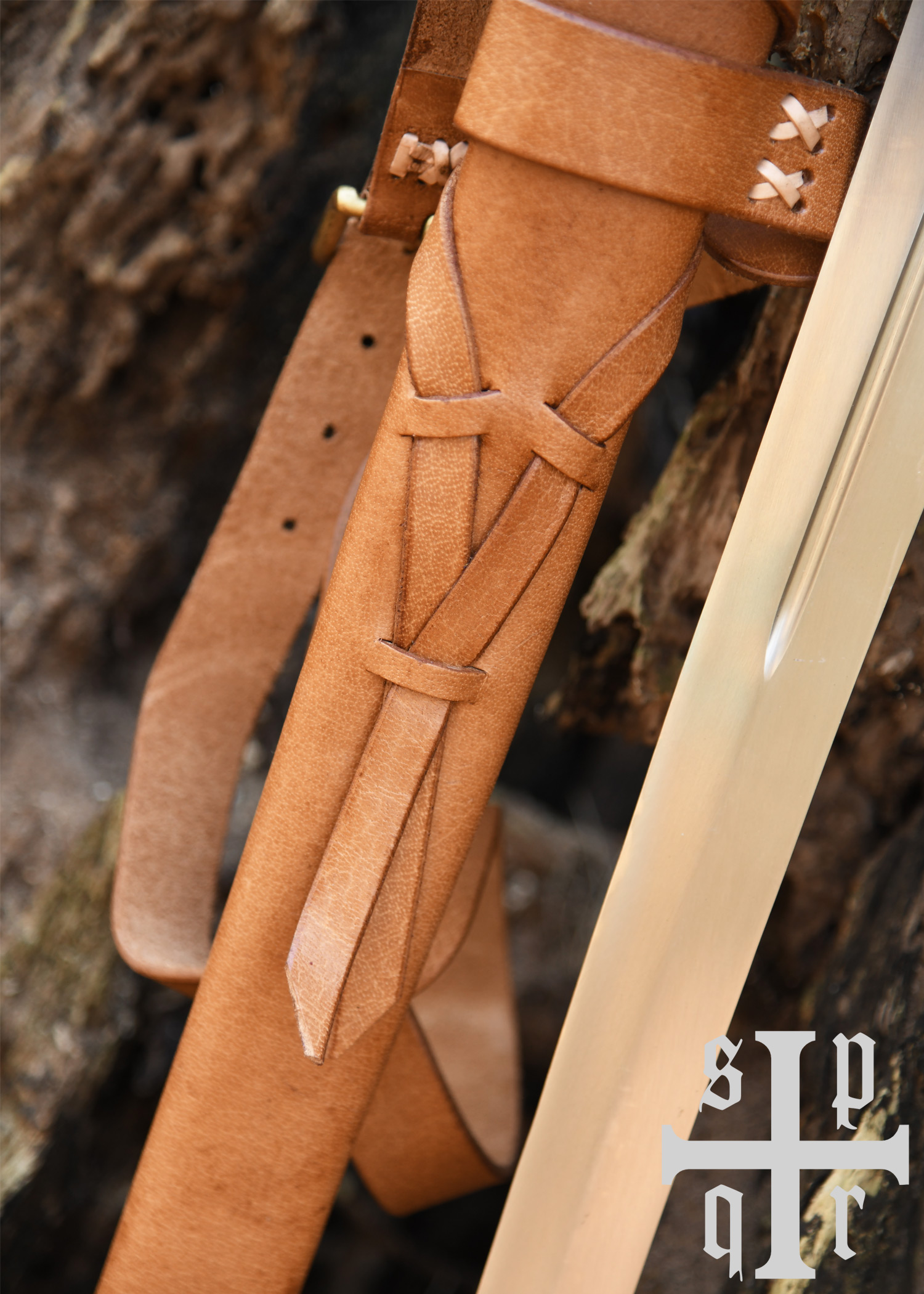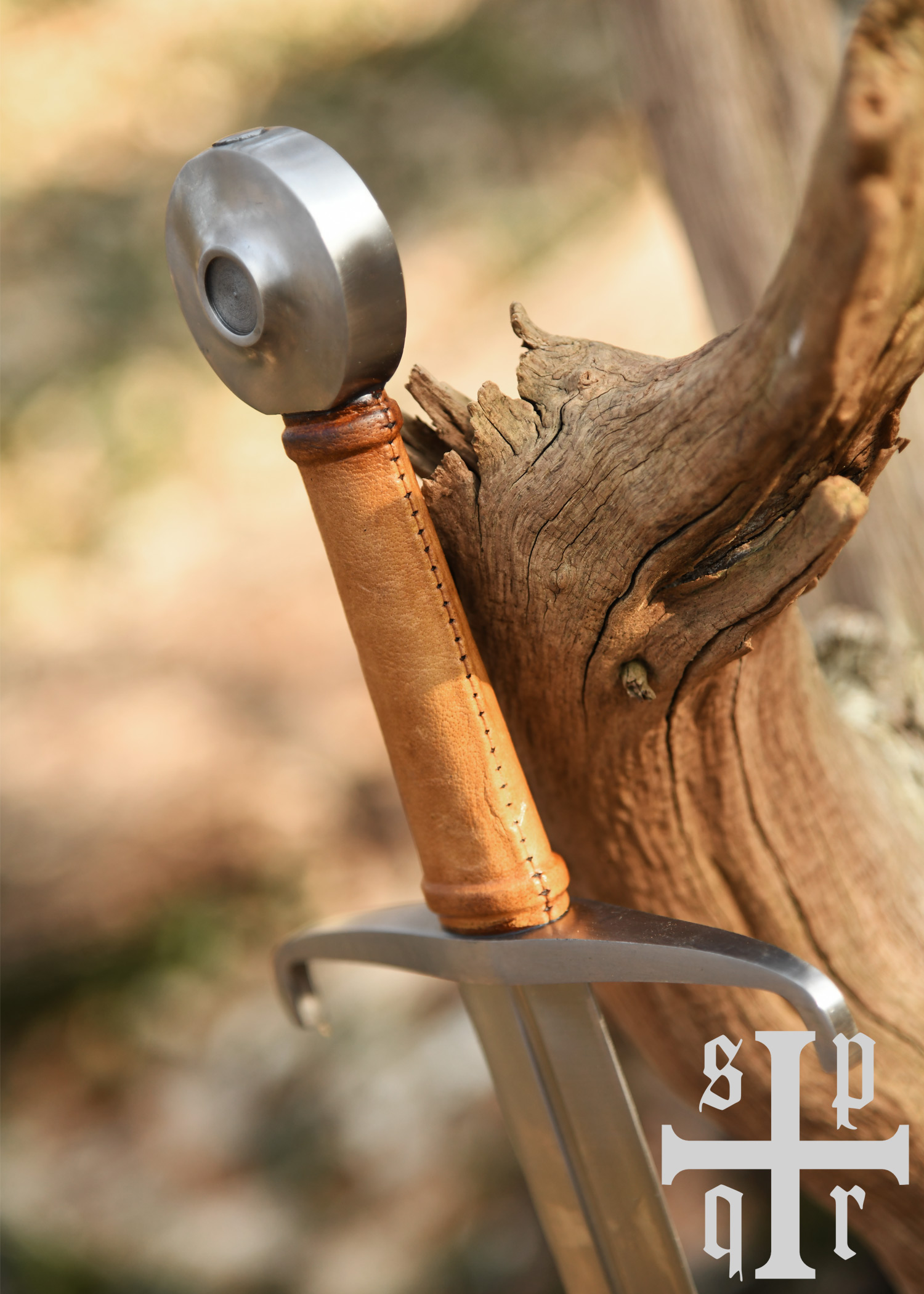 Diese Replik besitzt eine gehärtete, auf ca. 48 HRC angelassene Federstahlklinge, die bis zum Knauf durchgeschmiedet und dort am Griffende vernietet ist. Die Parierstange aus Stahl hat abgebogene Enden und der mit Leder bezogene Holzgriff schließt mit einem stabilen Scheibenknauf aus Stahl ab. Die wunderschöne Schwertscheide ist aus vegetabil gegerbtem, gefärbtem Leder gefertigt und wurde abschließend mit einem Tragegurt ausgestattet, der um die Scheide gewickelt ist.