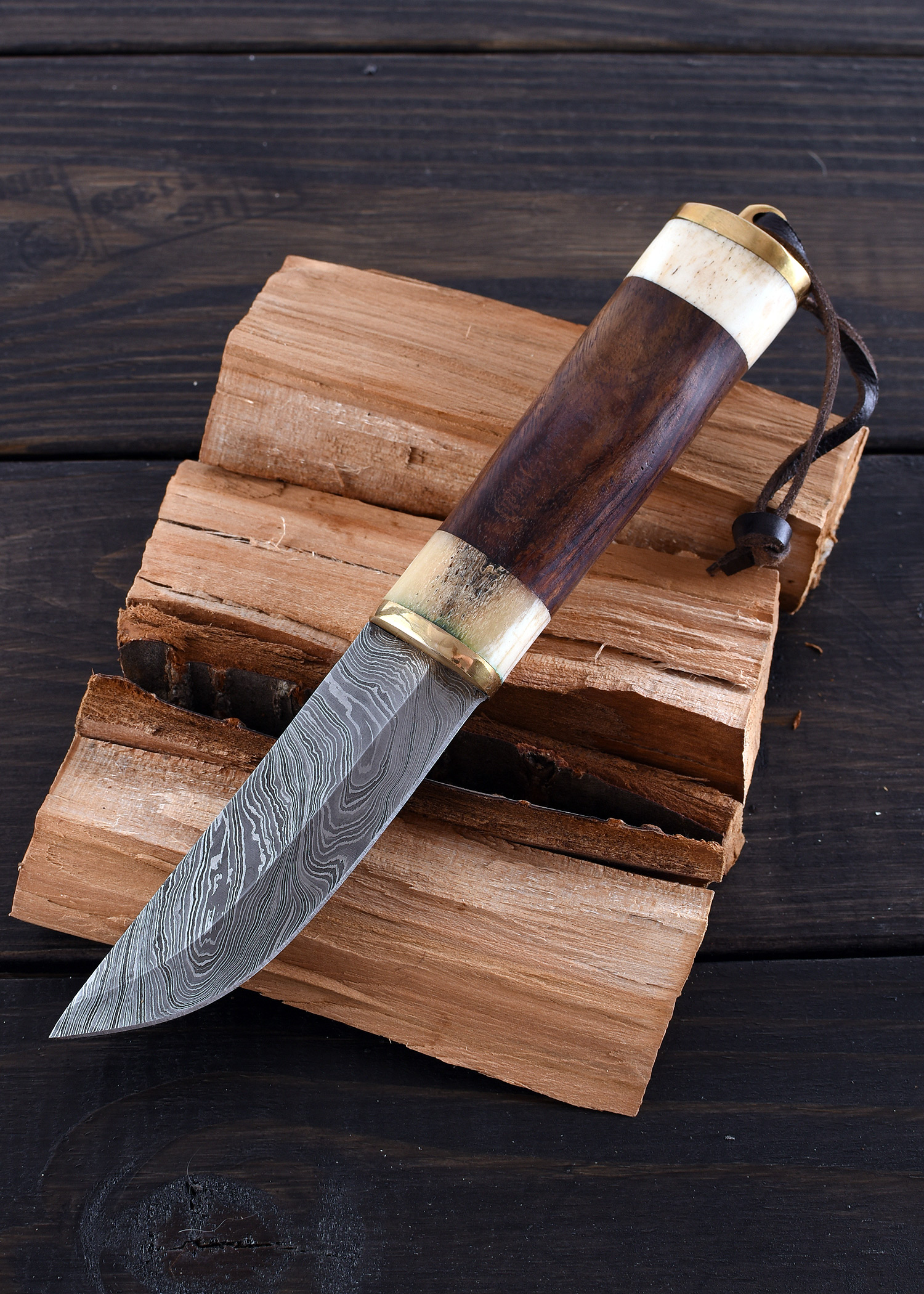 Gebrauchsmesser aus Damaszener Stahl mit Knochen-/Holzgriff und Lederscheide