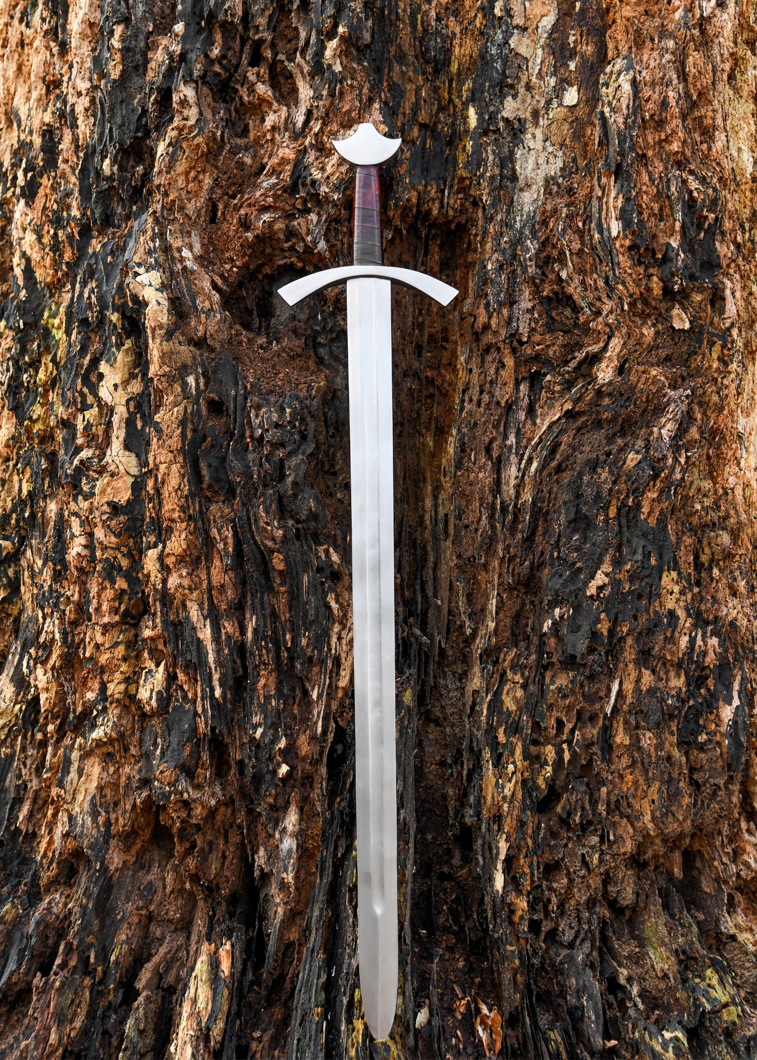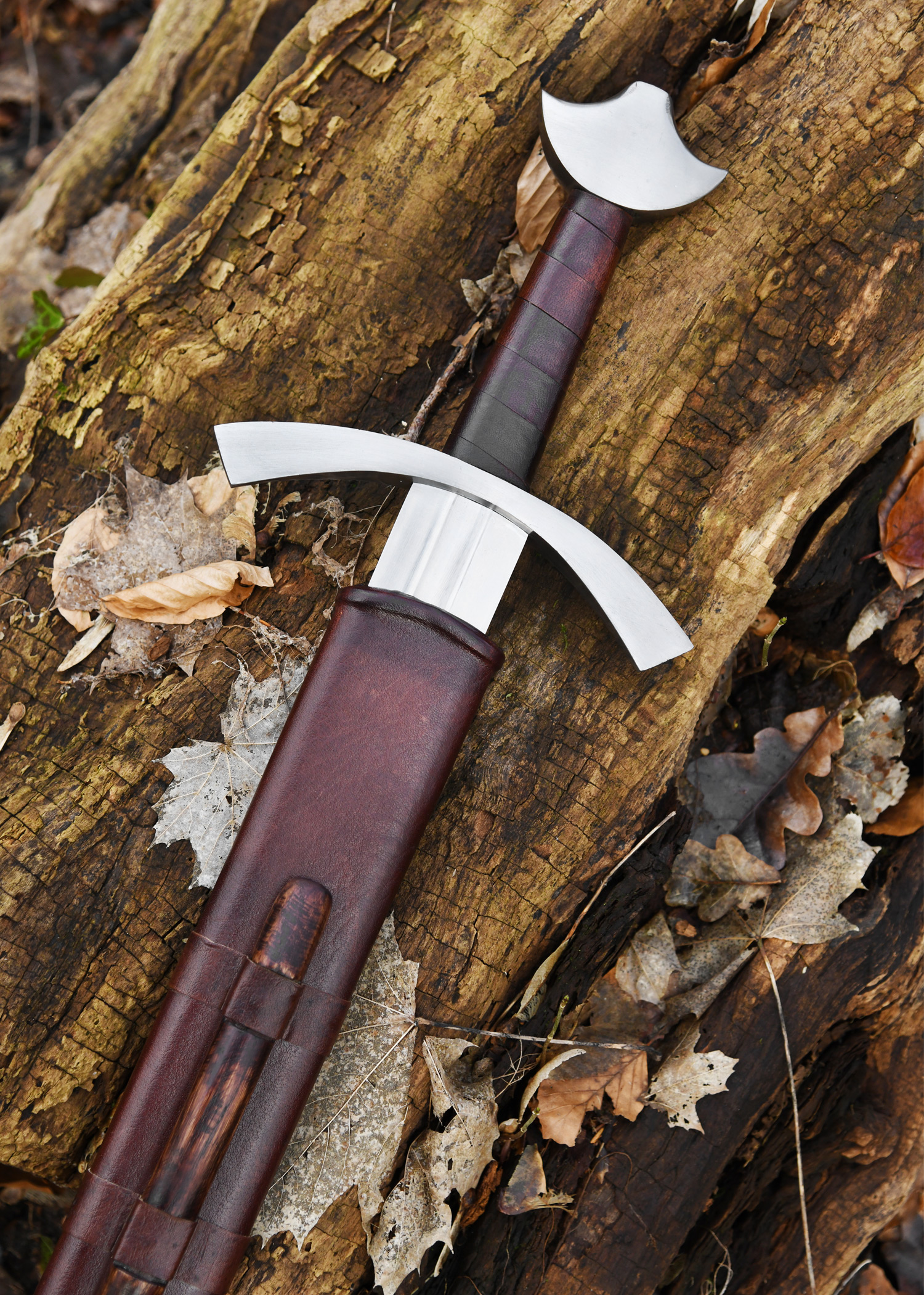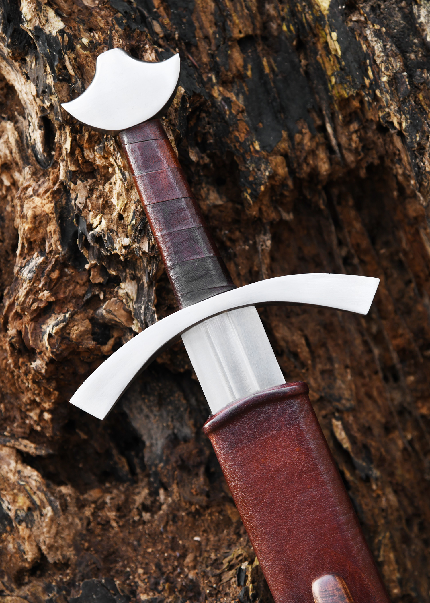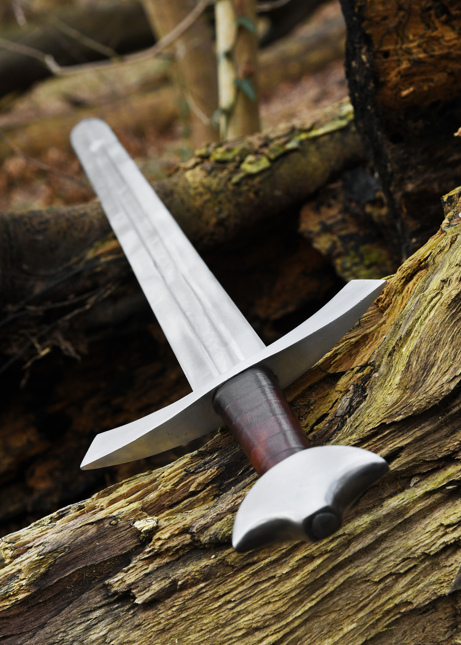 Schaukampftaugliche Nachbildung eines hochmittelalterlichen, ritterlichen Einhandschwertes. Das besondere dieses Schwertes ist der Knauf, welcher eine Formvariation des Paranussknaufes ist und von Oakshott ins 13. Jahrhundert angesiedelt wird.