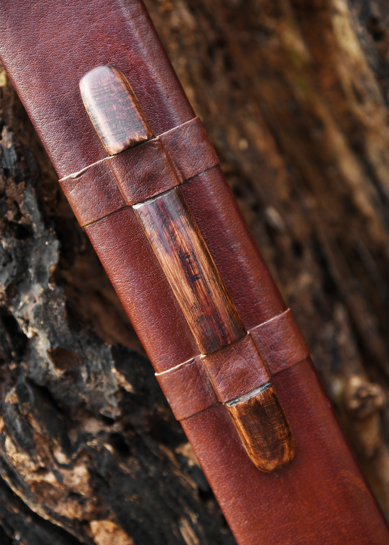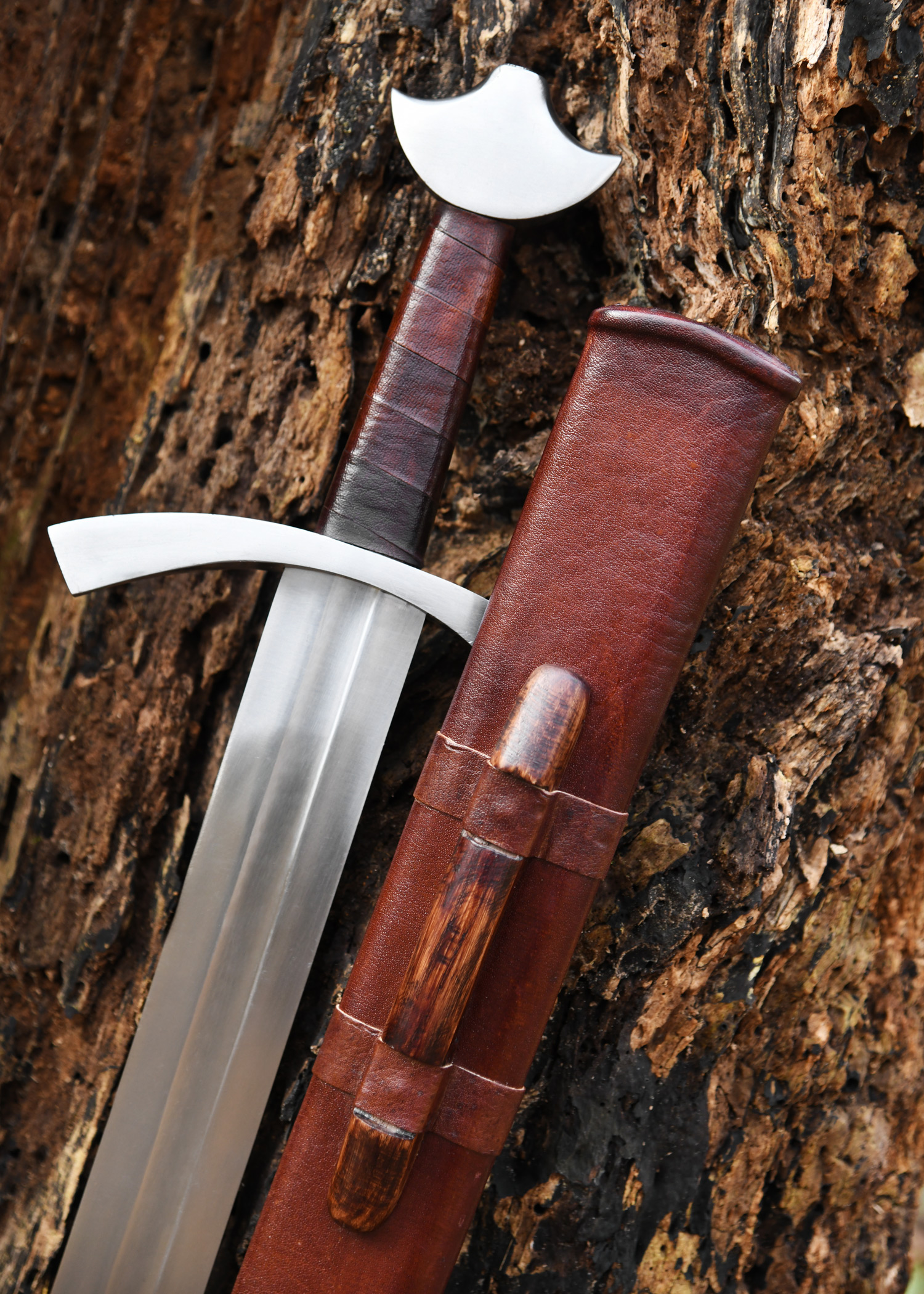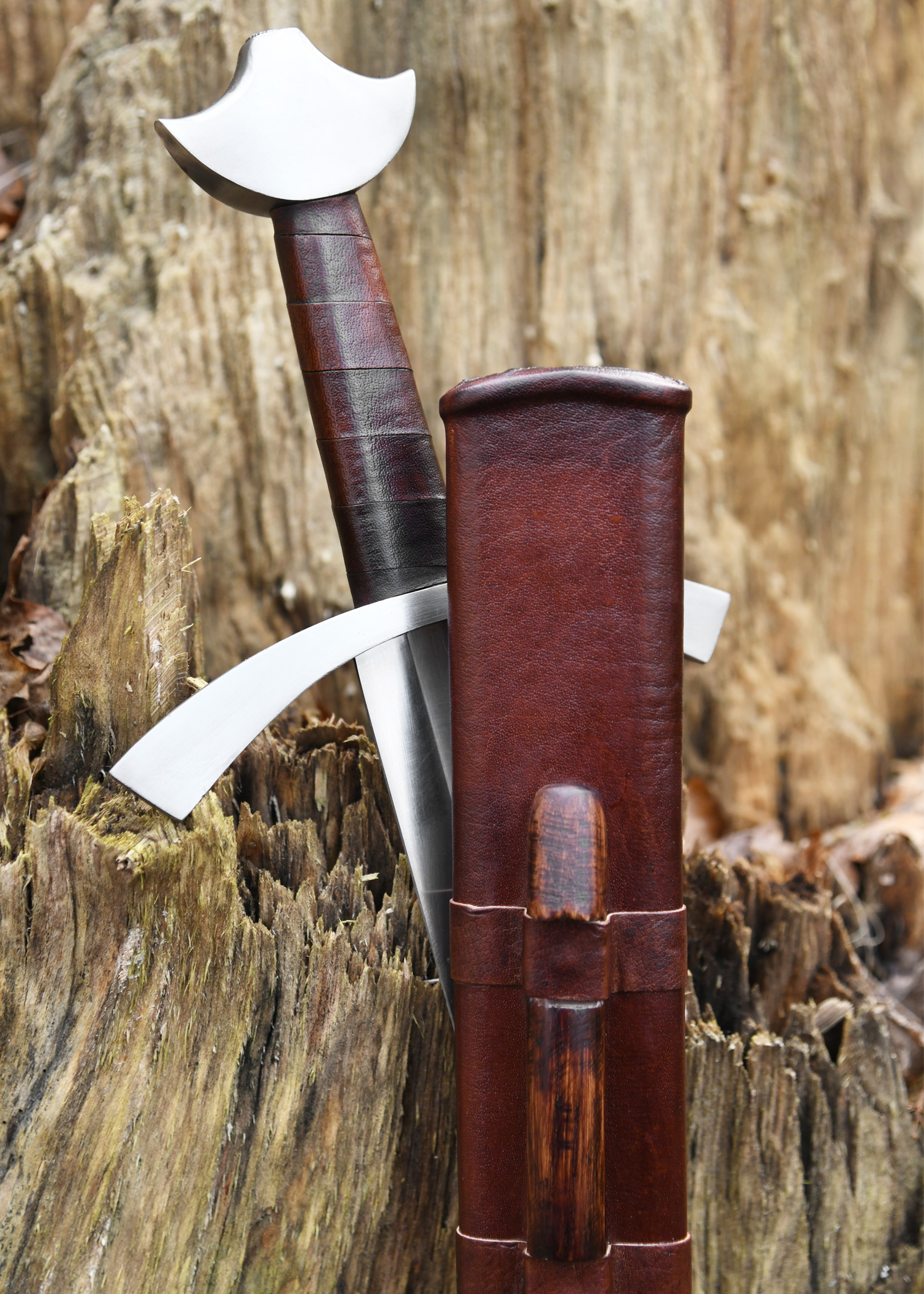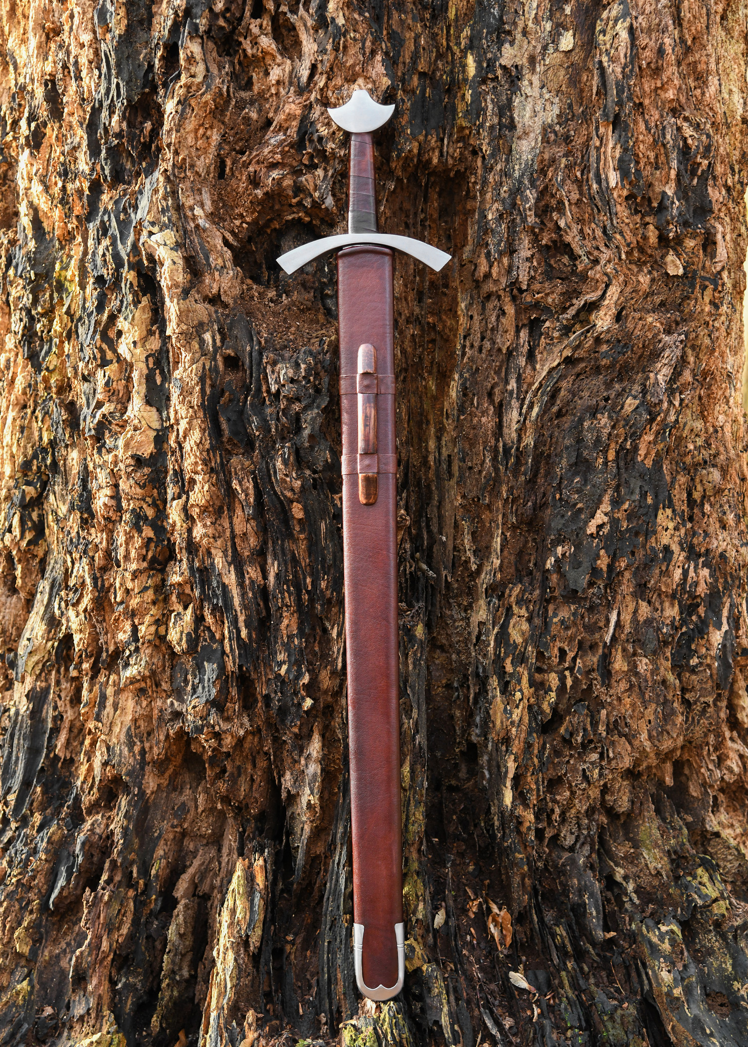 Das Schwert kommt mit einer sehr schönen Holz-Lederscheide mit Holzbügel als Gürtelschlaufe (für max. 5 cm breite Gürtel). Die Scheide besitzt zudem ein Ortblech aus Stahl.
