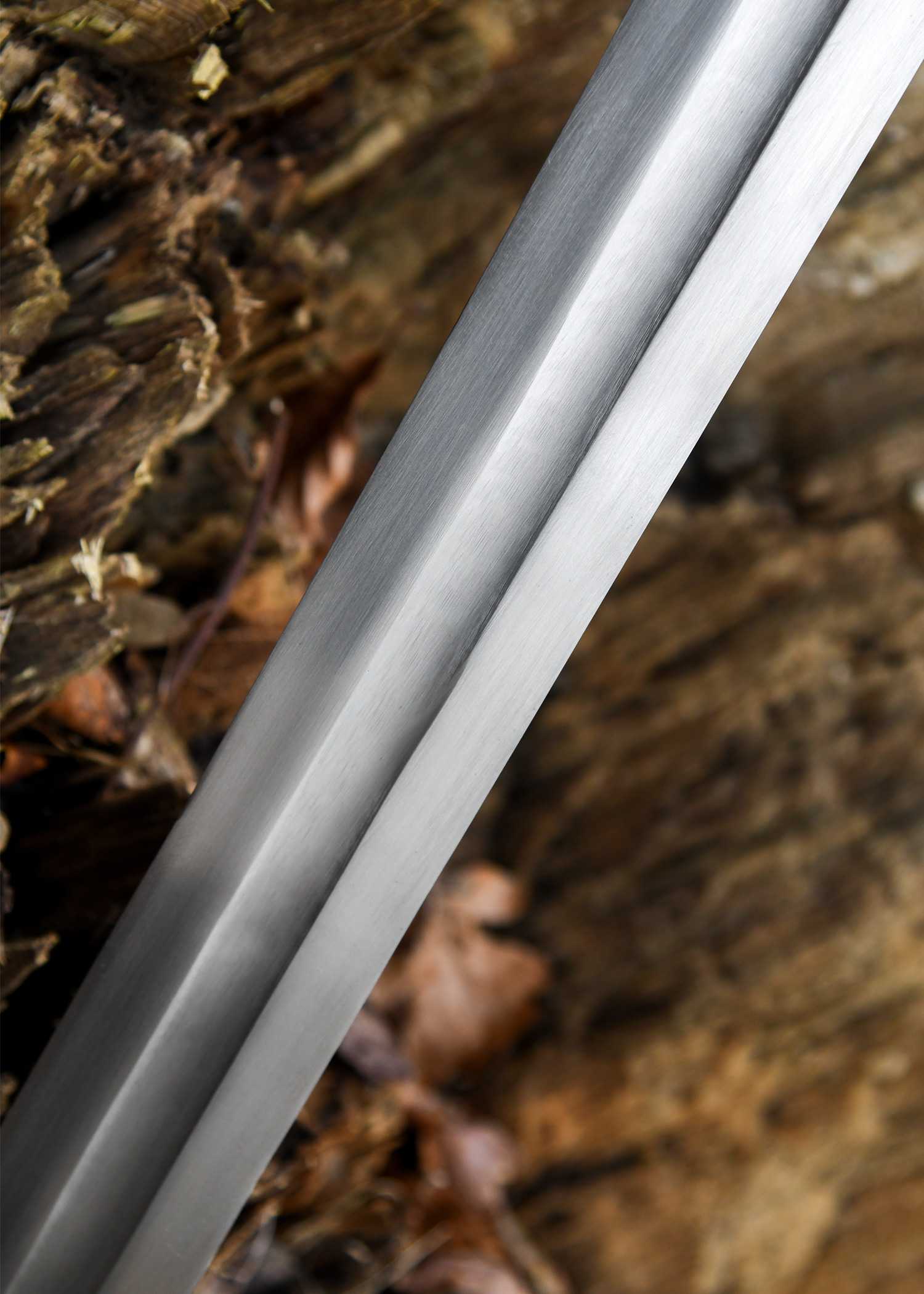 Dieses Schwert ist ausschließlich in Handarbeit gefertigt. Die nach vorn gebogene Parierstange und der Paranussknauf sind aus wärmebehandeltem, schmiedbarem Gusseisen. Die in Öl auf ca. 48 HRC gehärtete Federstahlklinge geht bis zum Knauf durch und ist dort handvernietet. Der Griff ist mit Lederband umwickelt. Die Klinge verfügt über eine ausgeprägte Hohlkehle, welche dem Schwert große Elastizität und zugleich Leichtigkeit verleiht. Die Klingenspitze und die Schneiden sind stumpf und abgerundet.
