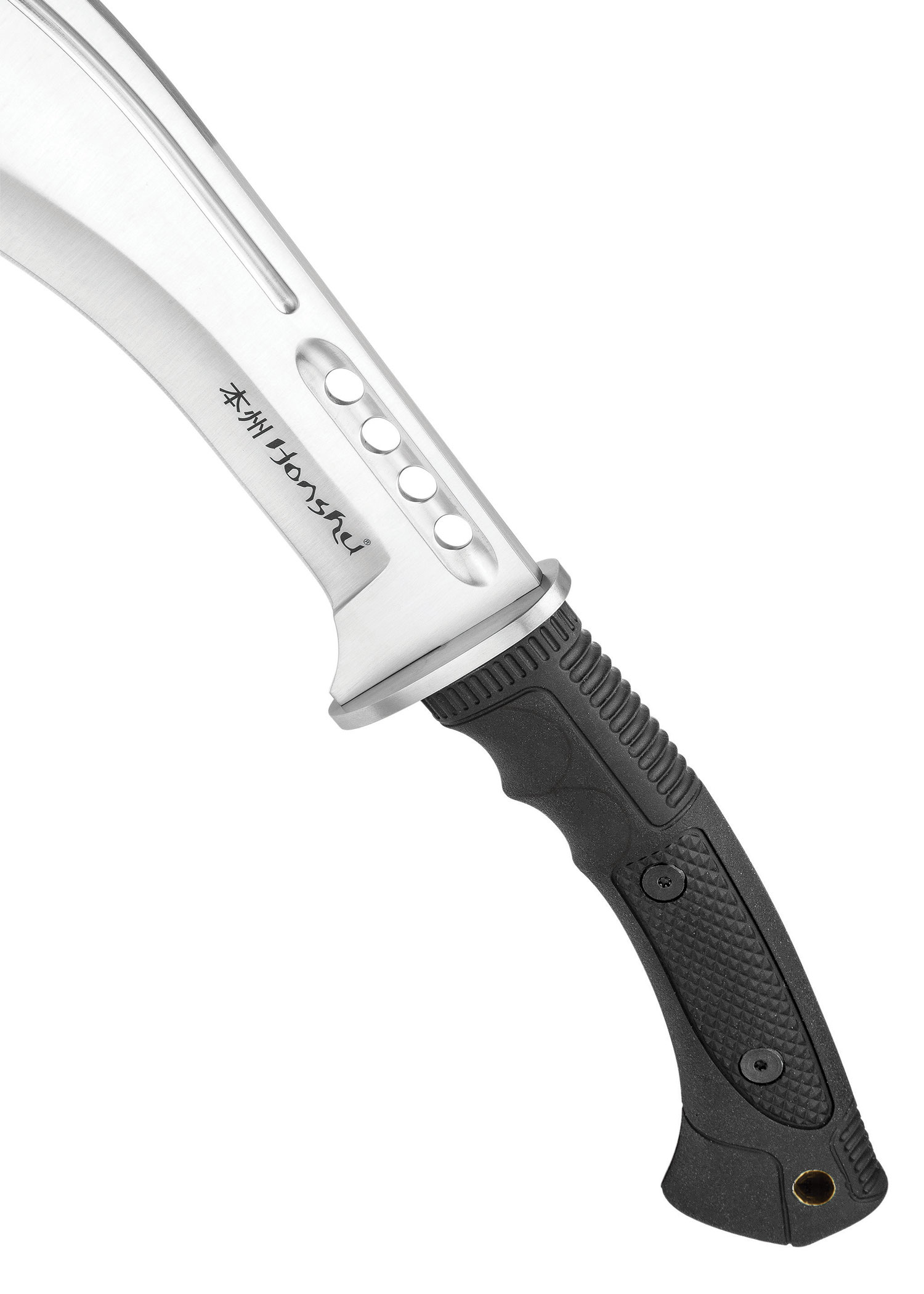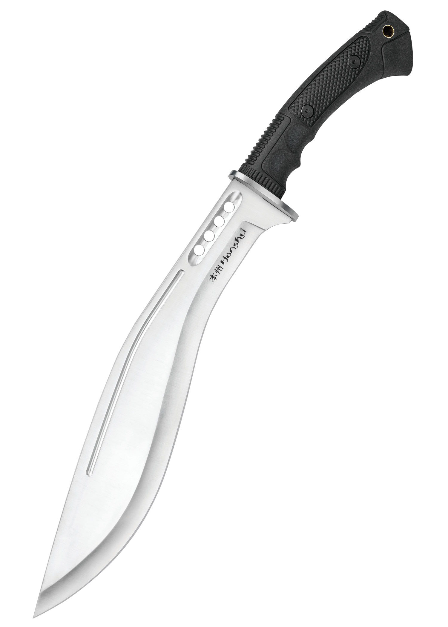 United Cutlery erweitert seine begehrte Honshu-Linie von modernen, taktischen Waffen mit dem beliebten Honshu Boshin Kukri, das nun mit D2 Werkzeugstahl hergestellt wurde. Die ca. 33,3 cm lange, robuste Klinge aus modernem D2-Werkzeugstahl hat eine massive Vollerl-Konstruktion mit Aussparungen und einer Blutrinne. Der Griff aus modernstem TPR ist robust und wasserfest, mit ergonomischen Konturen und Texturen, die für rutschfreien Halt sorgen. Das taktische Kukri hat eine Gesamtlänge von ca. 49,8 cm und wird in einer hochwertigen, verstärkten Gürtelscheide aus Echtleder geliefert.
