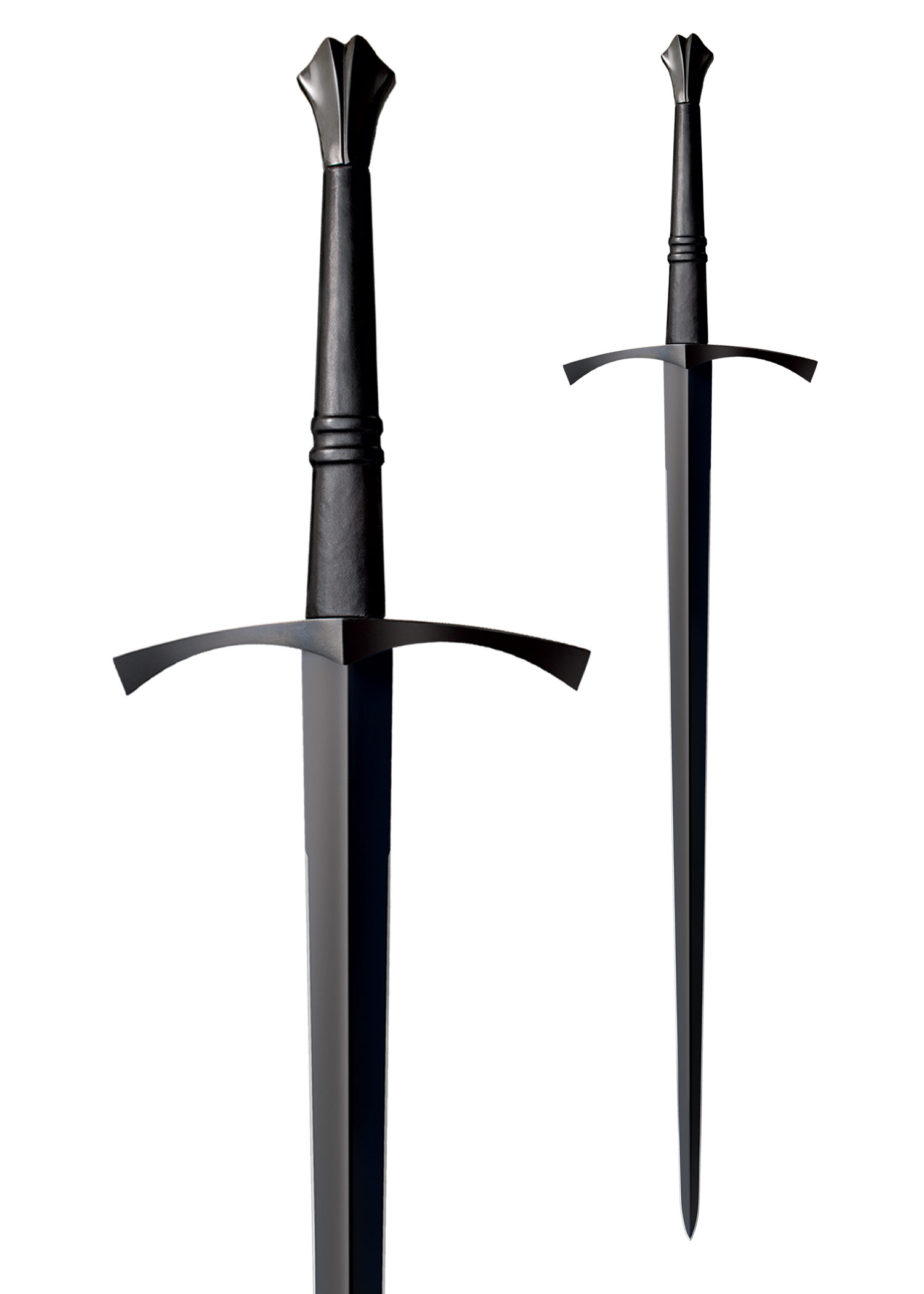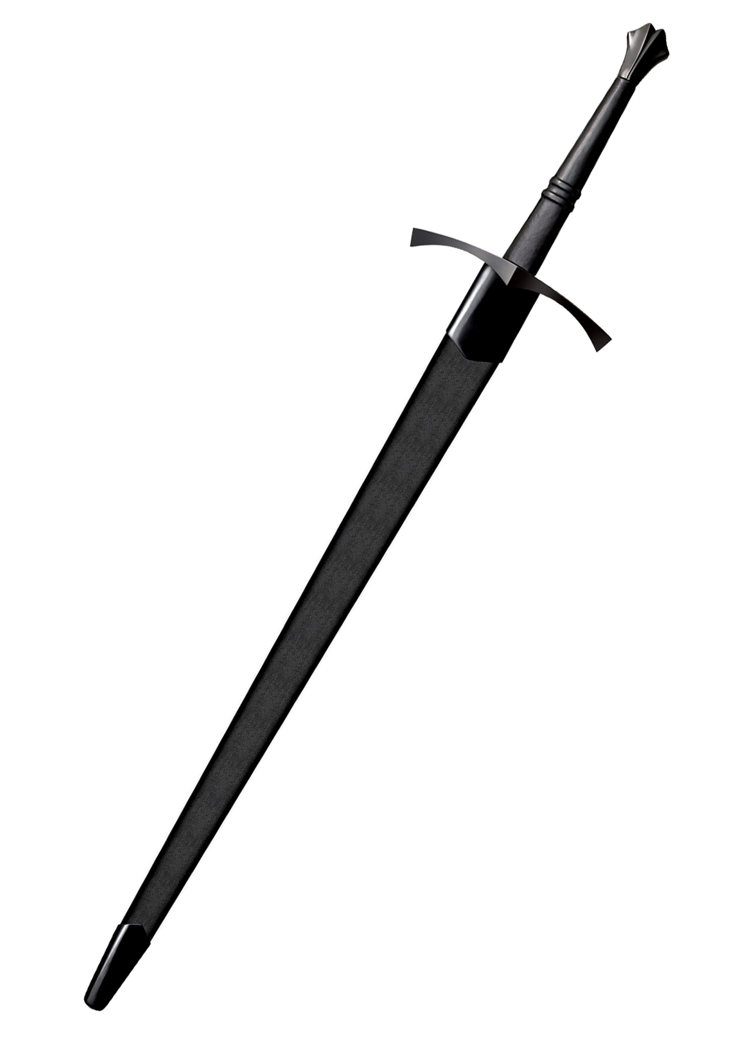 Die Ära des Langschwertes umfasste fast drei Jahrhunderte (von ca. 1350 bis 1650) und dies zweifelsohne, weil es ausgezeichnete Arbeit leistete! Dieses Schwert besaß ein charakteristisches Kreuzgefäß, eine lange zweischneidige Klinge und war gleichermaßen dazu geeignet, sowohl leicht als auch schwer gepanzerten Widersachern entgegenzutreten. Seine besonders lange Klinge bot die nötige Reichweite und Hebelkraft für kraftvolles Zustechen und Schneiden, während seine lange Parierstange und sein schwerer Knauf als Schlagwaffen eingesetzt werden konnten und auch dazu dienen konnten, sich einzuhaken und den Gegner aus dem Gleichgewicht zu bringen oder seine Waffe zu kontrollieren. Wenn es galt, schwere Plattenrüstung zu durchdringen, waren Hiebe mit der Klinge nahezu wirkungslos und wurden oft zugunsten der sogenannten Halbschwert-Technik unterlassen: Bei dieser Kampfart hielt der Schwertkämpfer den Griff mit einer Hand und umfasste die Klinge mit der anderen, um so die Schwertspitze gezielter zu führen und präziser durch die Lücken und Gelenke der Ritterrüstung zu stechen. Diese Rekonstruktion von Cold Steel® wurde nach Vorbild der italienischen Schwertgestaltung entworfen. Obwohl Klinge und Schwerpunkt eher auf Stoßangriffe ausgelegt sind, sind die Schneidkanten auch erstaunlich effektiv. Außerdem bietet das einfach gestaltete, kreuzförmige Gefäß mit seiner langen, nach unten gebogenen Parierstange und seinem ausgleichenden Fischschwanzknauf alle Möglichkeiten des Schwertkampfes.