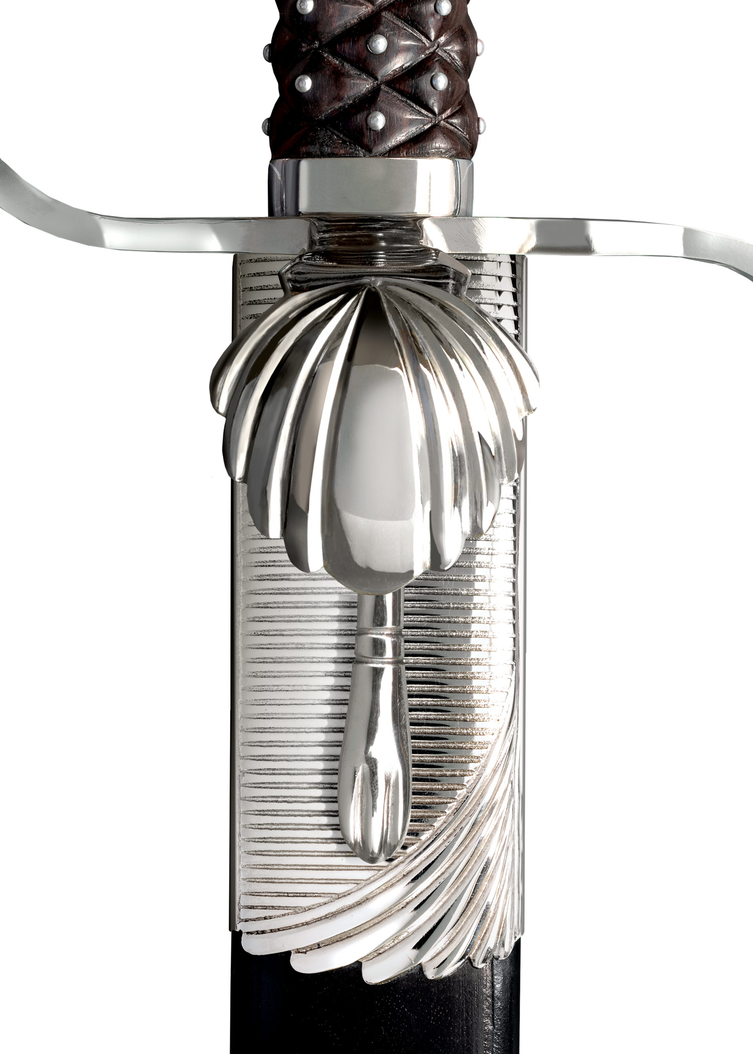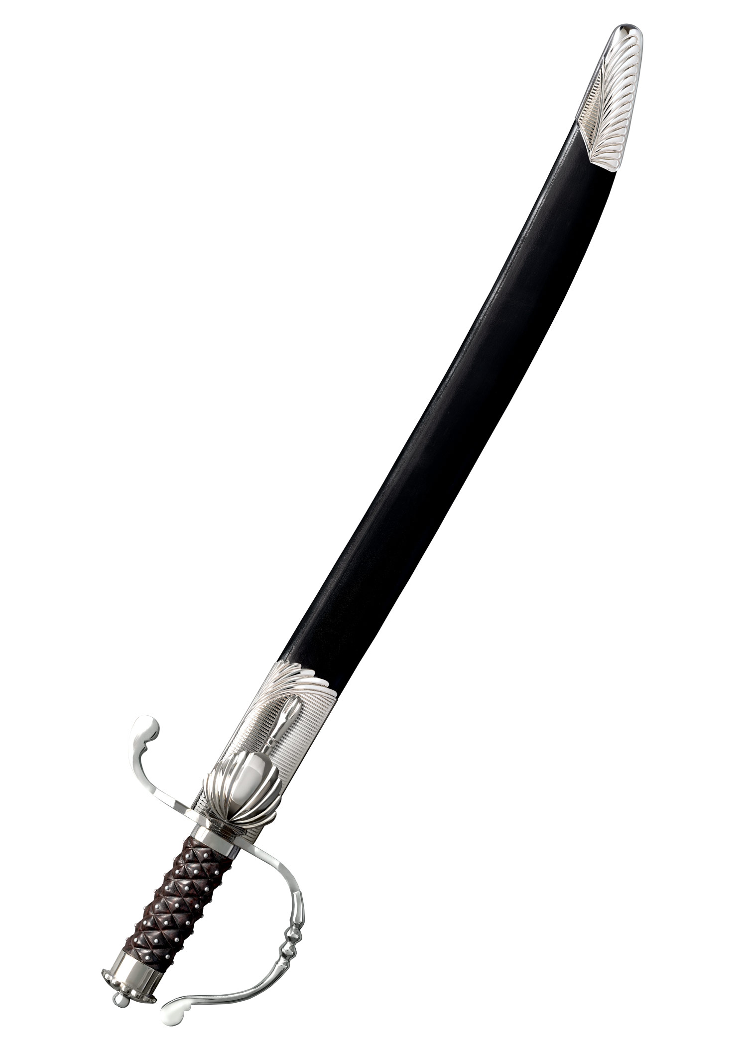 Optisch harmoniert die Scheide aus kräftigem, schwarzem Leder auf wunderschöne Weise mit dem Schwert. Mundblech und Ortband sind aus Neusilber und wurden mit Zierprägungen verschönert.