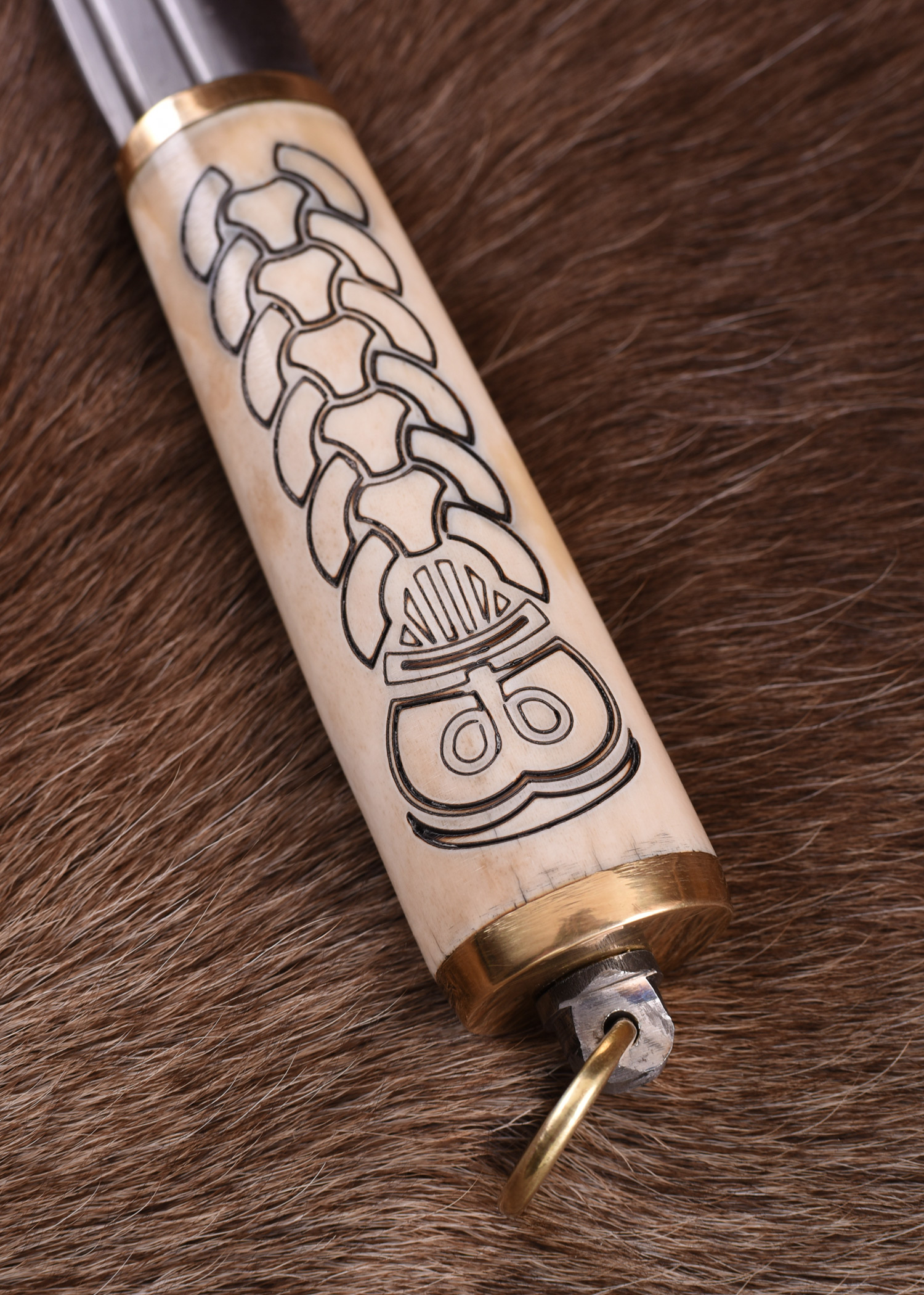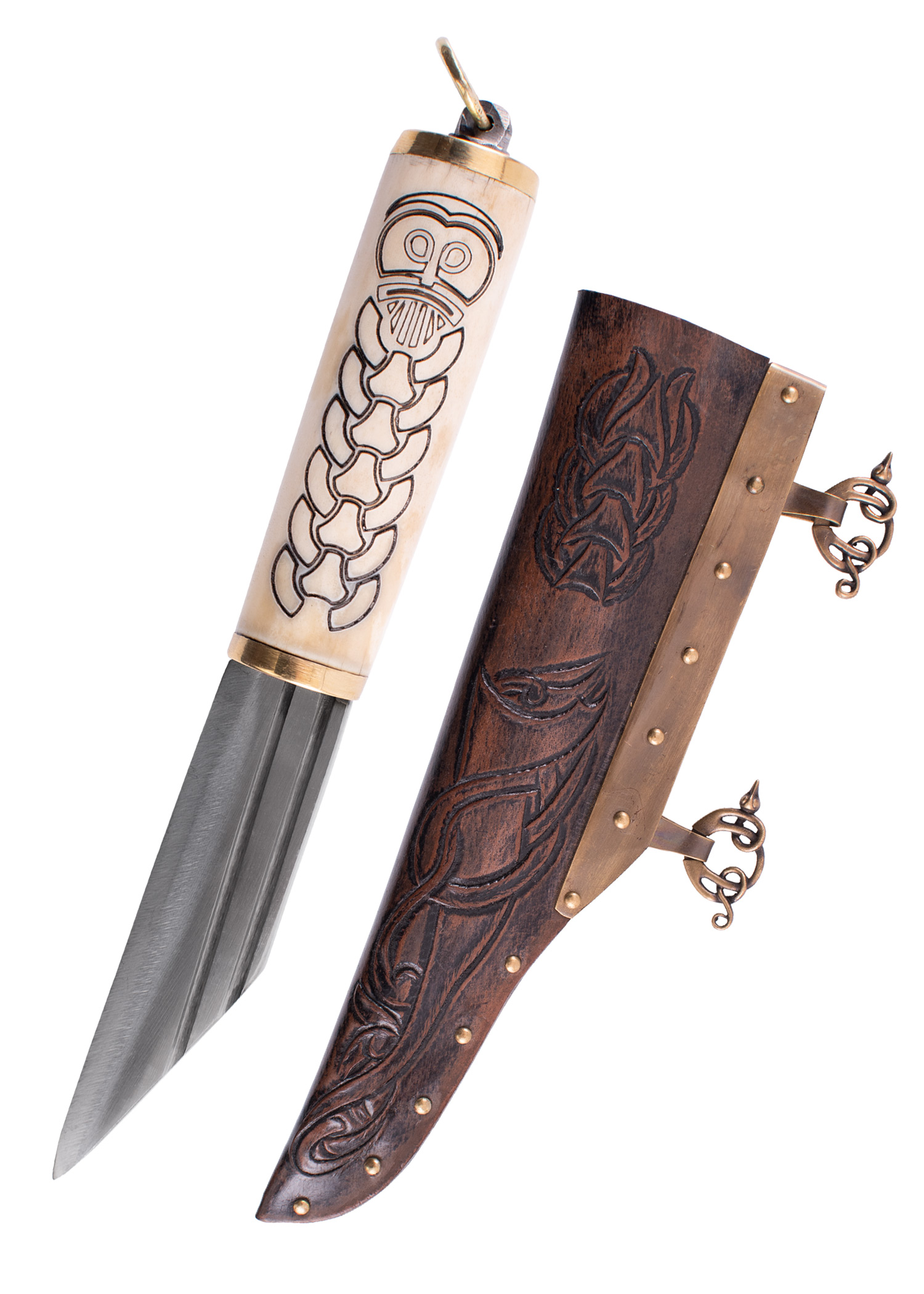Dieses kleine Gebrauchsmesser der Wikingerzeit (aufgrund seiner besonderen Klingenform auch broken back Sax genannt) besitzt eine kurze, handgeschmiedete Klinge aus Kohlenstoffstahl mit kräftigem Rücken. Der polierte und beidseitig mit schönen nordischen Gravuren verzierte Knochengriff ist ein wahrer Hingucker. Zur Klinge hin schließt er mit einer Zwinge aus Messing ab, und am anderen Ende verfügt die ebenfalls aus Messing gefertigte Griffkappe über eine praktische Öse mit großzügigem Messingring zur Aufnahme eines Tragebands oder zum bequemen Herausziehen des Messers aus der Scheide (Band nicht inbegriffen).
