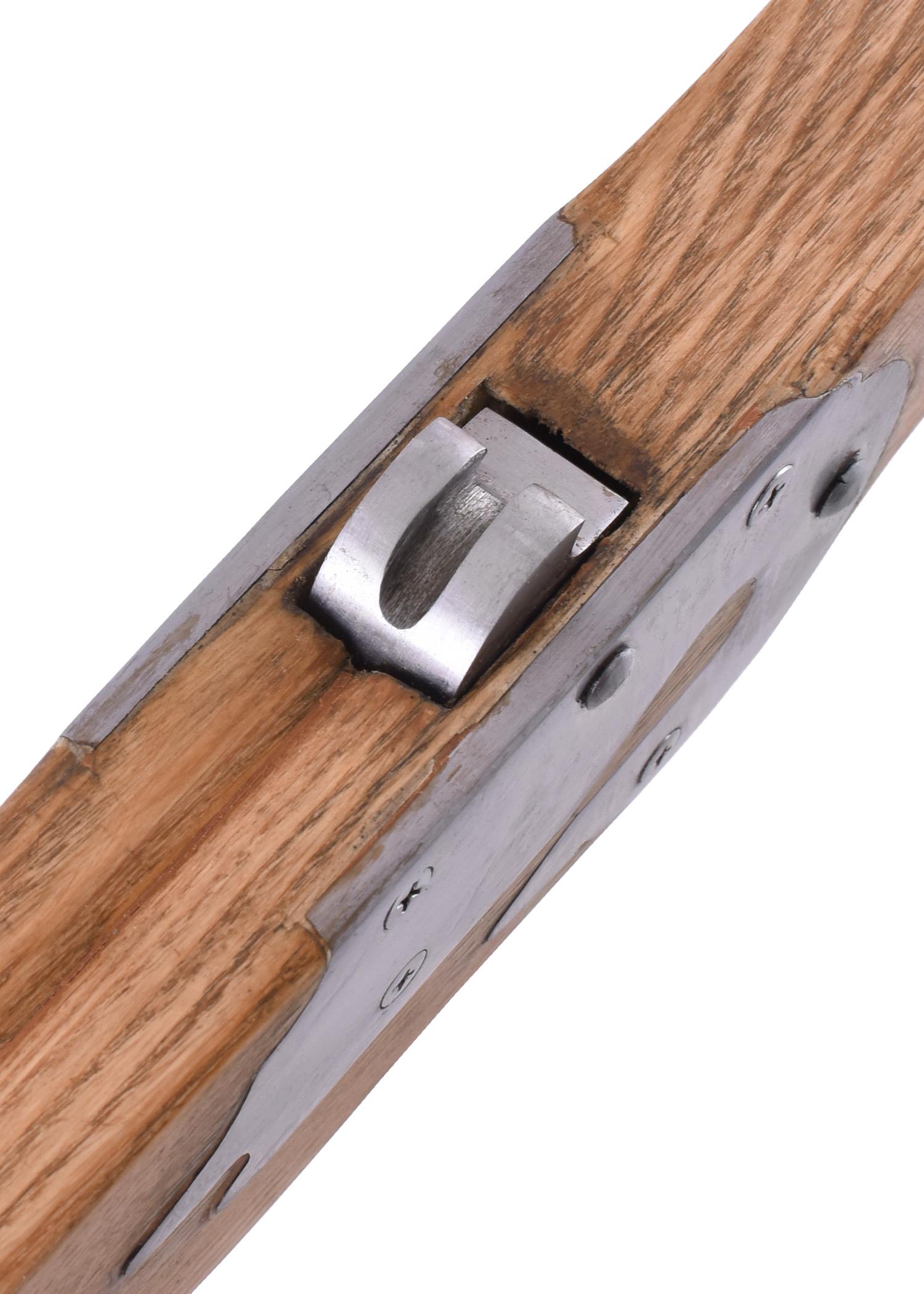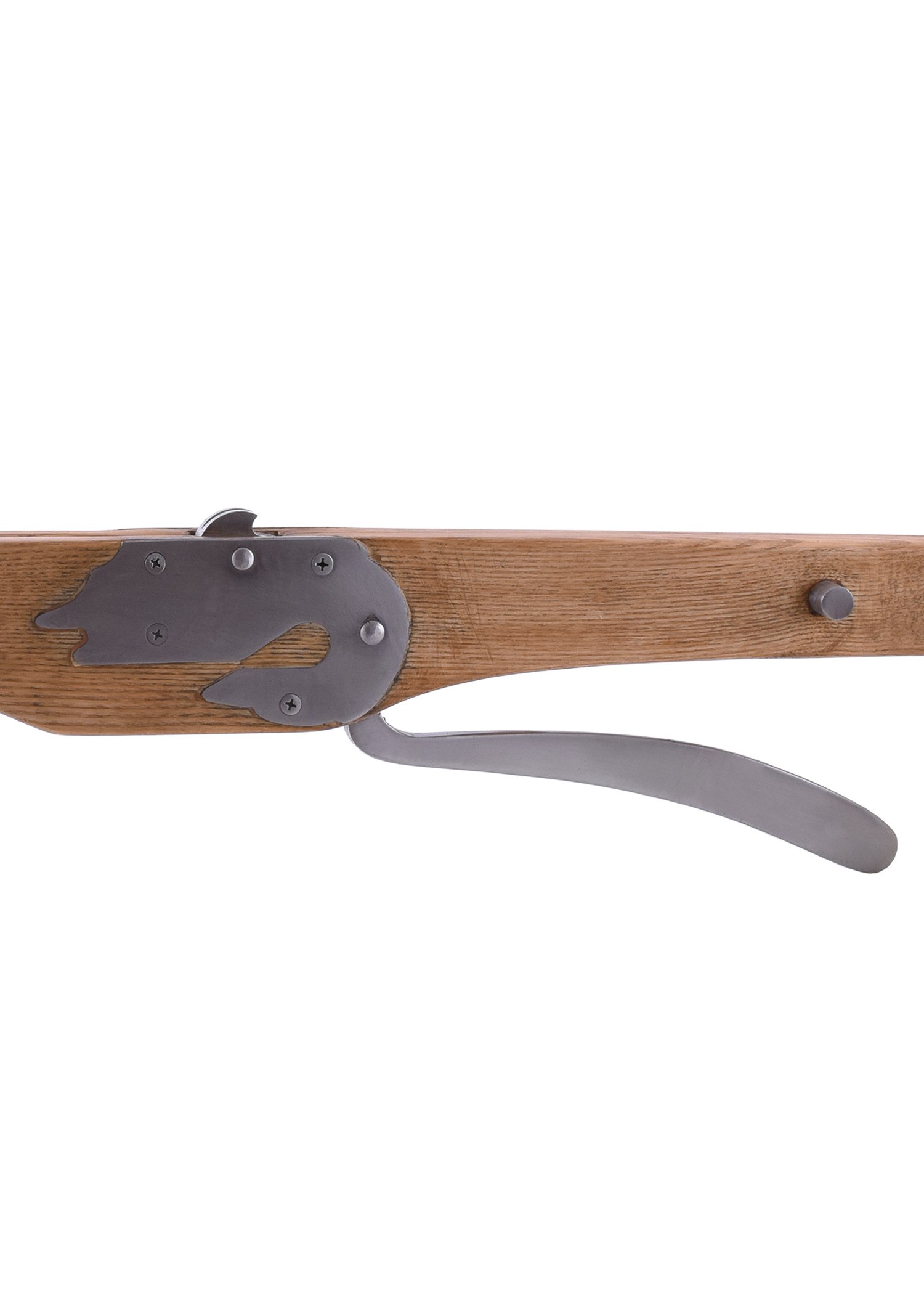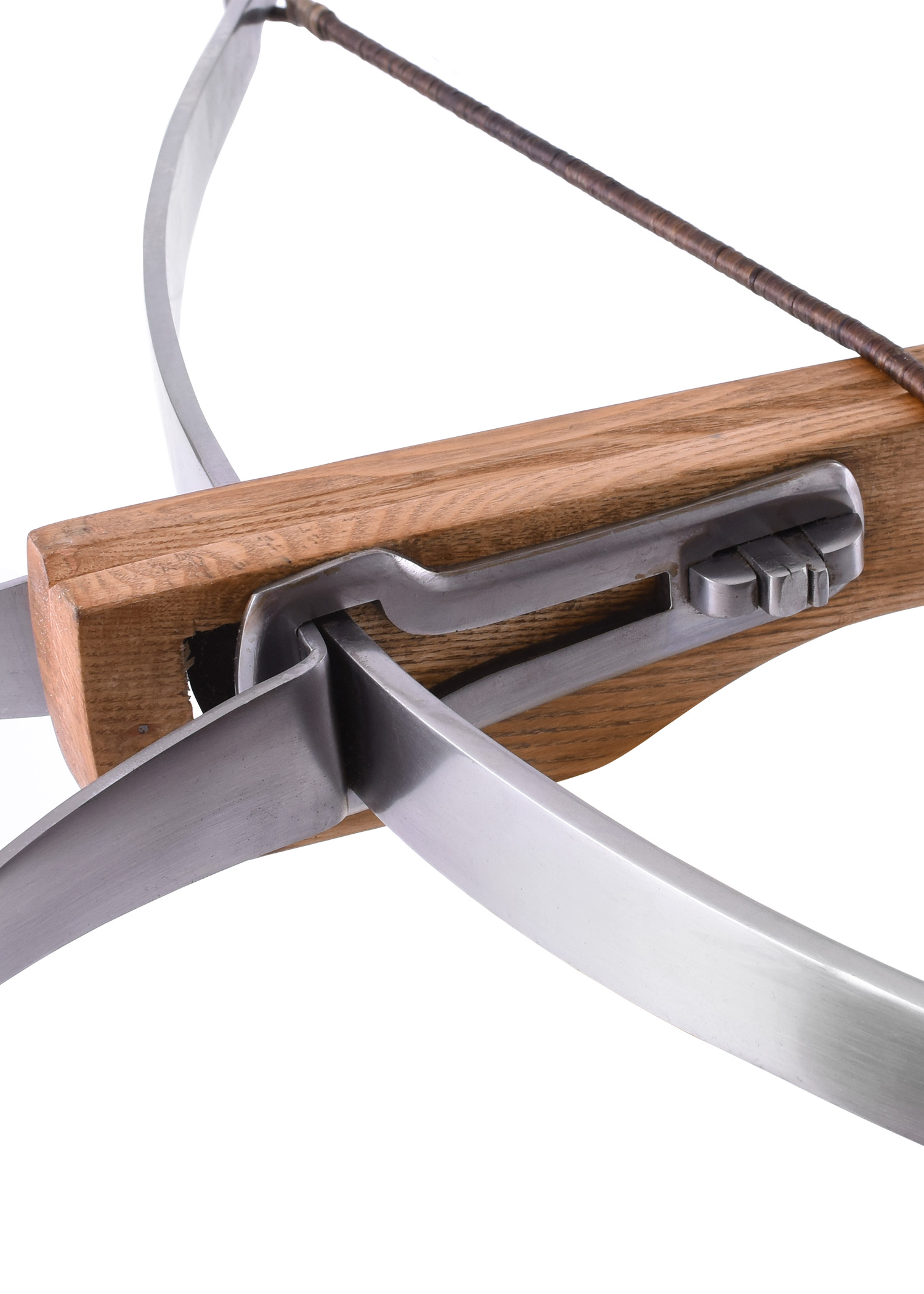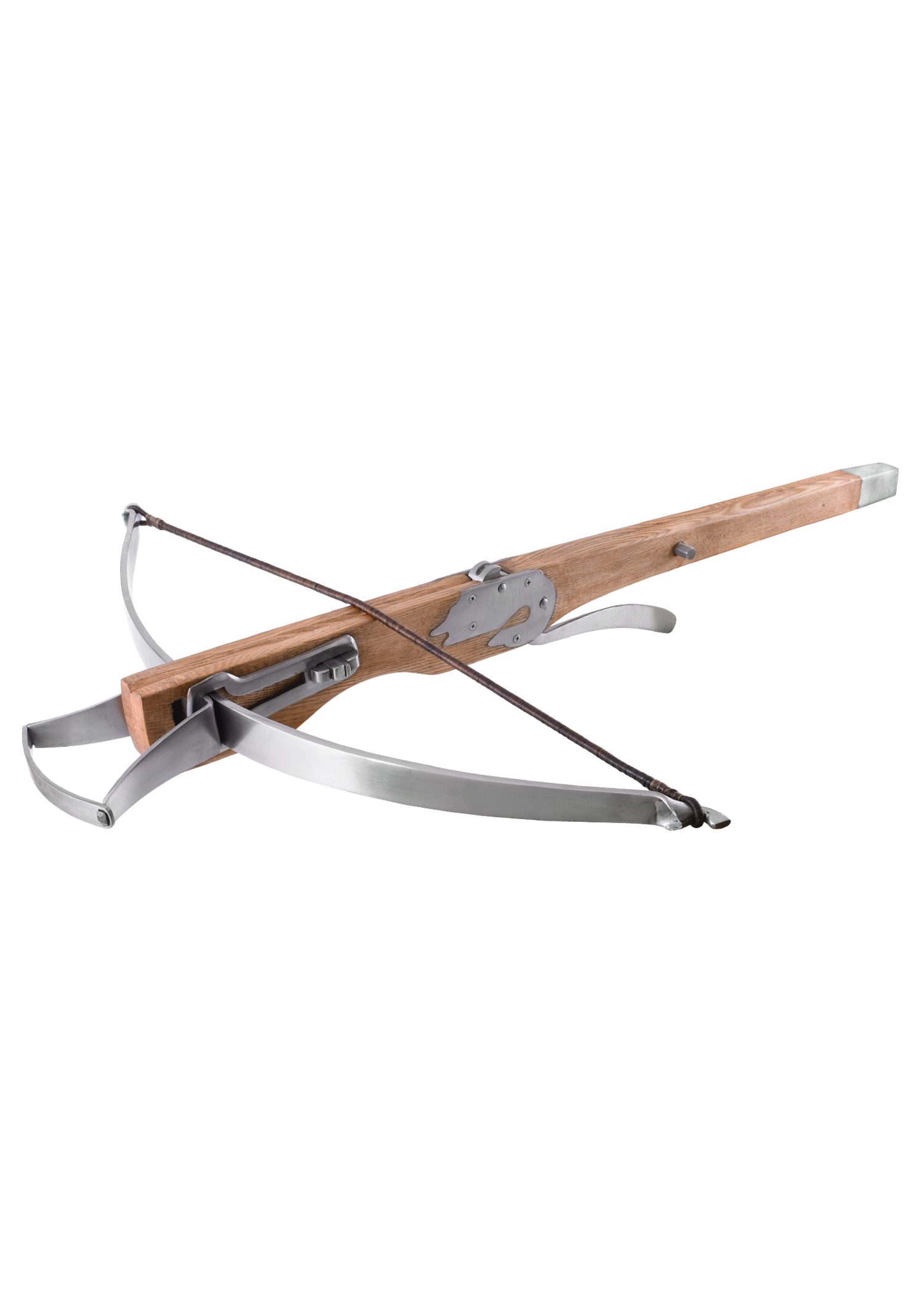 Diese aufwendige Rekonstruktion einer Armbrust aus dem 14. Jahrhundert besitzt einen Stahlbogen und einen Holzschaft. Der Steigbügel, der Abzug, der Rollverschluss (die sog. Nuss) und alle weitere Beschläge sind ebenfalls aus Stahl gefertigt.