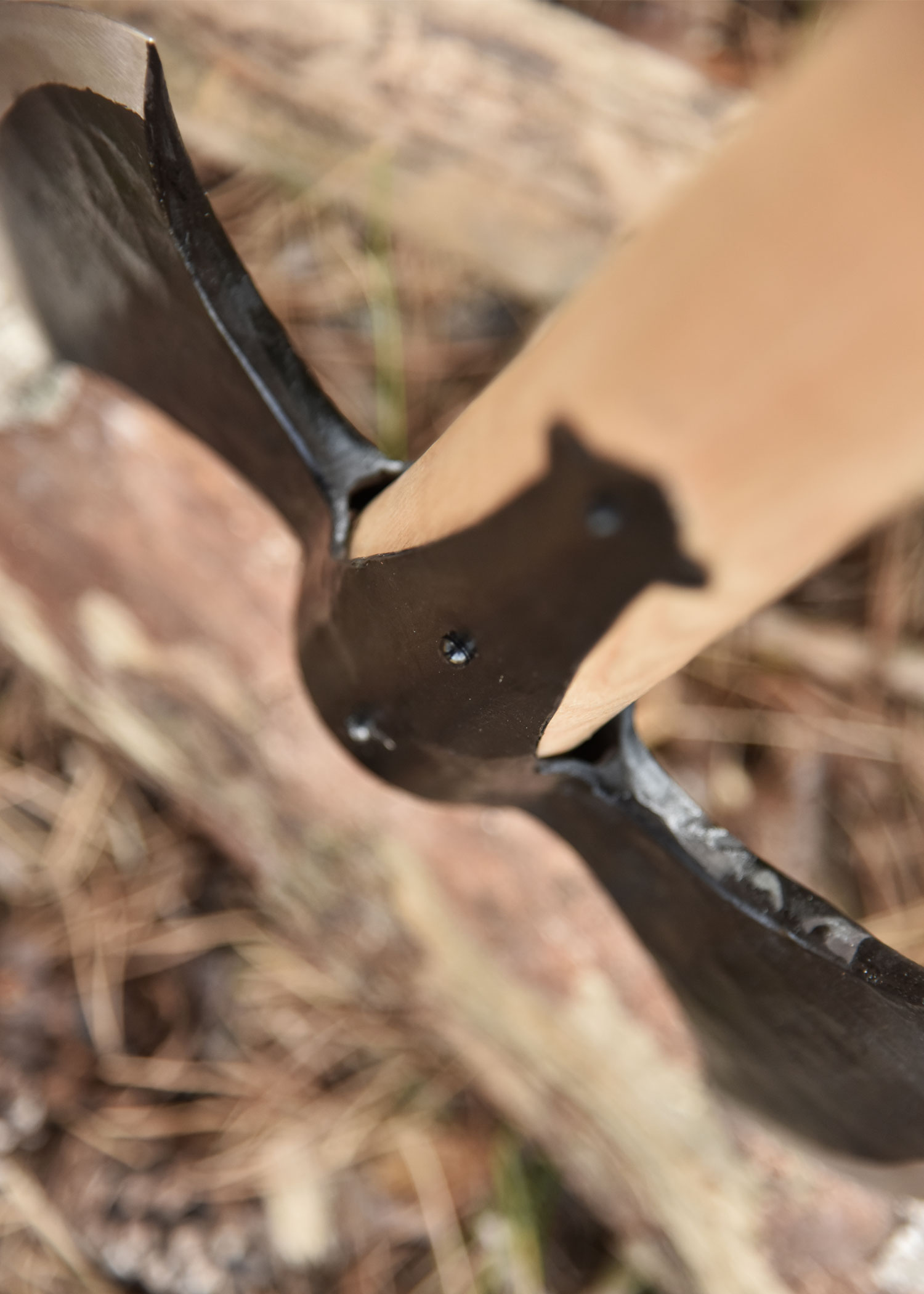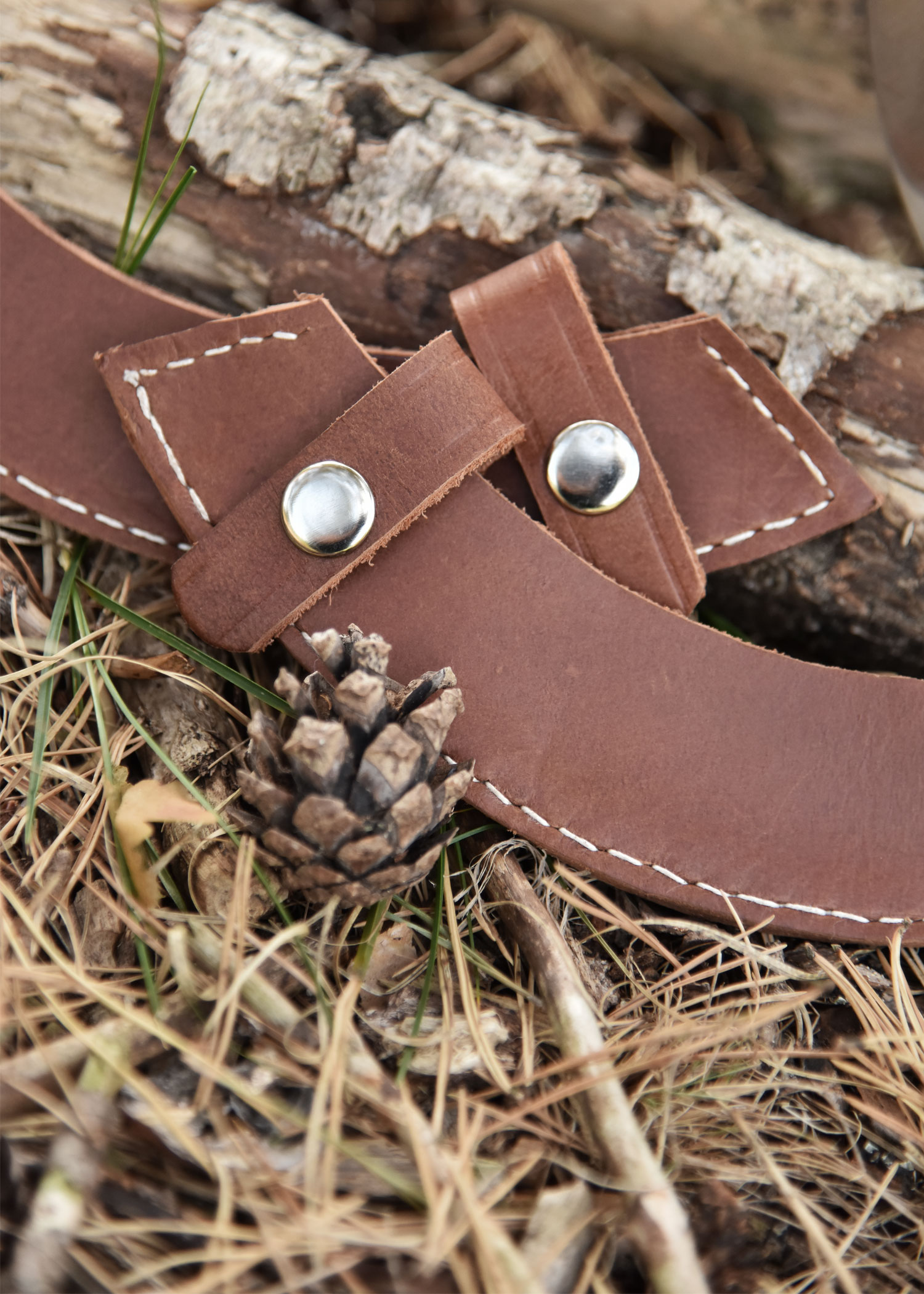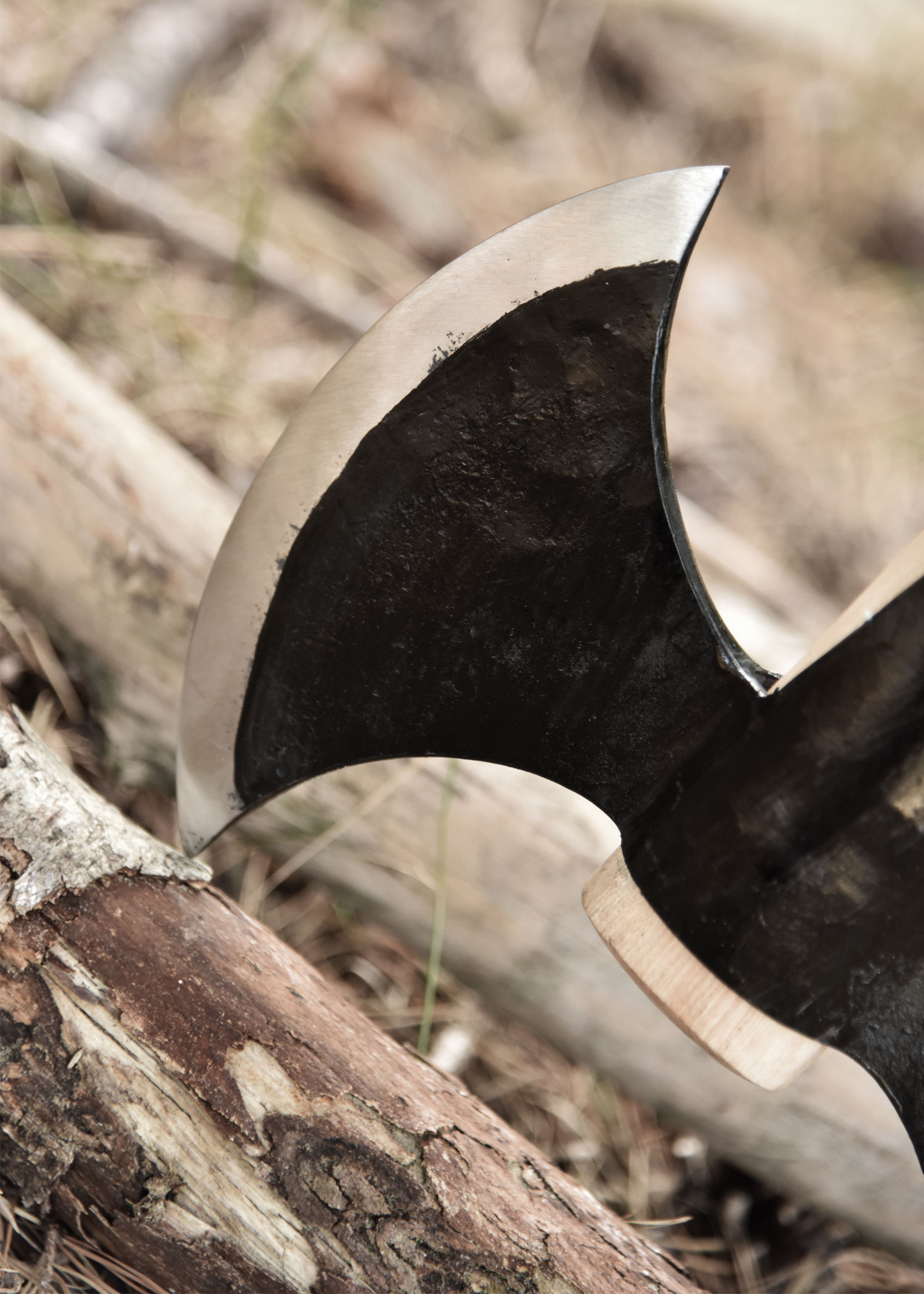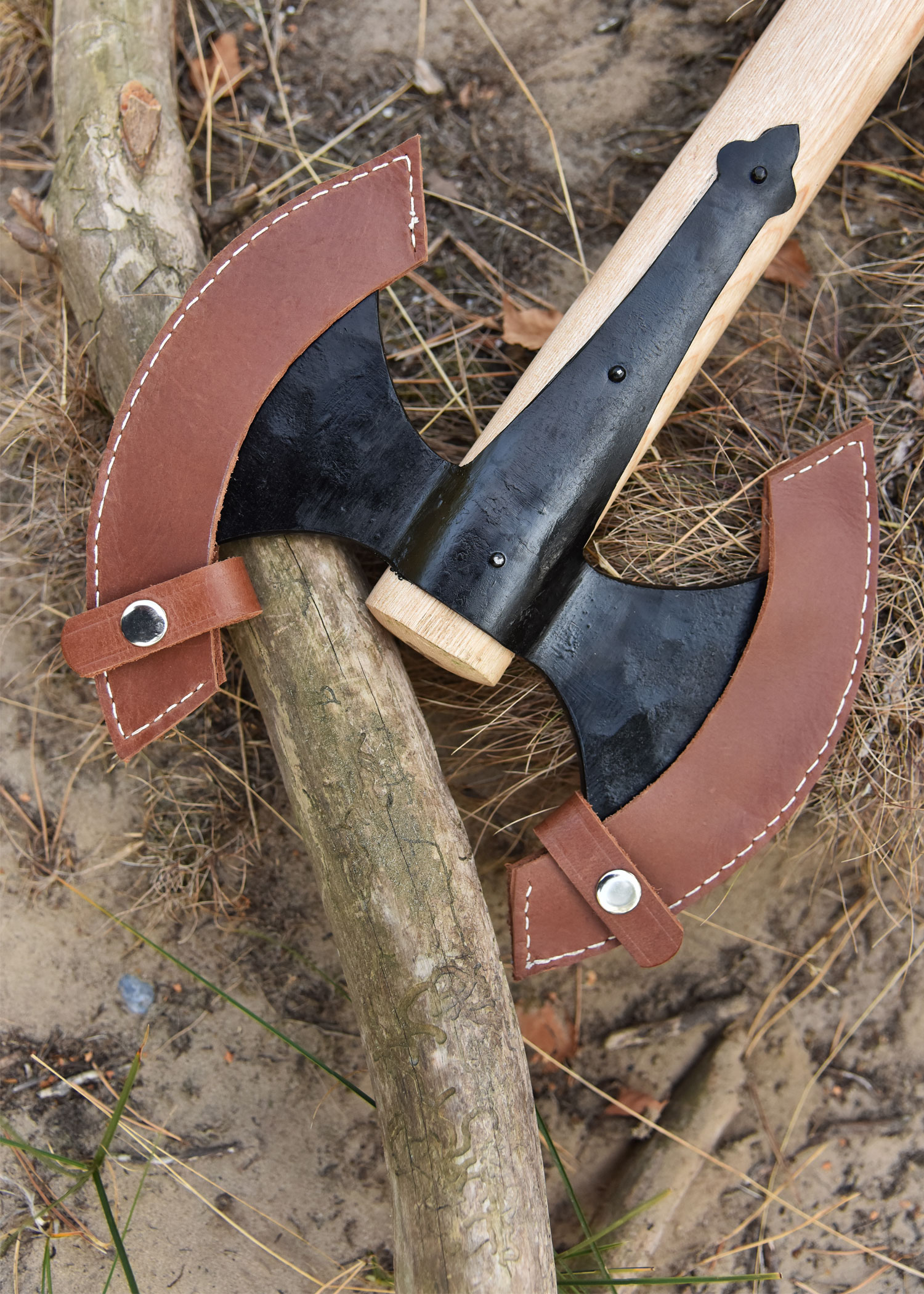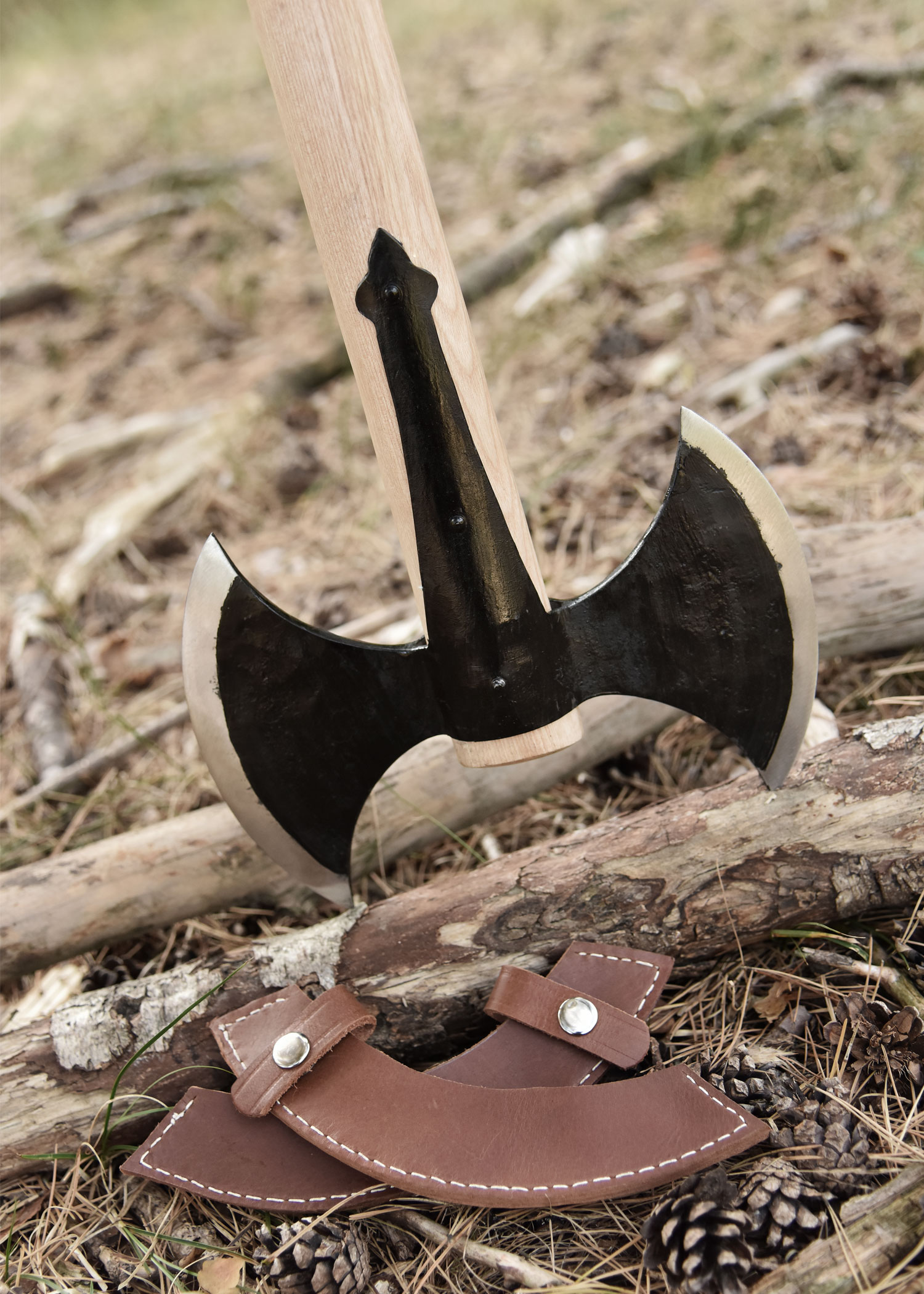 Diese hochwertige Axt verfügt über ein handgeschmiedetes Axtblatt aus Kohlenstoffstahl, das auf einem robusten Holzschaft montiert ist. Das Blatt ist leicht geschärft, kann aber für den Schaukampf auch einfach stumpf geschliffen werden. Die Mittelalter Axt wird inklusive zweier Echtleder-Blattschoner geliefert.