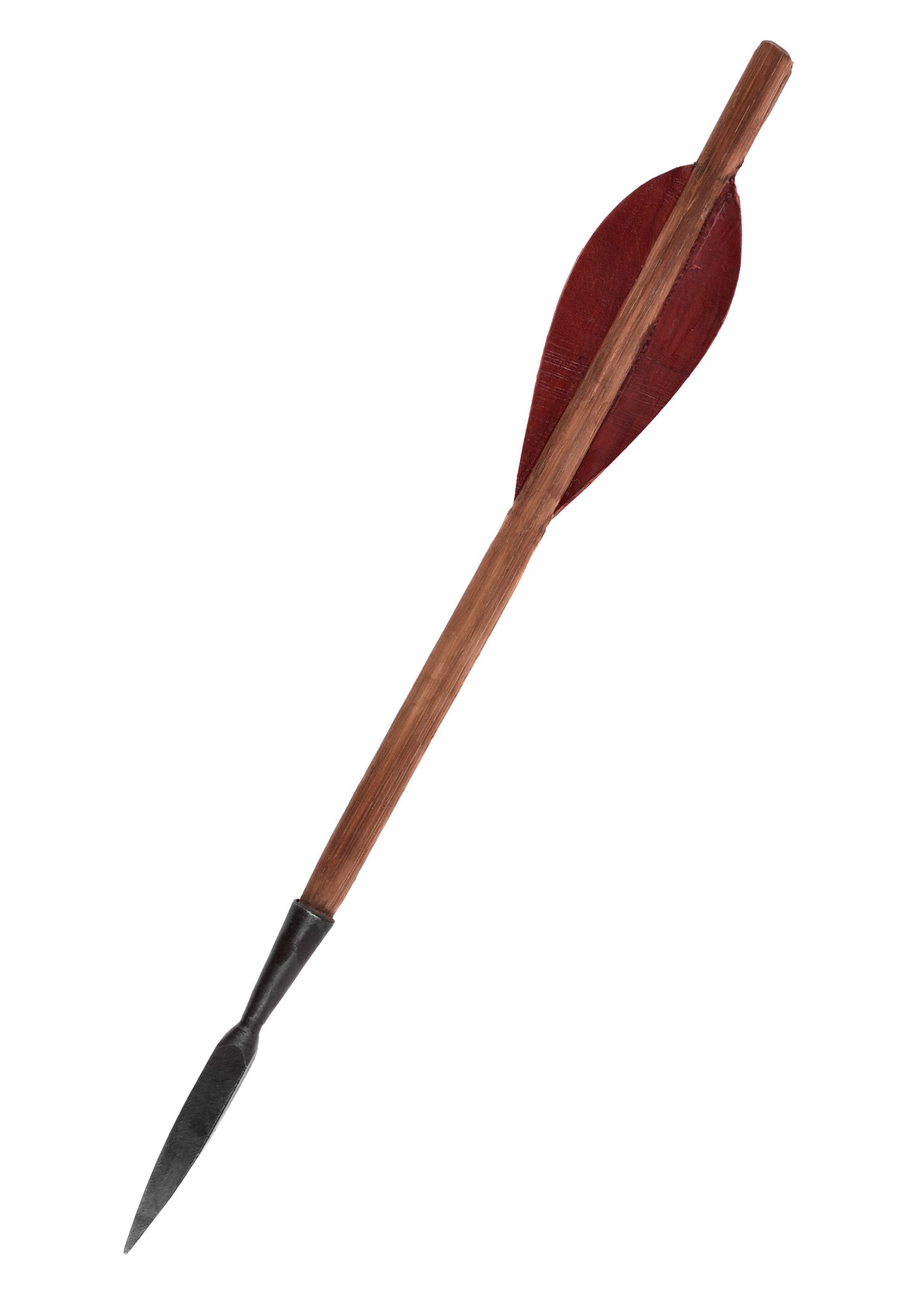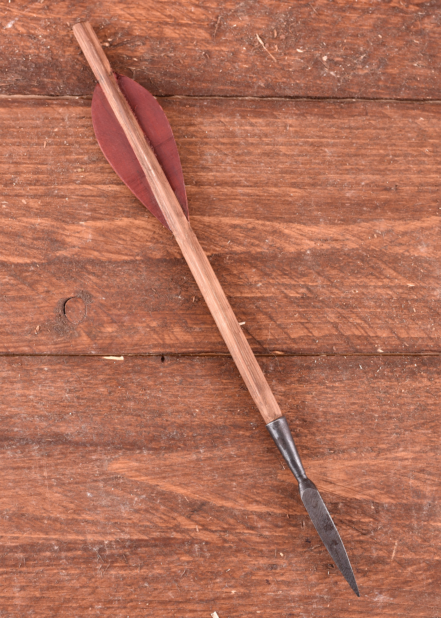 Dieser mittelalterliche Armbrustbolzen misst ca. 33 cm und hat eine Befiederung aus ca. 1,5 mm starkem Leder.Er ist mit einer handgeschmiedeten Bodkinspitze aus Stahl von ca. 10 cm Länge versehen.