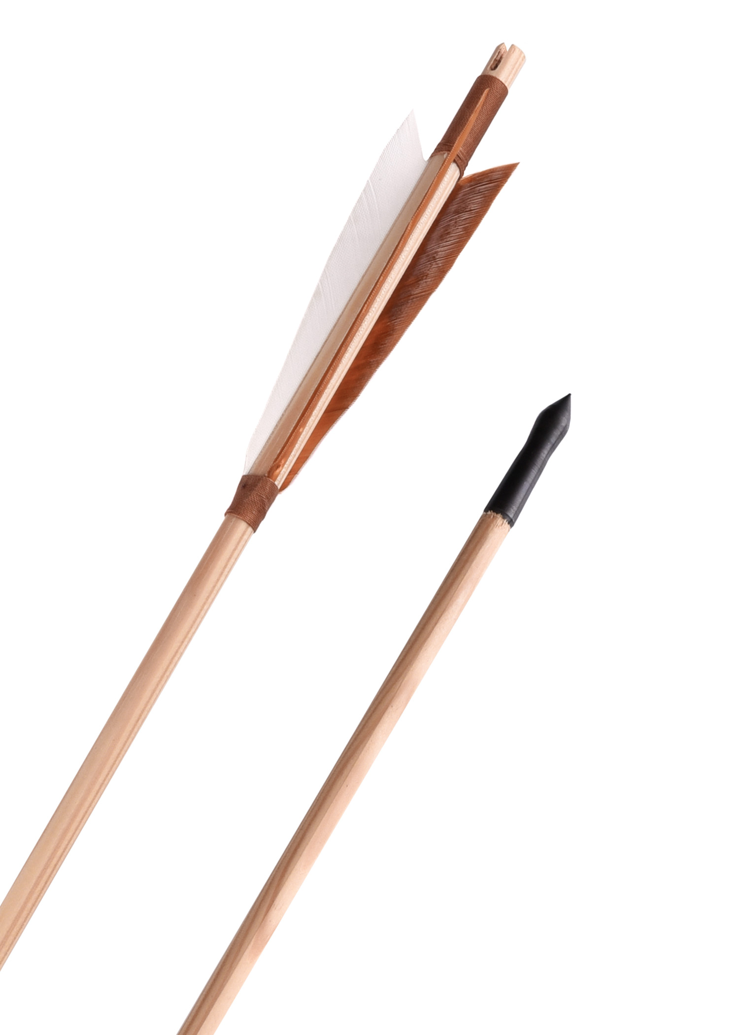 Beschnittene Naturbefiederung in den Farben weiß/braun/braun, zweimal gewickelt. Der Pfeil ist fertig bespitzt mit einem Historypoint.