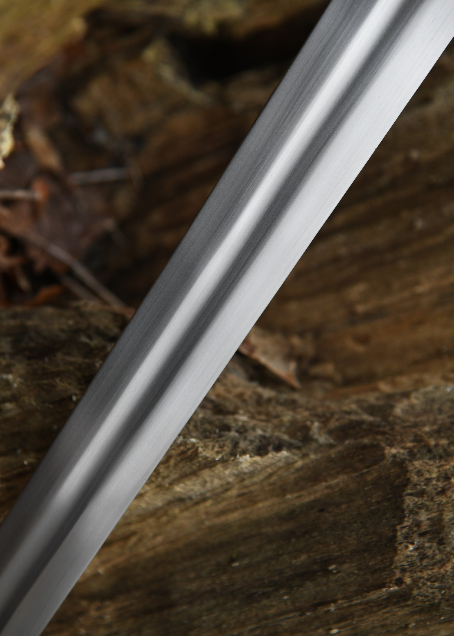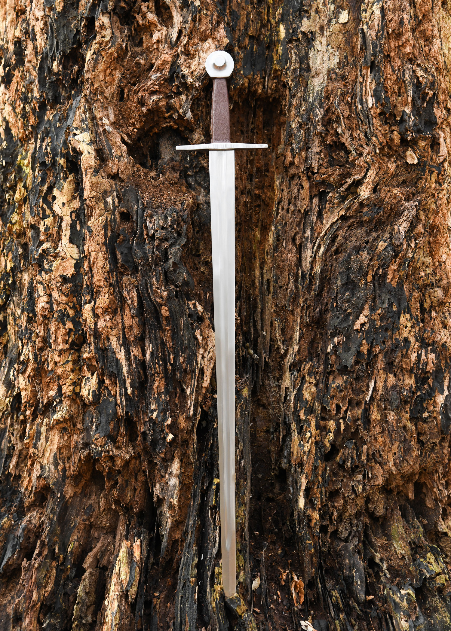 Die Karbonstahlklinge dieses Schwertes ist bis zum Knauf durchgeschmiedet und am Griffende vernietet. Die Spitze wurde abgerundet. Knauf und Parierstange bestehen aus Stahl.