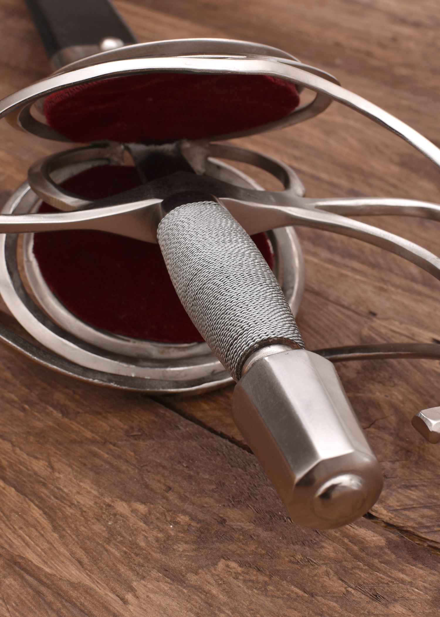Dieses Korbrapier besitzt eine gehärtete, stumpfe Klinge aus Kohlenstoffstahl welche spitz endet. Der große Griffkorb besteht aus Stahl und besitzt Auskleidung aus Samt, der Griff selbst ist mit Draht umwickelt.