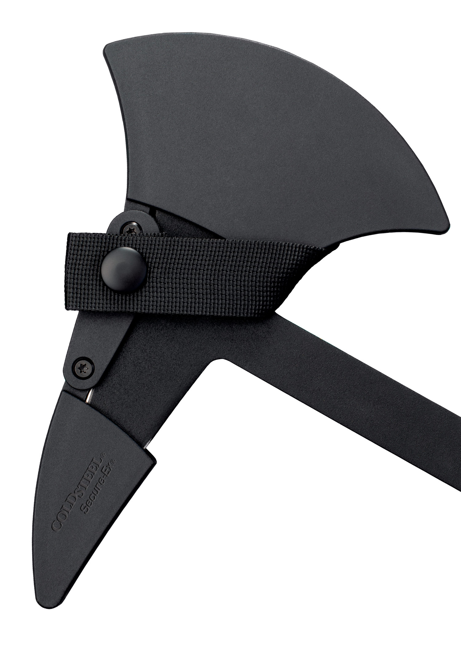 Zum Lieferumfang gehört eine patentierte Scheide mit ausgeklügeltem Gelenkdesign, die sich ganz leicht anbringen oder abnehmen lässt und Schutz vor den scharfen Kanten des Hawks bietet.