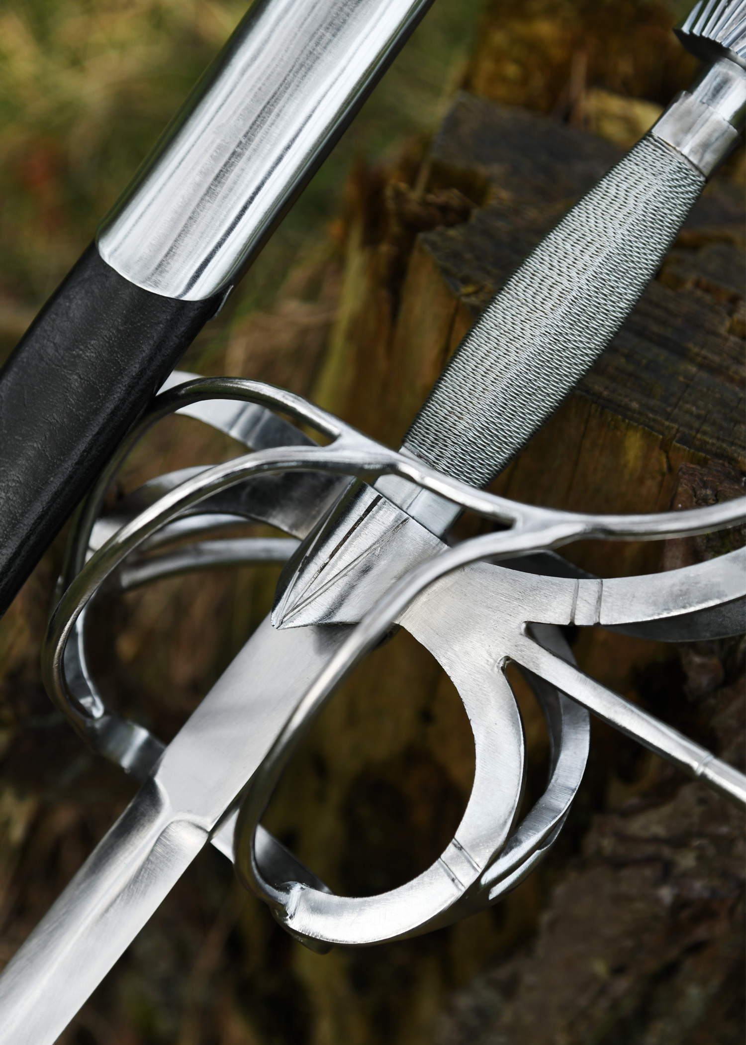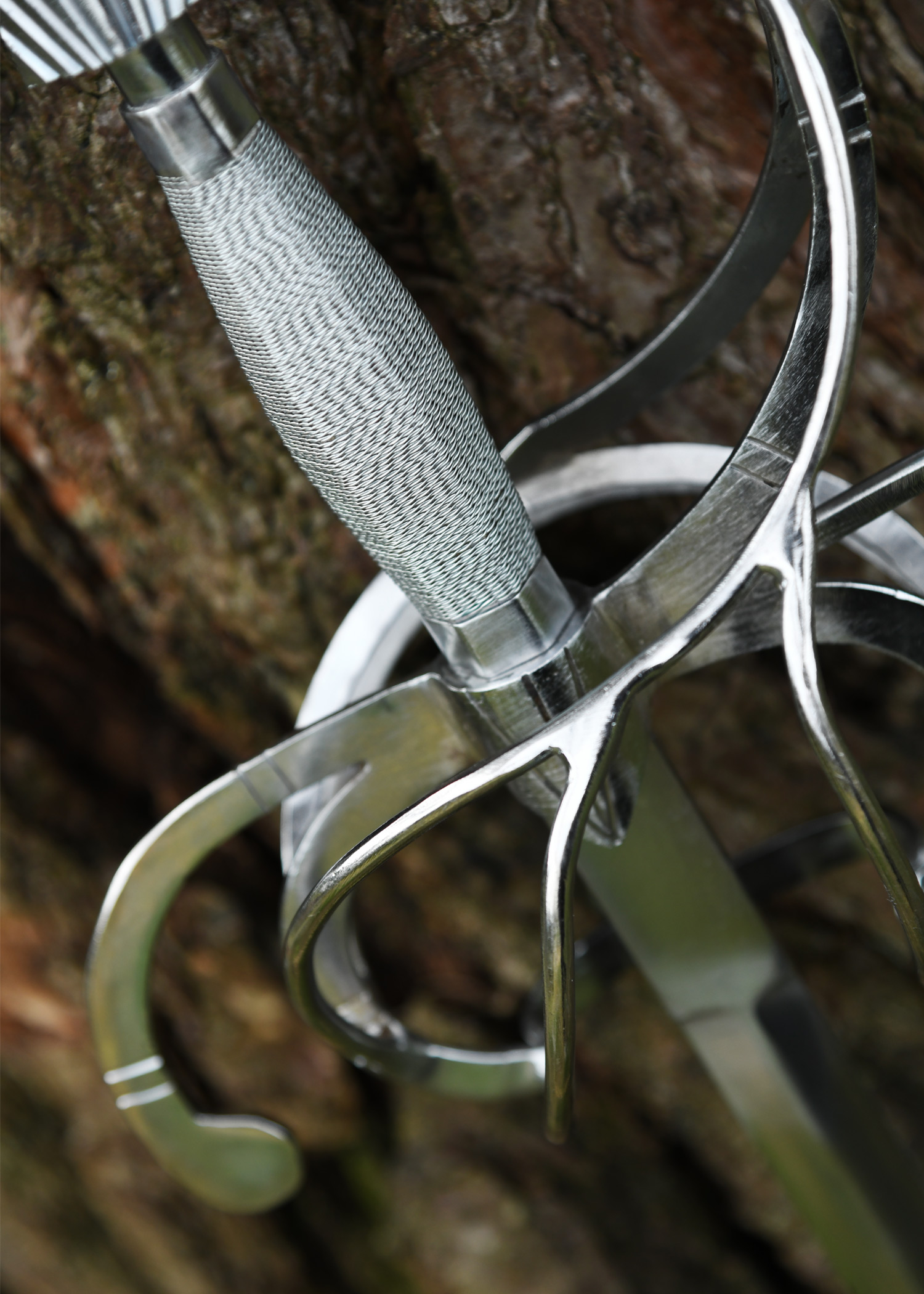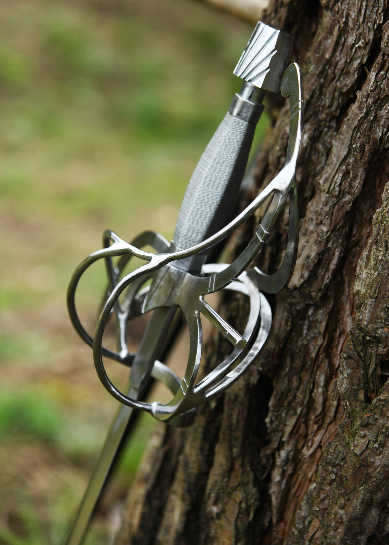 Die Klinge dieses Rapiers ist aus Karbonstahl (EN45) handgeschmiedet, geschliffen und sorgfältig poliert, jedoch nicht geschärft. In Bezug auf Gewicht, Größe und Verarbeitung ist es nah an seinen zeitgenössischen Originalen gehalten. Der Holzgriff ist mit Stahldraht umwickelt und das aufwendige Parier ist vollständig aus Stahl gearbeitet.