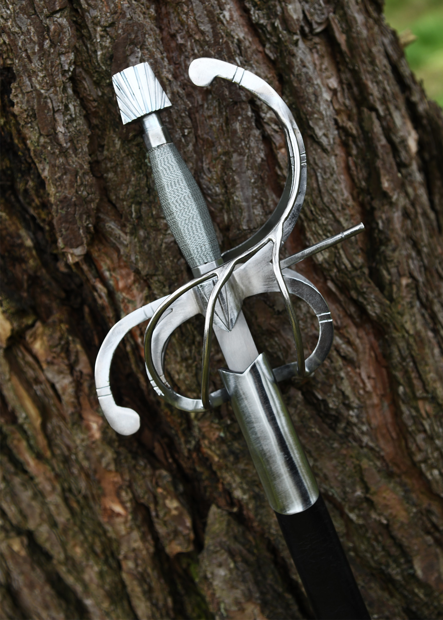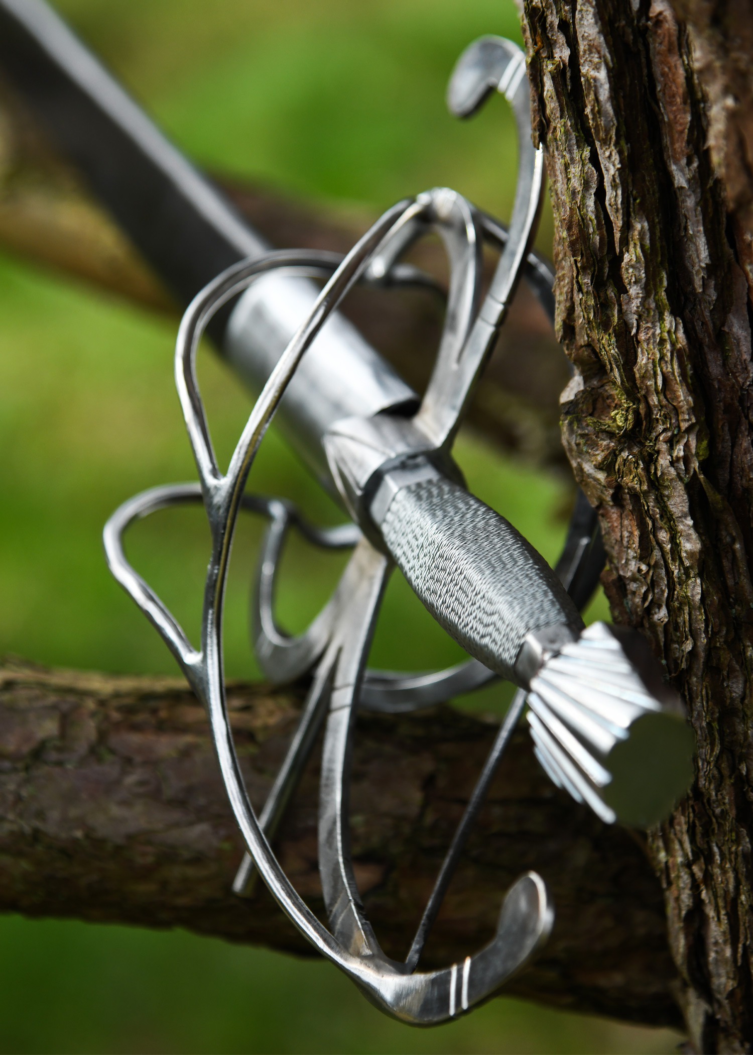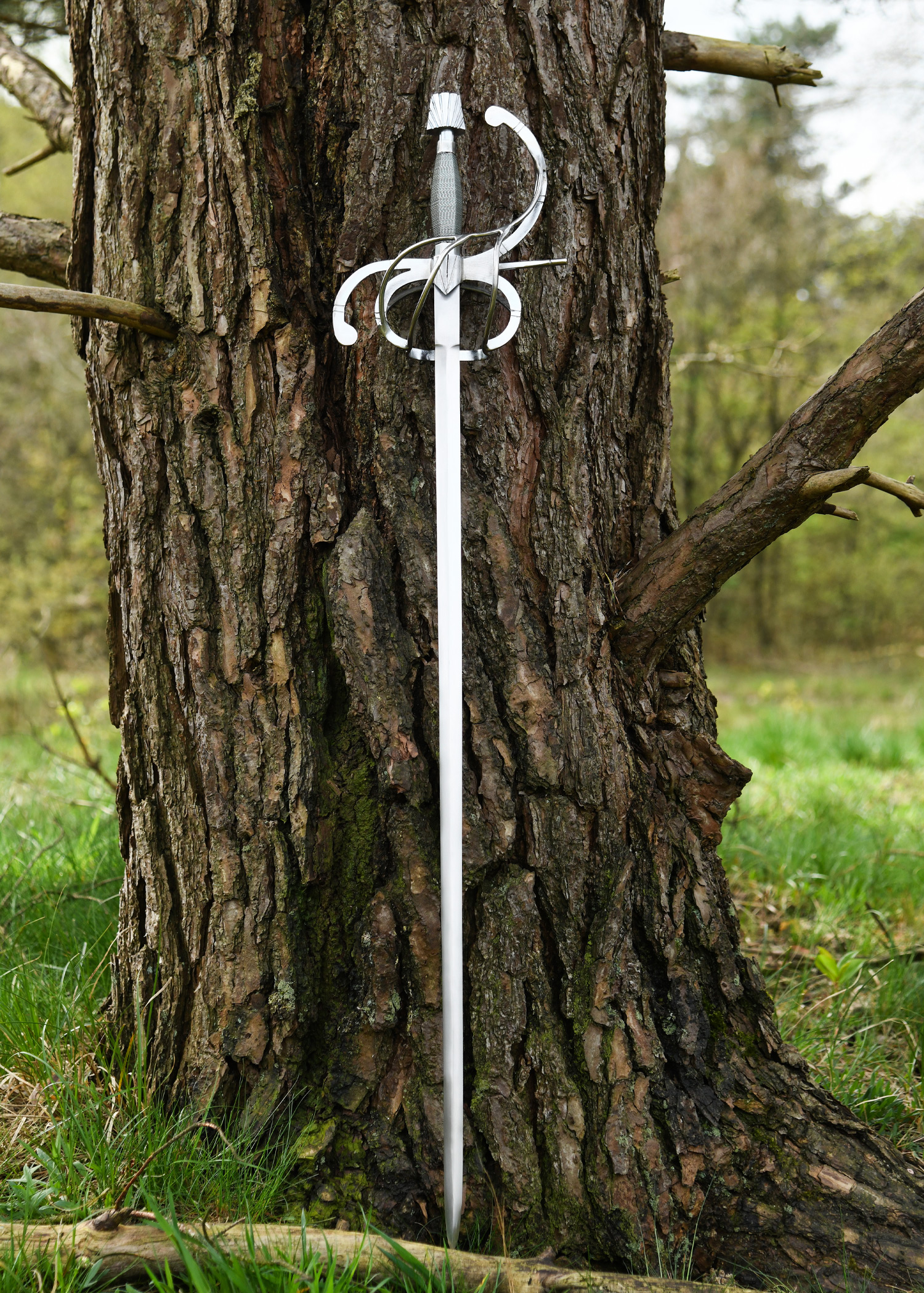 Die Klinge dieses Rapiers ist aus Karbonstahl (EN45) handgeschmiedet, geschliffen und sorgfältig poliert, jedoch nicht geschärft. In Bezug auf Gewicht, Größe und Verarbeitung ist es nah an seinen zeitgenössischen Originalen gehalten. Der Holzgriff ist mit Stahldraht umwickelt und das aufwendige Parier ist vollständig aus Stahl gearbeitet.