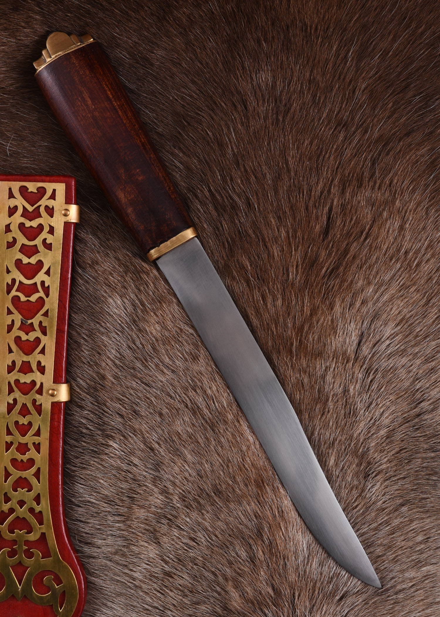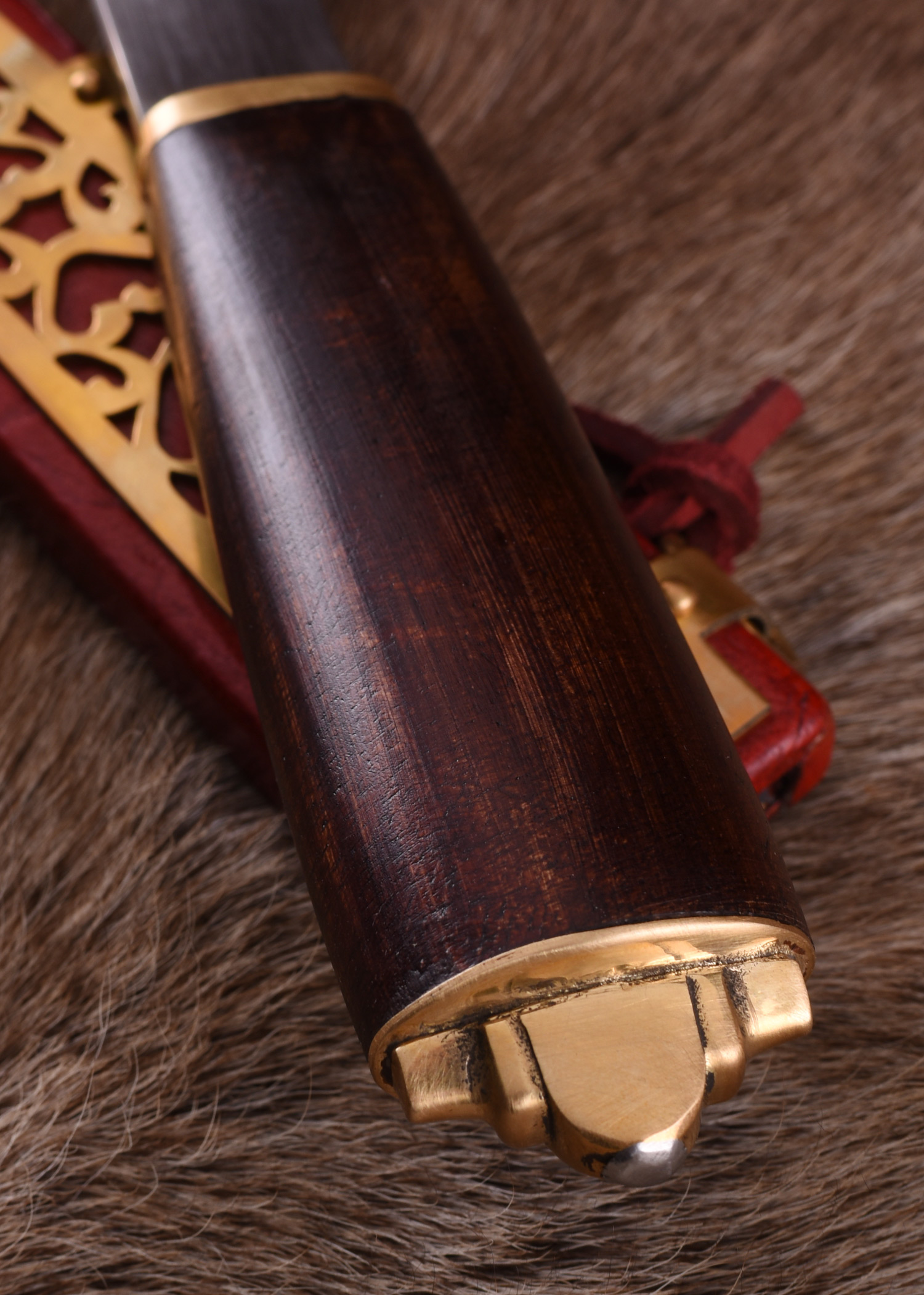 - Material: Klinge aus Federstahl EN45 (Karbonstahl, nicht rostfrei), Holzgriff, Zwinge und Knauf aus gegossenem Messing