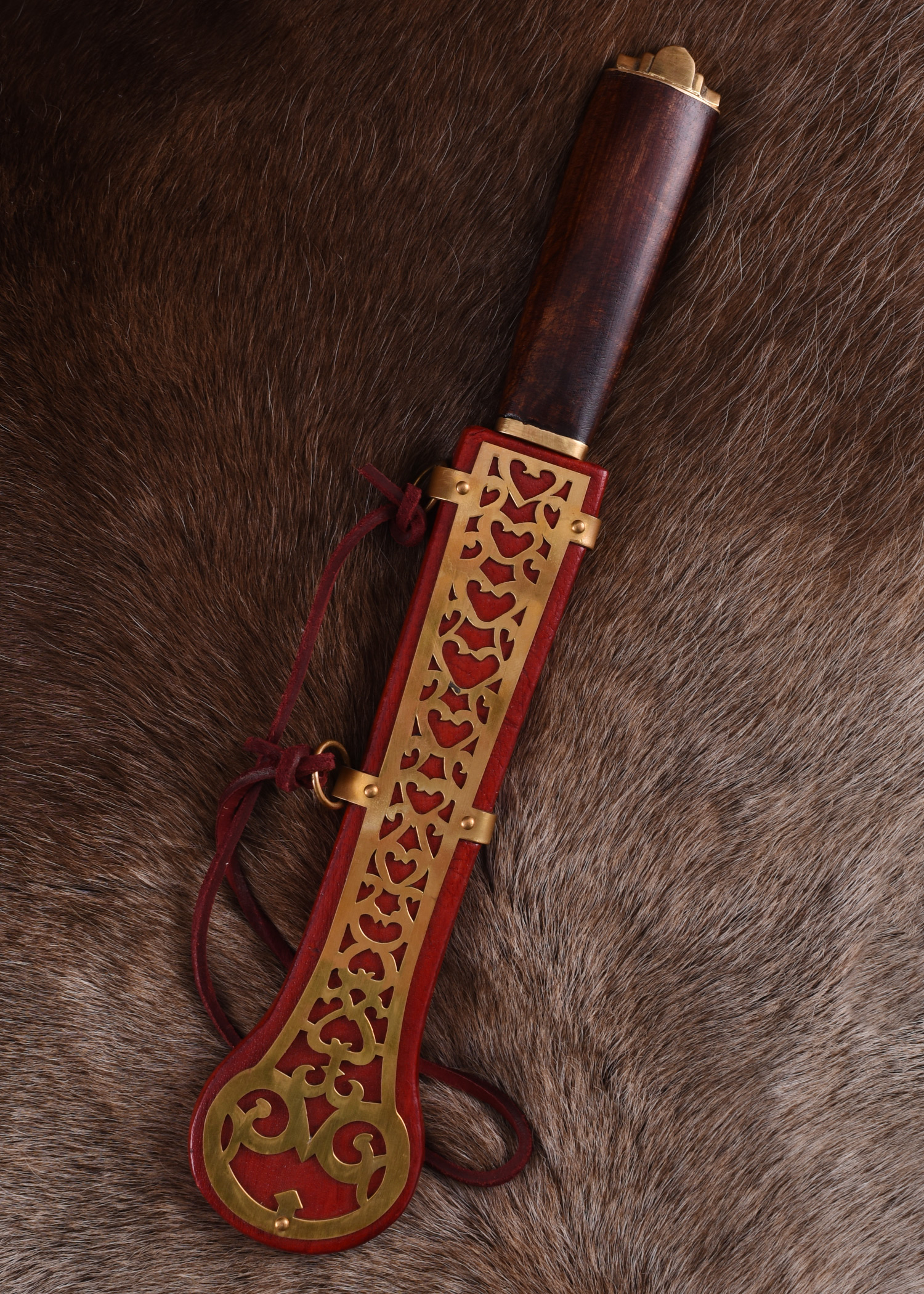 Der spätrömische Dolch, den wir hier anbieten, basiert auf Fragmenten von metallenen Scheiden-Zierplatten, die bei Ausgrabungen in Dura Europos (1928-1937) und in Budapest, Ungarn, gefunden wurden. Schauseitig ist die rote Holz-/Lederscheide mit einer durchbrochenen, als Thekenbeschlag bezeichneten Messingplatte verziert. Obwohl bis heute nur etwa 200 Exemplare überliefert sind, deuten die Untersuchungserkenntnisse darauf hin, dass diese Art von dekorativen Scheidenbeschlägen sowie die eigenartige, löffelförmige Scheidenform etablierte Merkmale der römischen Messerfutterale des späten 2. bis 4 Jahrhunderts waren. Die Scheide ist außerdem mit zwei Messingringen und einem Lederband ausgestattet. Andere gefundene Thekenbeschläge lassen vermuten, dass solche Scheiden mittels einer Kordel am Gürtel aufgehängt und horizontal getragen wurden, wobei das ungewöhnliche Endstück als Gegengewicht zum Dolchgriff diente.