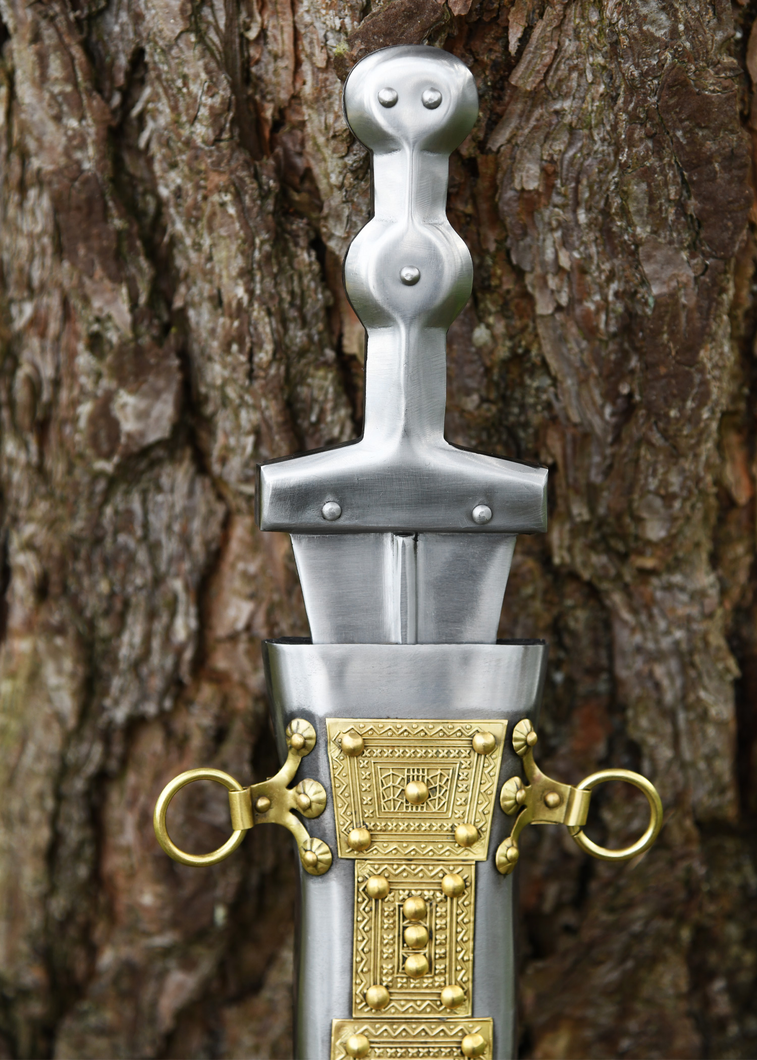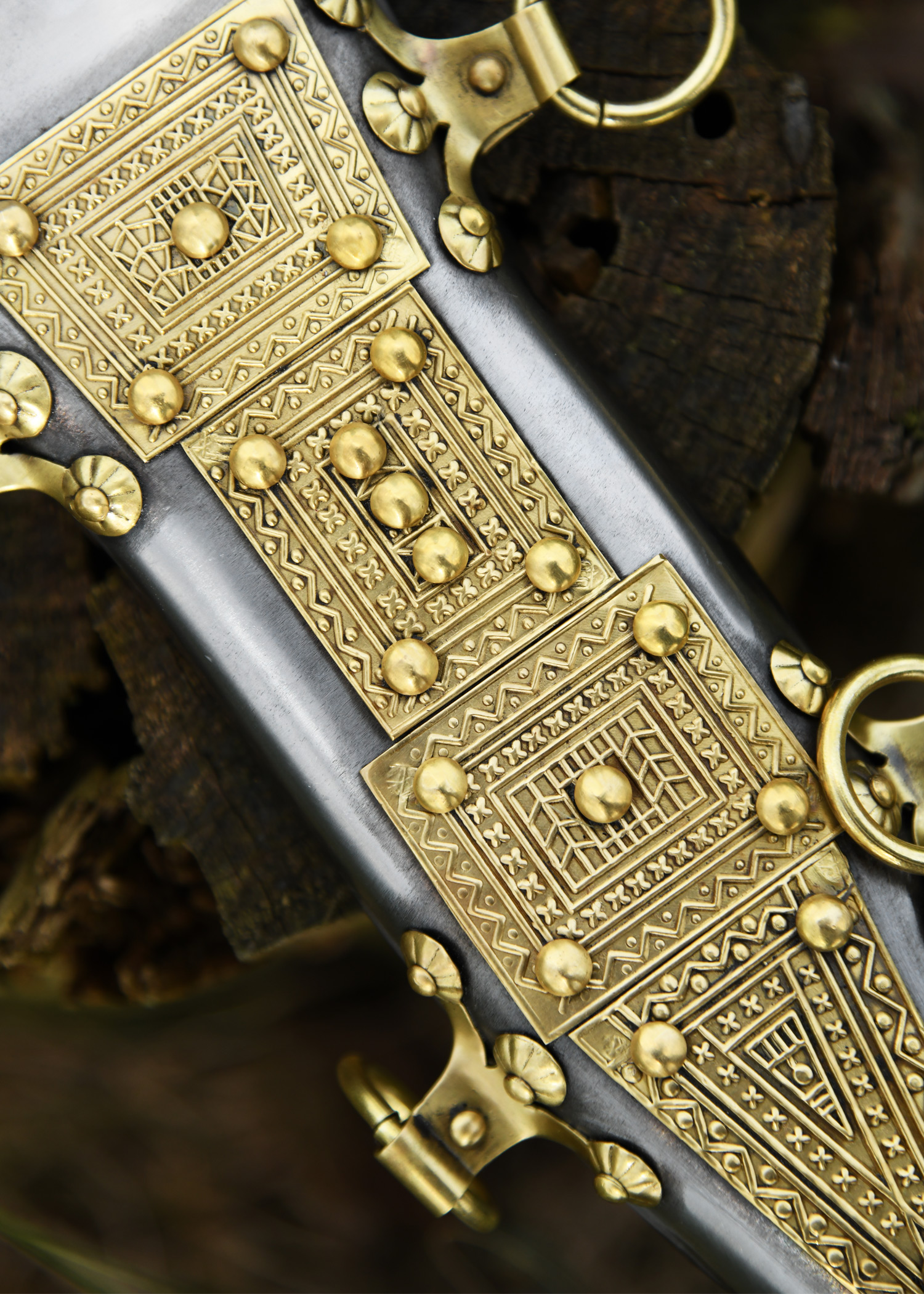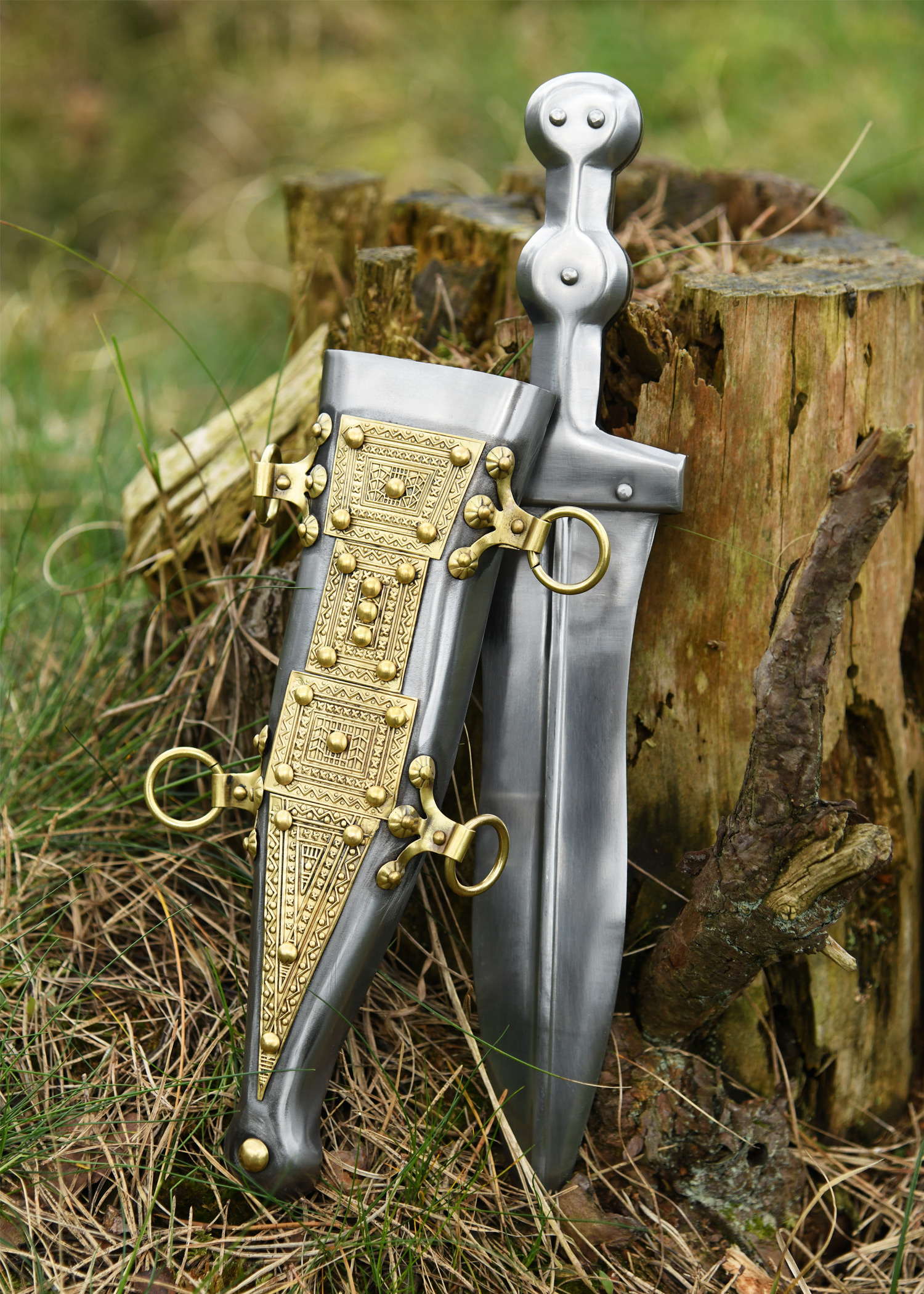 Replik eines römischen Dolches aus dem 1. Jahrhundert. Der Pugio hat eine dekorativen Scheide aus Stahl, die reichlich mit Messingbeschlägen verziert ist.