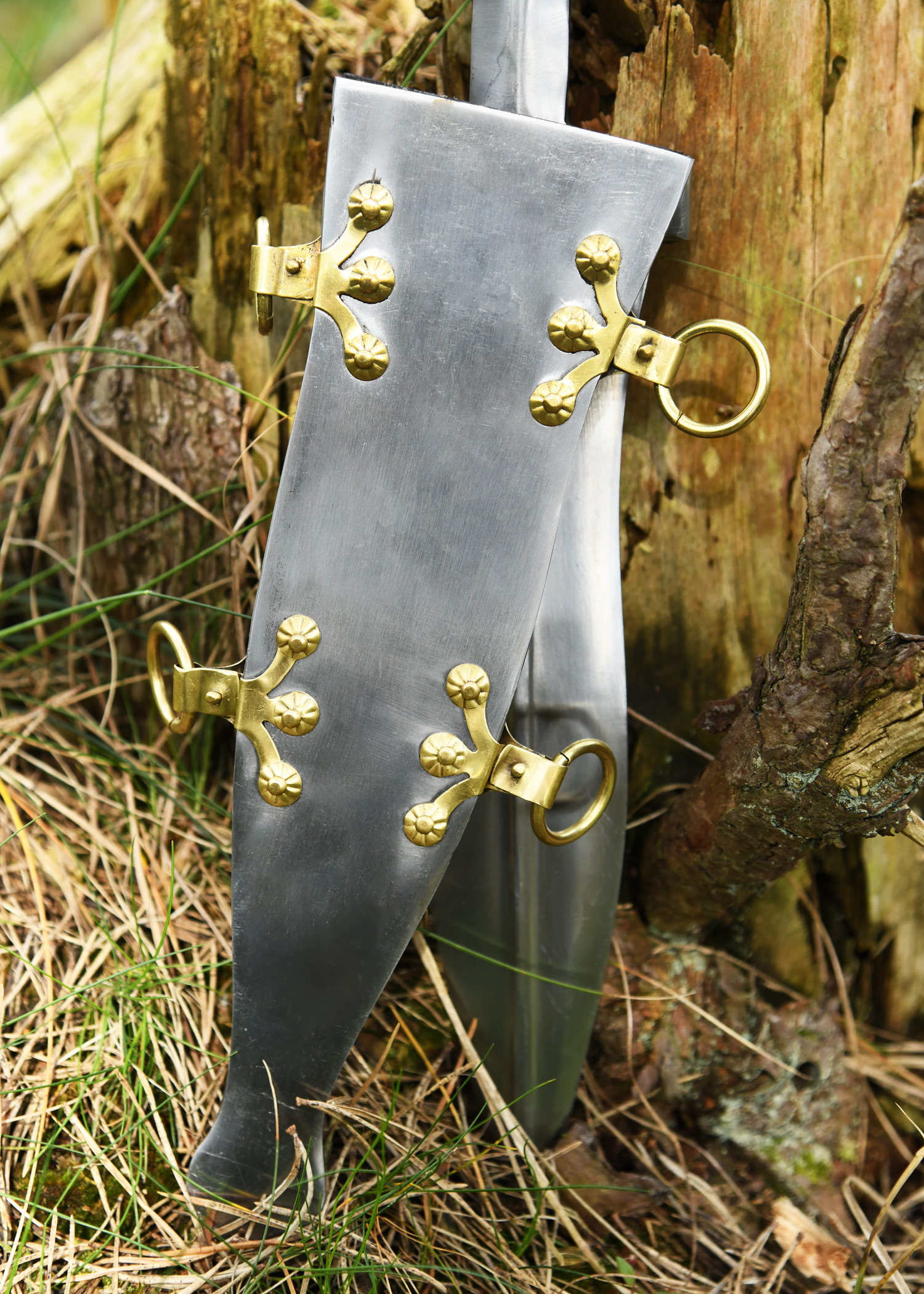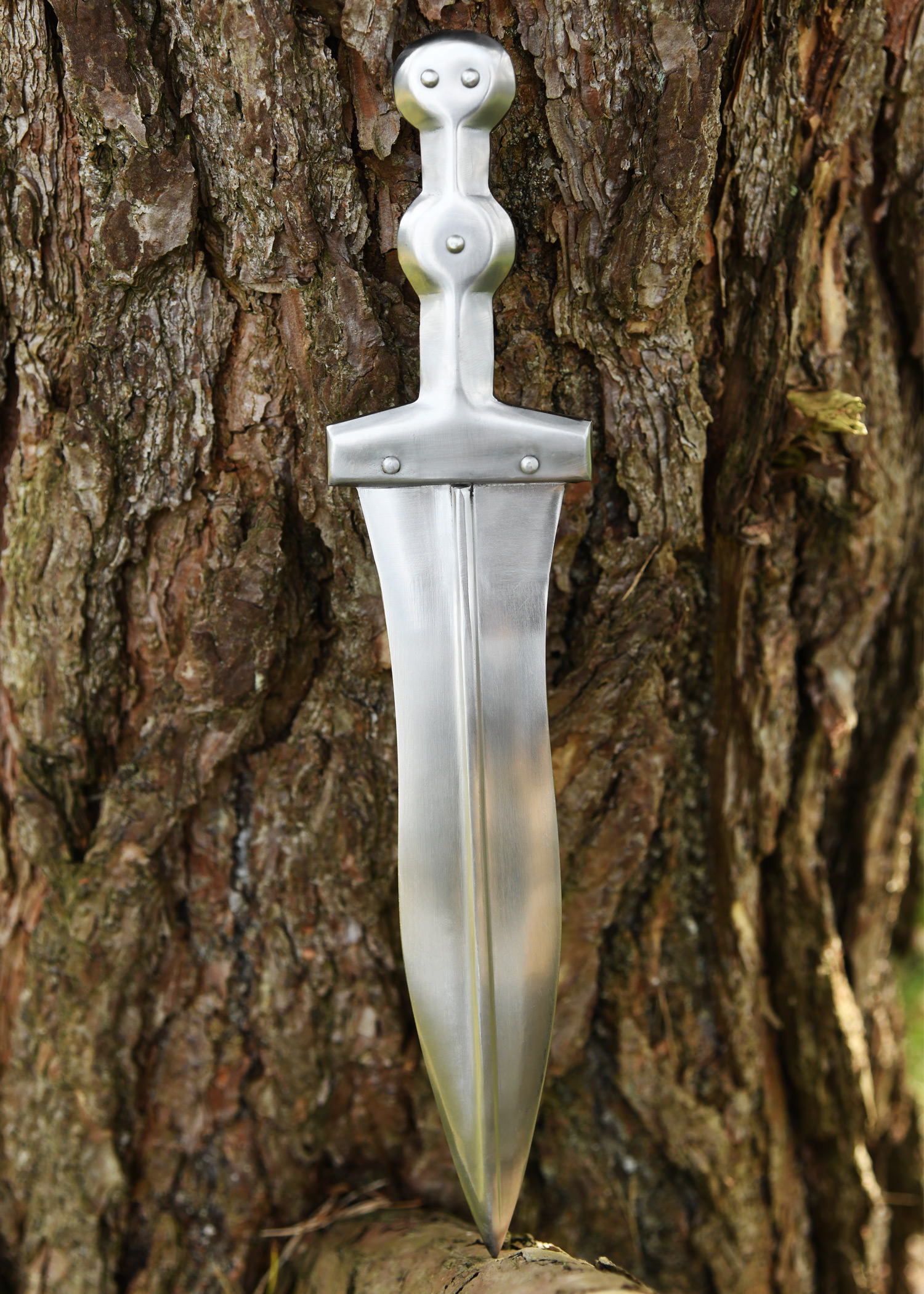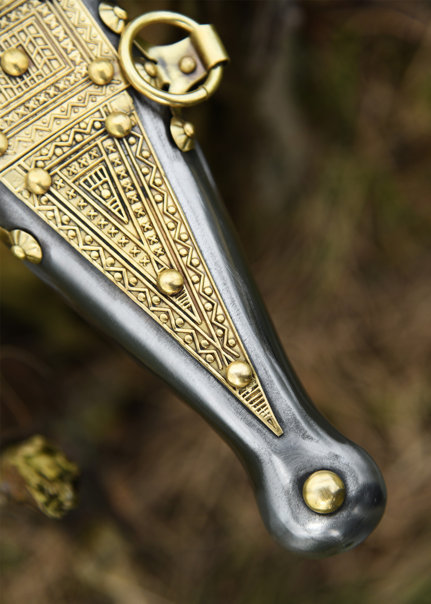 Replik eines römischen Dolches aus dem 1. Jahrhundert. Der Pugio hat eine dekorativen Scheide aus Stahl, die reichlich mit Messingbeschlägen verziert ist.