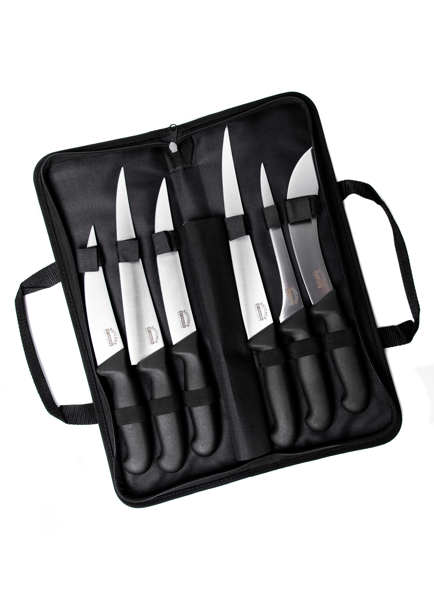 Dieses Samura Butcher Set enthällt 6 verschiedene Messer inklusive einer Tasche. Die jeweiligen Exemplare könnten unterschiedlicher nicht aussehen und doch erfüllen sie alle ihre Aufgaben hervorragend. Auf diese Messer ist Verlass, auch wenn die Hände mal nass sein sollten, rutschen sie nicht ab, Dank des Kuststoffgriffes. Die Messer ermöglichen einen einfachen und bequemen Halt und mit der Edelstahlklinge ist keien Aufgabe zu groß für sie.