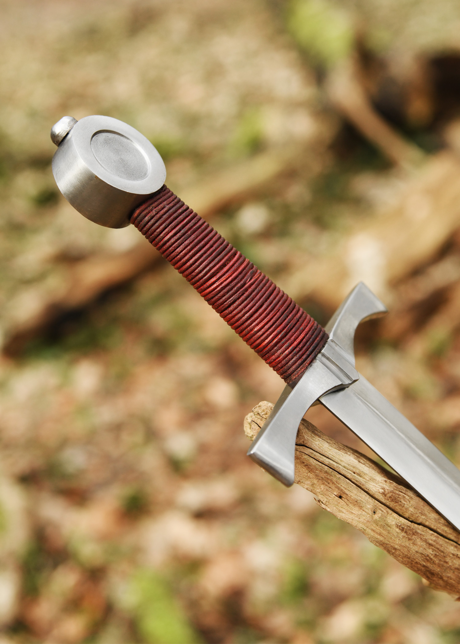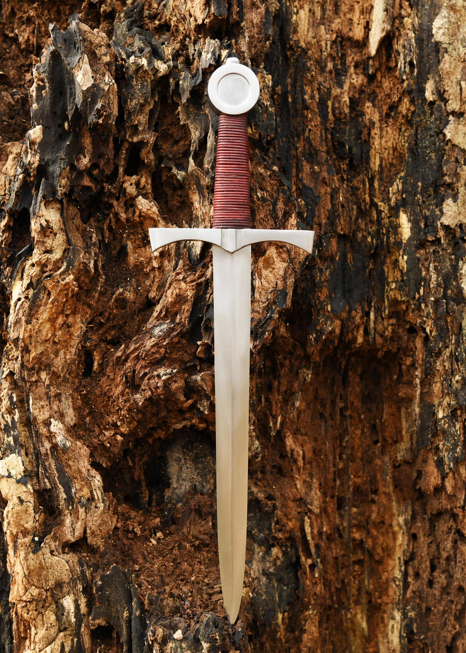 Die Klinge aus Federstahl ist bis zum Knauf durchgehend und dort unsichtbar verschraubt. Der Griff ist mit Lederband umwickelt. Die Dolchschneide ist ist nicht geschärft.