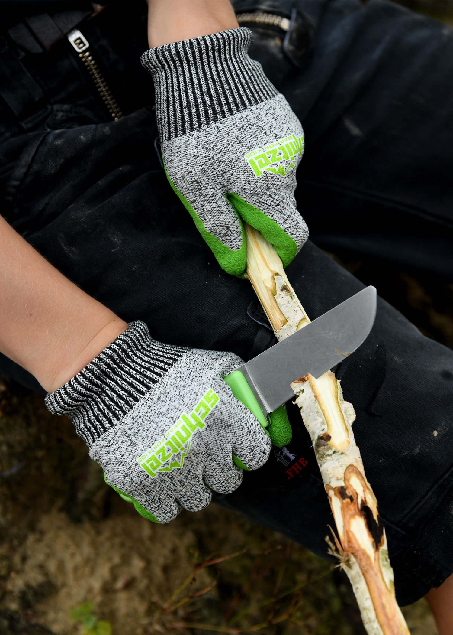 Das SCHNITZEL ist eine Fulltang-Konstruktion aus einem Stück rostfreien, schnitthaltigen und leicht nachschärfbaren Edelstahl mit Stonewash-Finish. Um die Sicherheit bei der Nutzung zu erhöhen, ist die Spitze der Klinge kindgerecht abgerundet. Die Schneide ist jedoch scharf geschliffen, denn so muss es auch sein: Das Schnitzen mit einer scharf geschliffenen Klinge minimiert das Verletzungsrisiko, da weniger Druck ausgeübt werden muss.