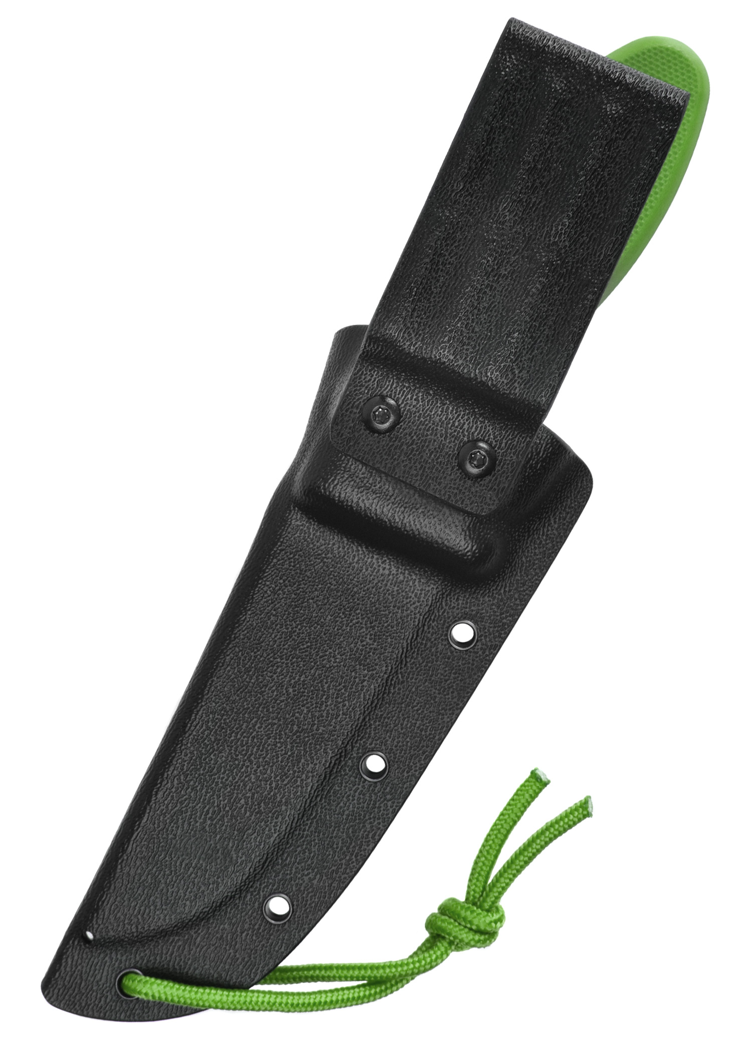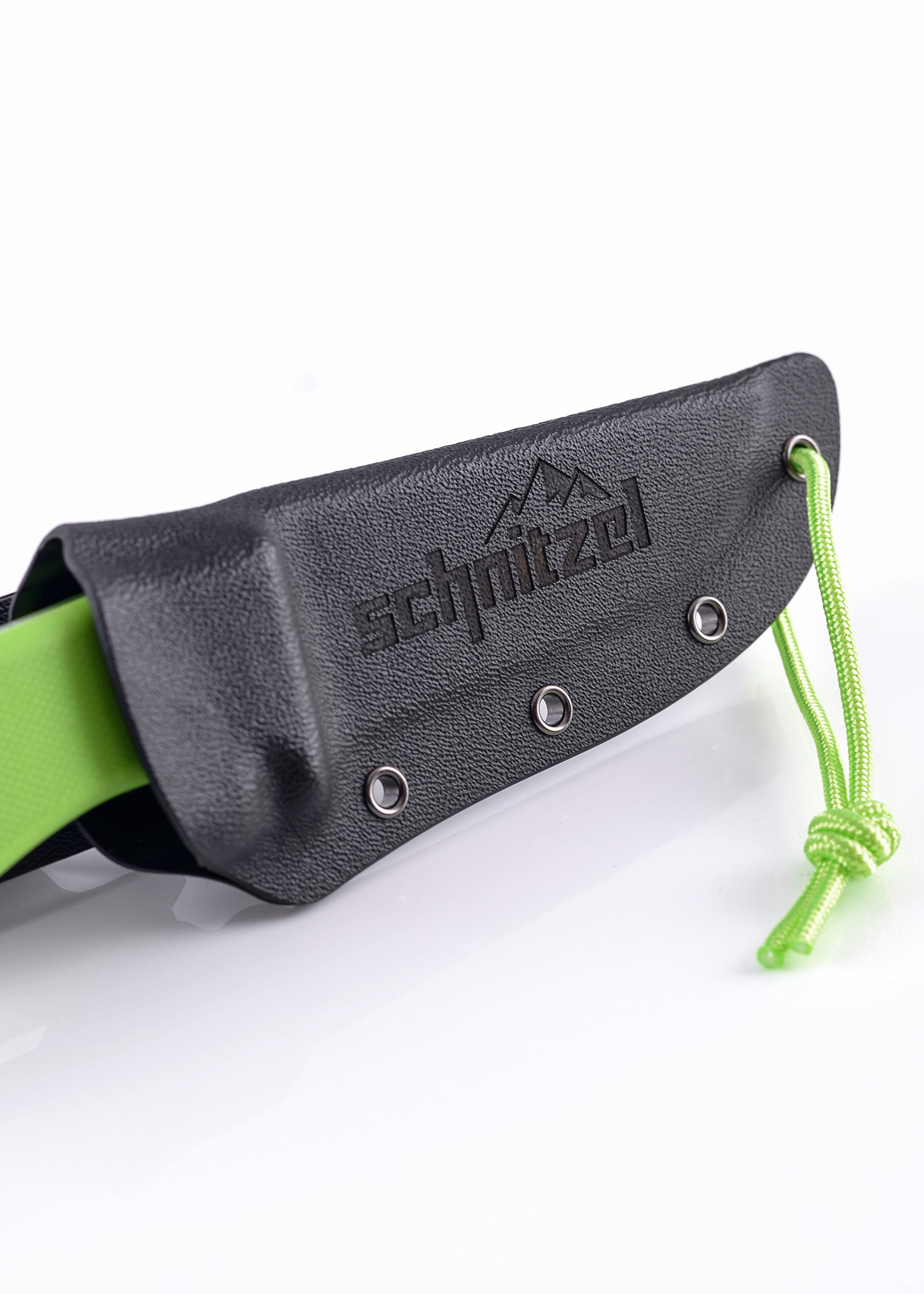Gekrönt werden die o. g. Features des Messers durch eine ultrarobuste und nahezu alles verzeihende Scheide aus Kydex-Material. Sie schließt sich wie ein Handschuh um das Messer und sorgt für ein sicheres Tragen. Die Gürtelschlaufe ist abnehmbar. Nässe, Schlamm und Kälte können ihr nichts anhaben. Ein Paracord-Lanyard in Grifffarbe rundet das Gesamtbild ab.