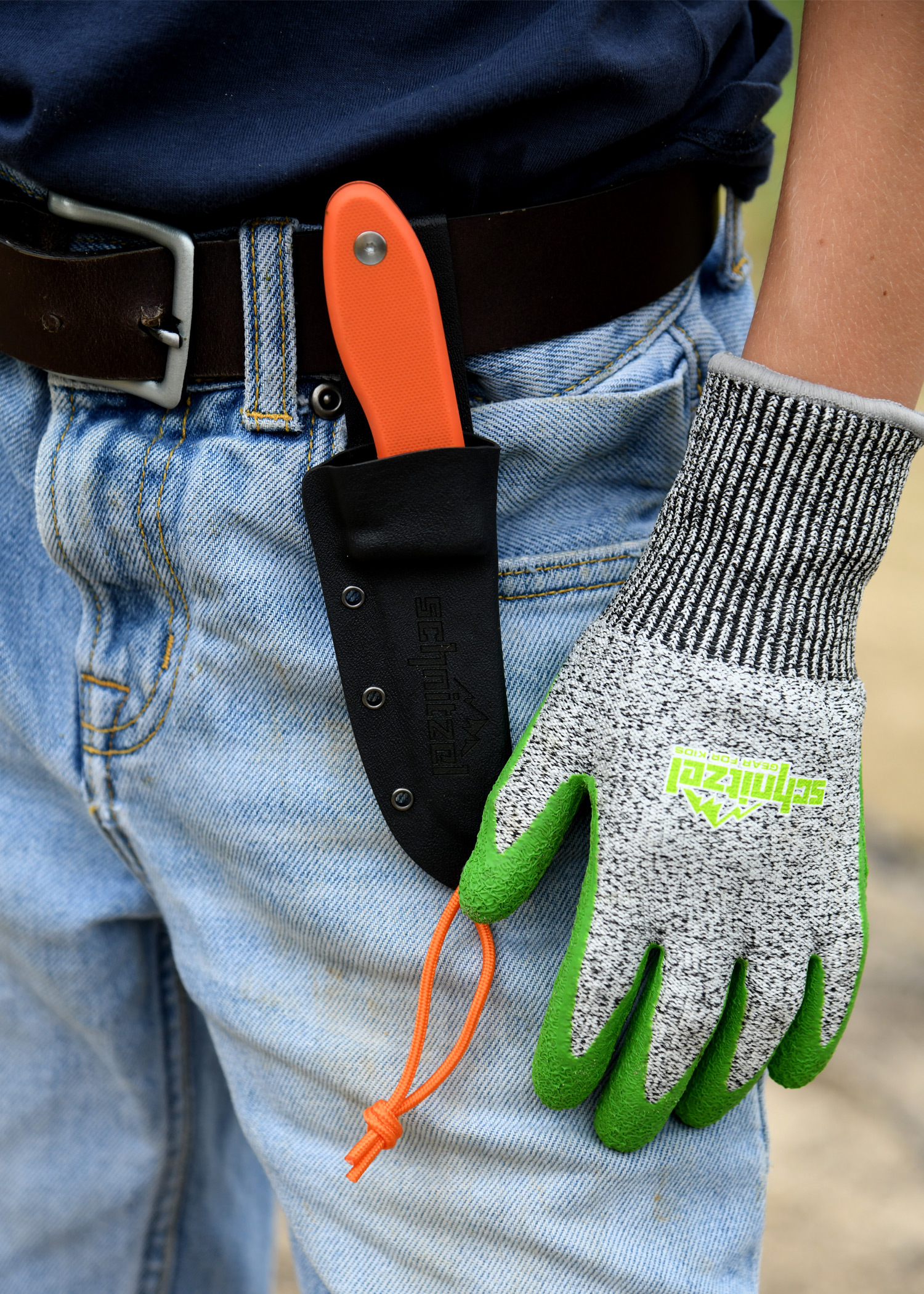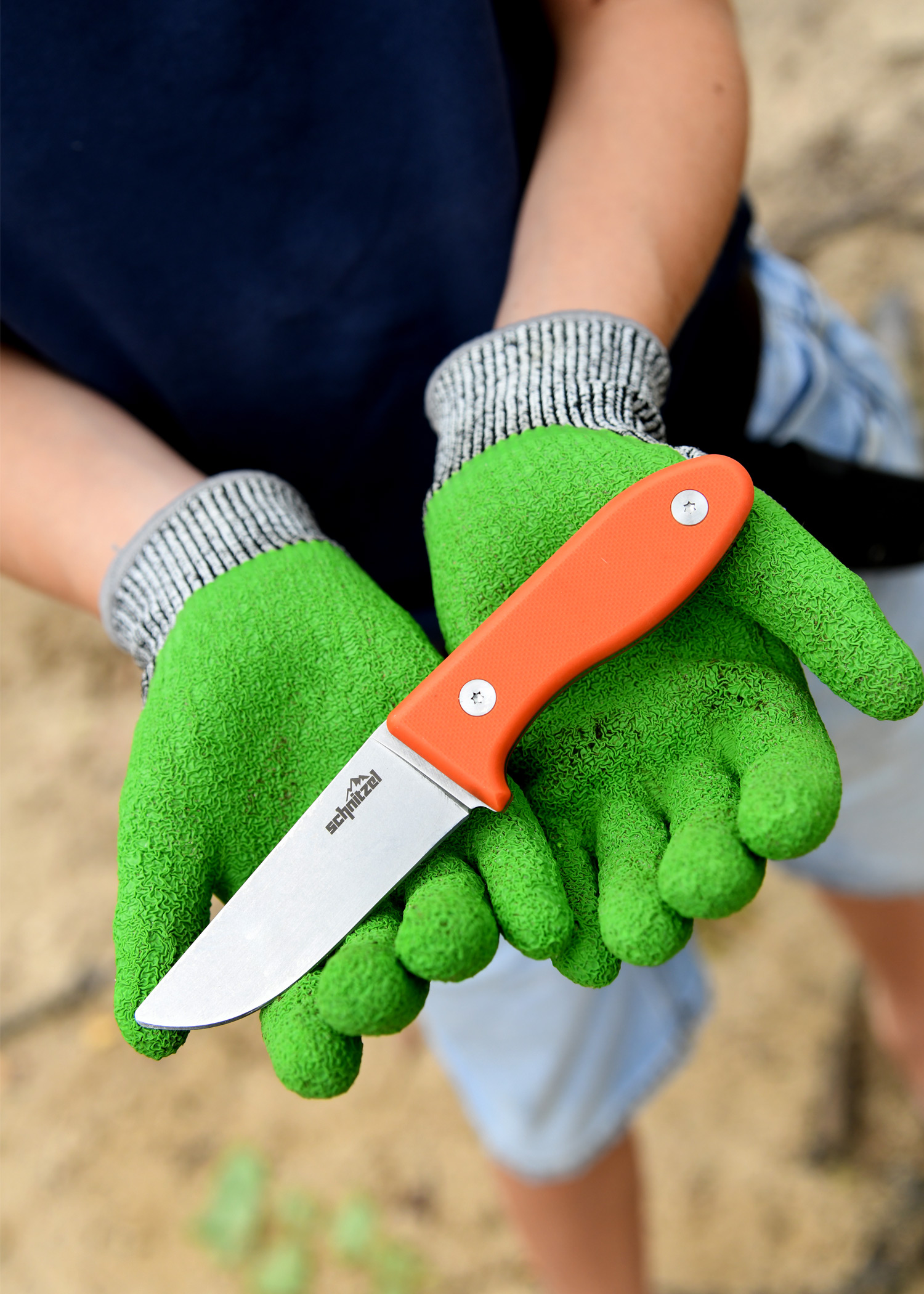 Das SCHNITZEL ist eine Fulltang-Konstruktion aus einem Stück rostfreien, schnitthaltigen und leicht nachschärfbaren Edelstahl mit Stonewash-Finish. Um die Sicherheit bei der Nutzung zu erhöhen, ist die Spitze der Klinge kindgerecht abgerundet. Die Schneide ist jedoch scharf geschliffen, denn so muss es auch sein: Das Schnitzen mit einer scharf geschliffenen Klinge minimiert das Verletzungsrisiko, da weniger Druck ausgeübt werden muss.