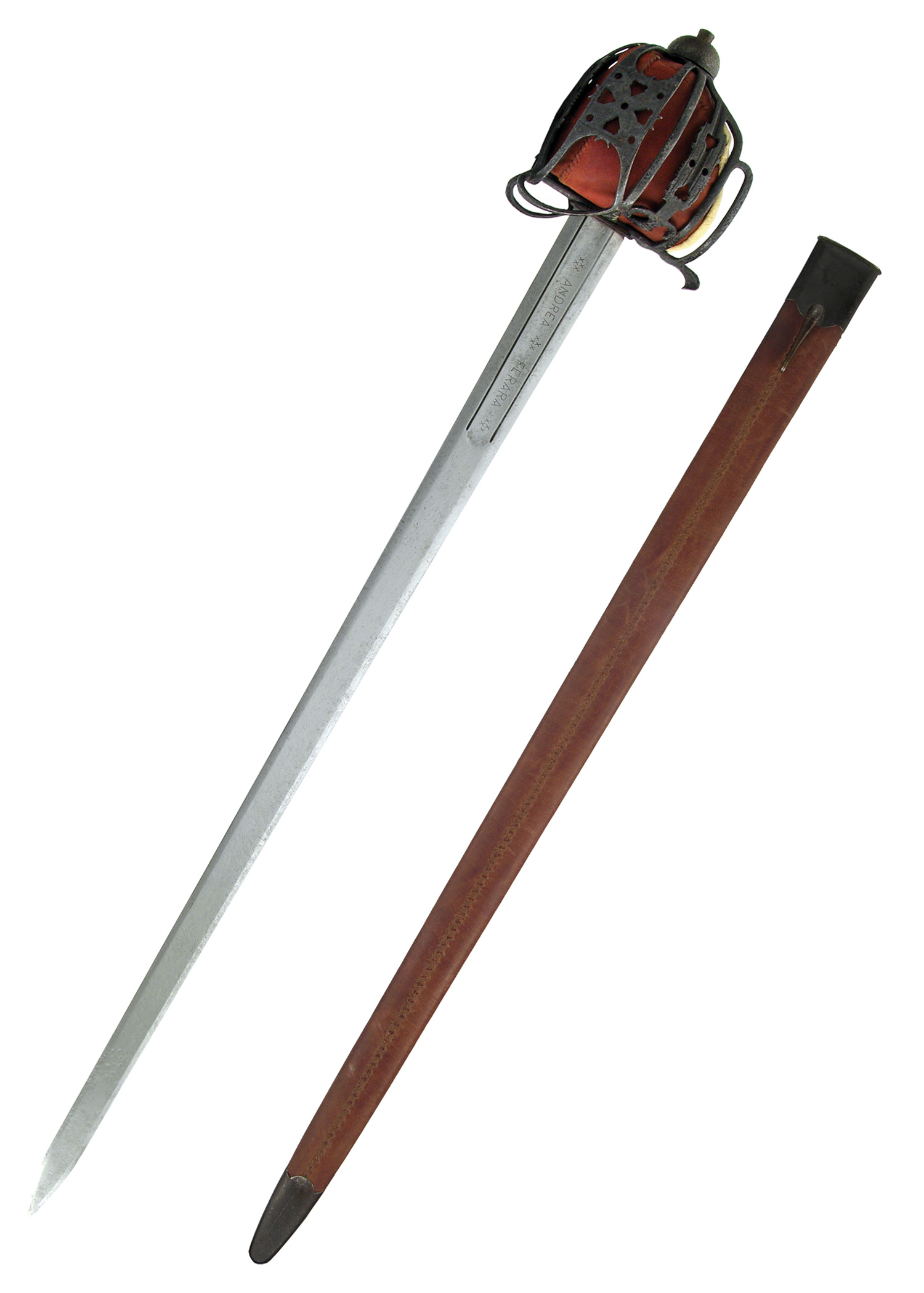 Diese Nachbildung wurde antik aufbereitet. Die Patina ihres Korbes aus pflegeleichtem Edelstahl ist von Museumsqualität. Die Klinge aus Karbonstahl wurde ebenfalls leicht auf alt gemacht, um ihr ein authentisches Aussehen zu verleihen. Die Griffpartie ist aus echtem Rochenhaut mit Drahtwicklung und das Gefäß mit stoffbezogenem Leder ausgekleidet. Eine lederbezogene Scheide ist im Lieferumfang enthalten.