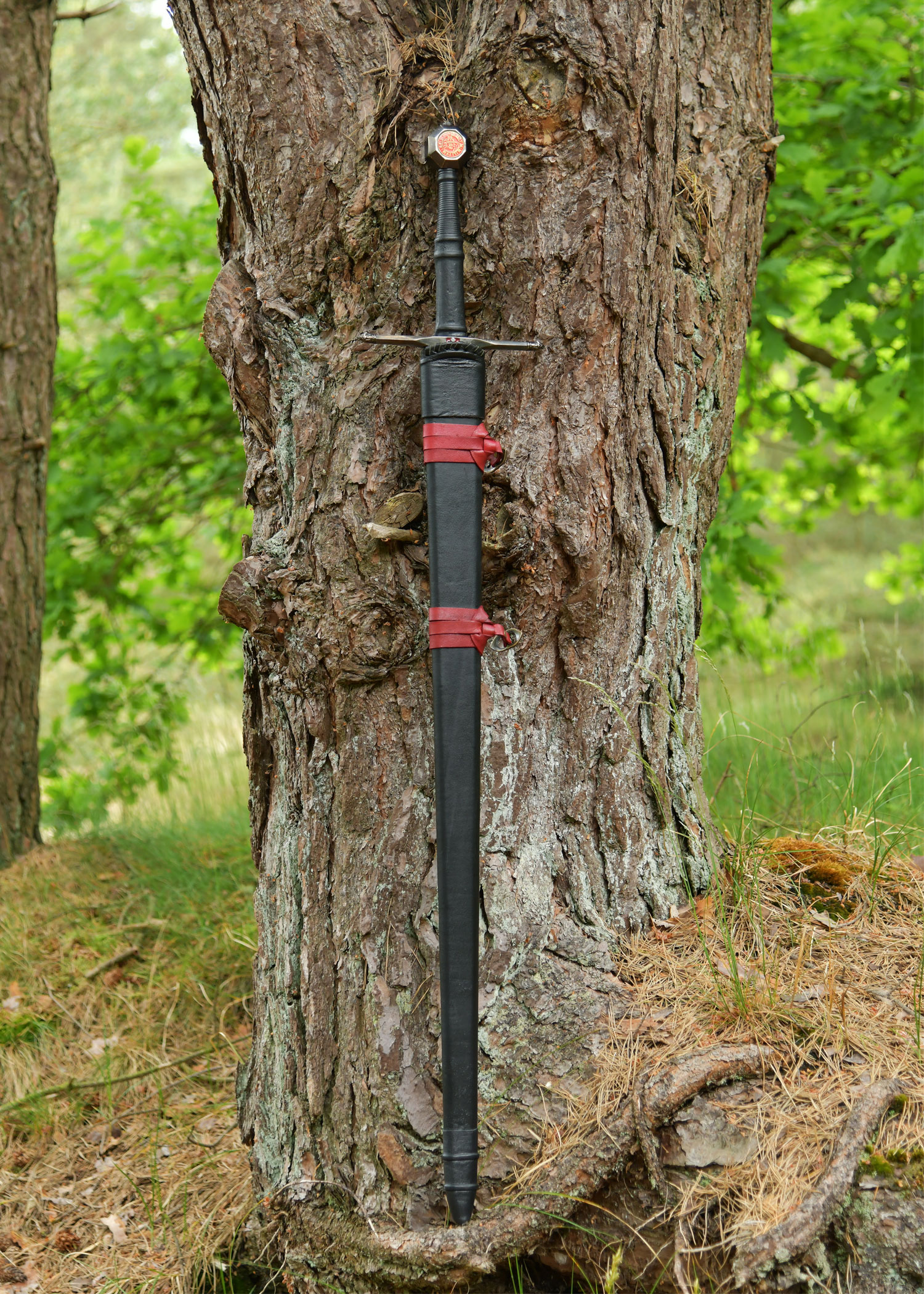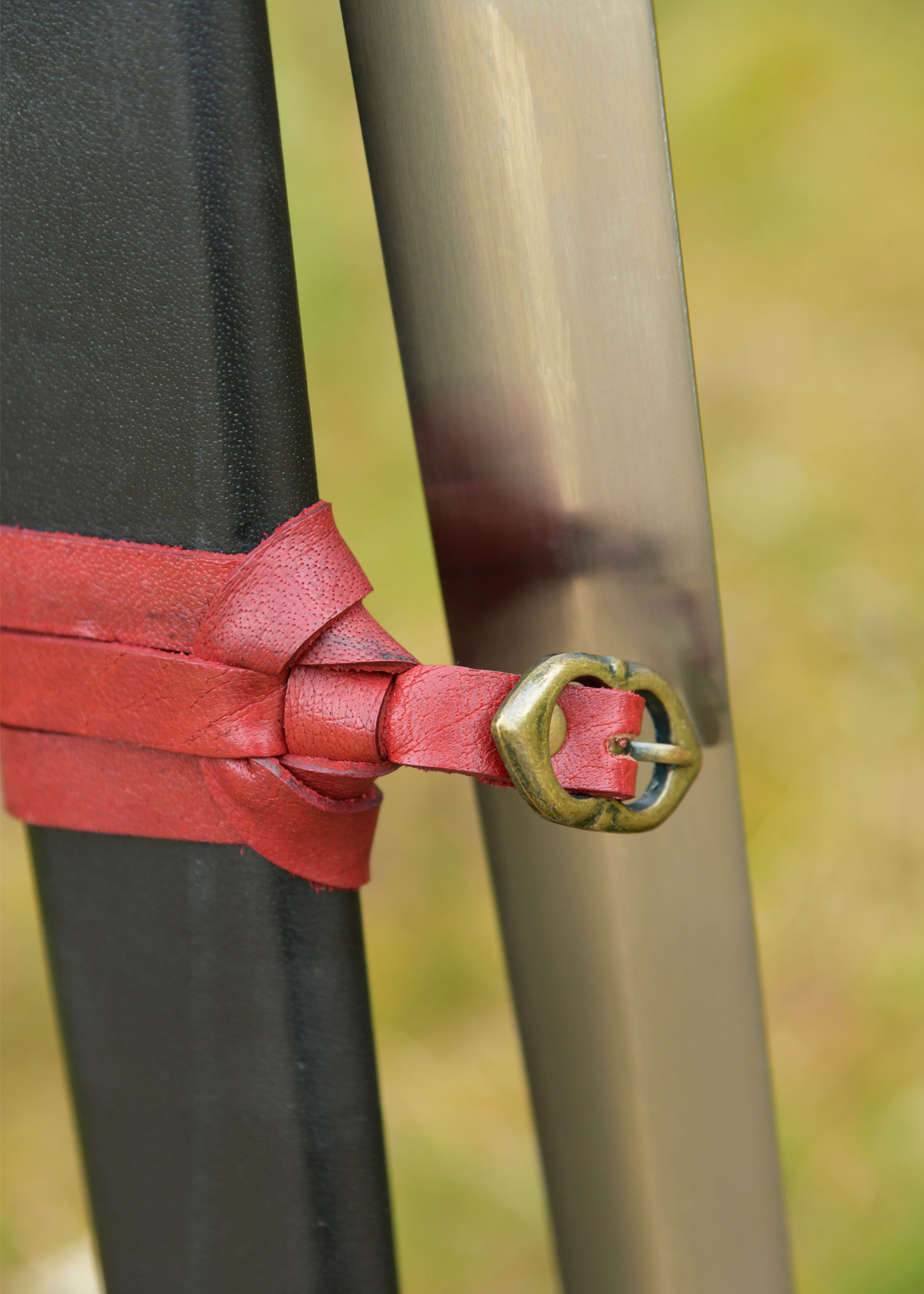 Geliefert wird das Ritterschwert inklusive einer schönen Schwertscheide aus Holz mit schwarzem Lederbezug. Zwei rote Lederbänder mit Messingschnallen im Antik-Finish setzten nicht nur dekorative Akzente, sondern ermöglichen auch die einfache Befestigung eines Schwertgürtels.