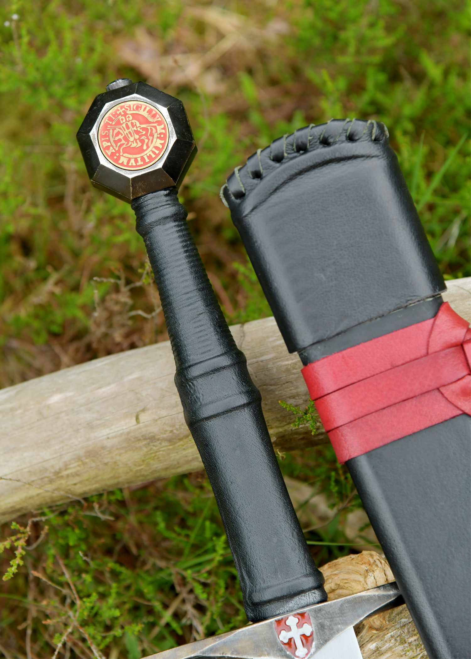 Ein besonderes Detail ist der oktogonale Knauf. In seiner Mitte befindet sich ein rot emailliertes Wappen des Templerordens, das zwei Ritter auf einem Pferd zeigt. Umrahmt wird dieses Motiv von der lateinischen Inschrift „MILITUM XPISTI SIGILLUM“, was übersetzt „Siegel der Soldaten Christi“ bedeutet.