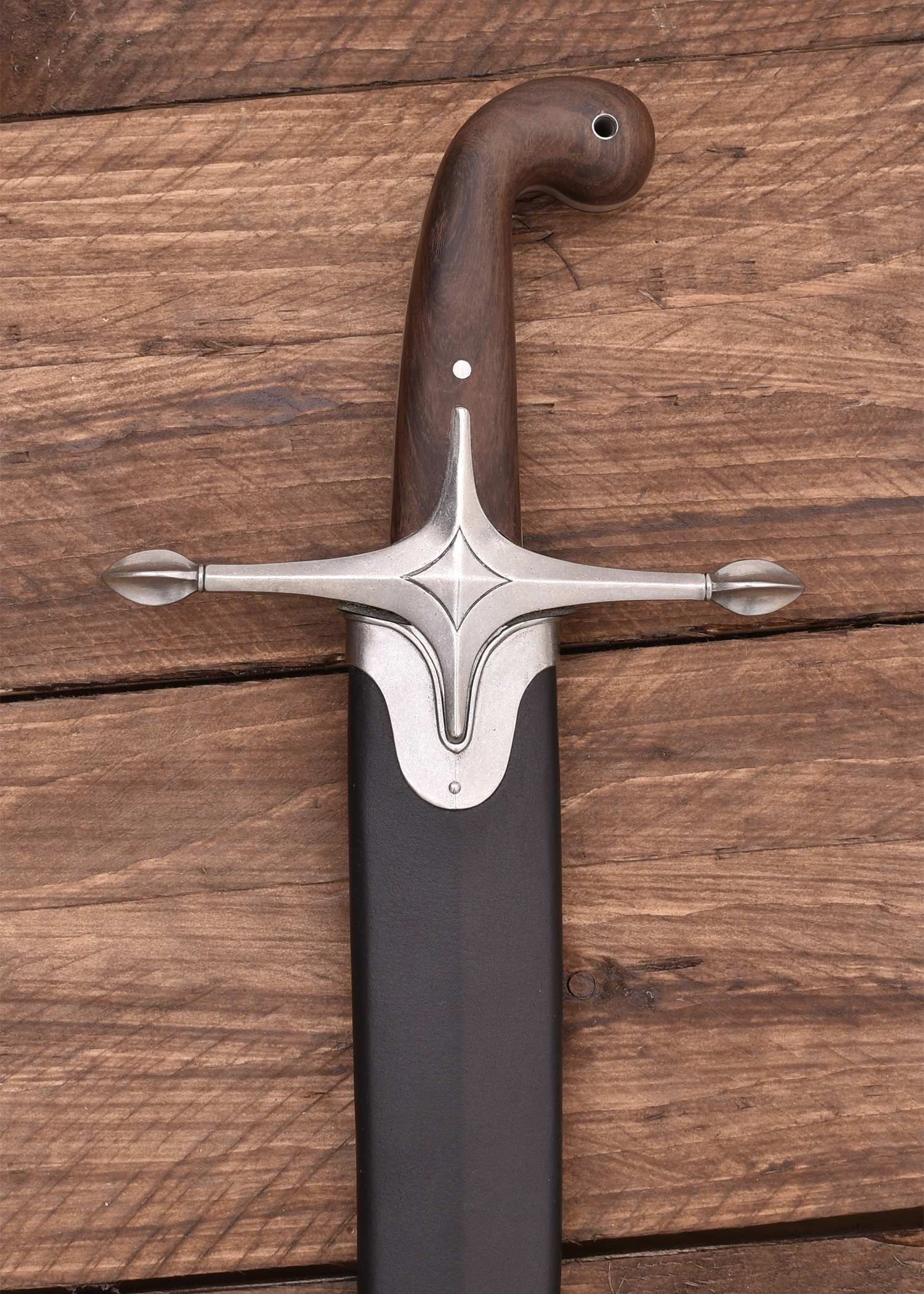 Dieser Shamshir besitzt eine geschärfte Klinge aus Kohlenstoffstahl. Der Gebogene, kugelförmig gearbeitete Knauf ist zusammen mit dem Griff aus zwei Stücken Holz hergestellt welche sich an die Angel schmiegen. Die Schwertscheide besteht aus lederumwickeltem Holz und bietet ein Ort- und Mundblech sowie Tragringe aus Stahl.