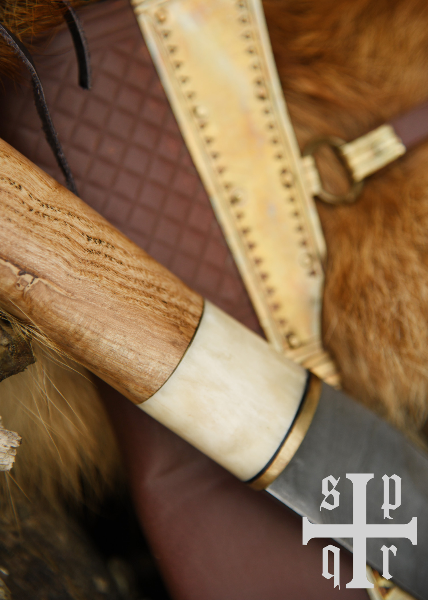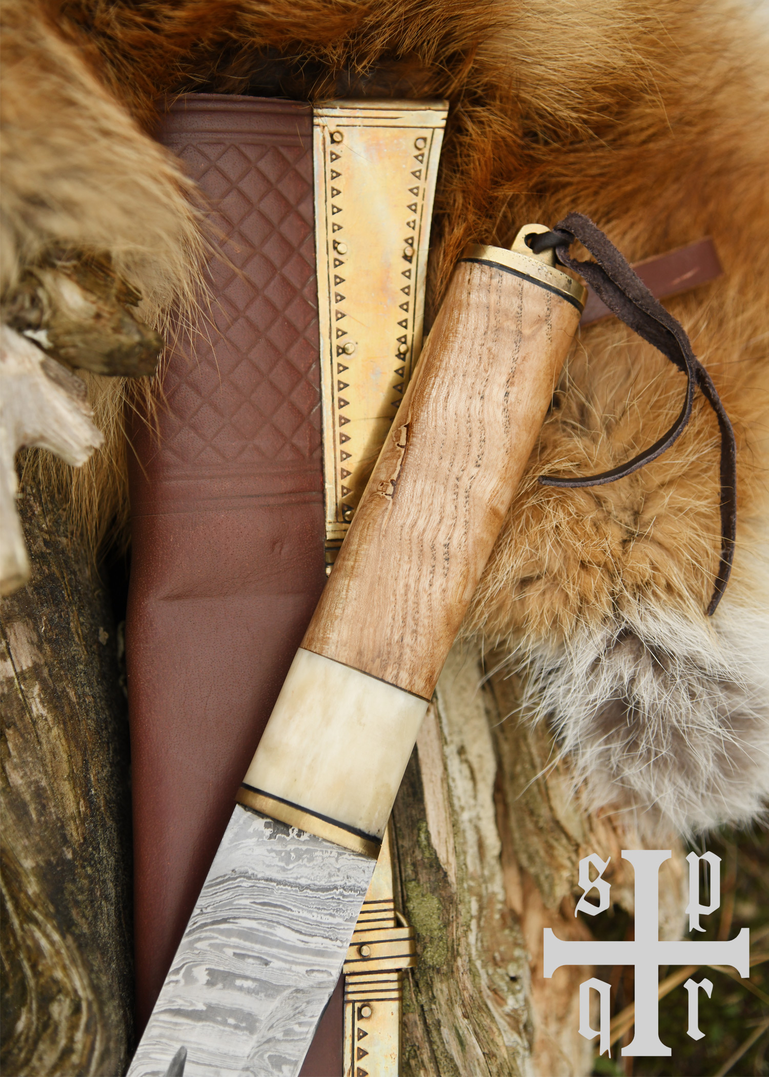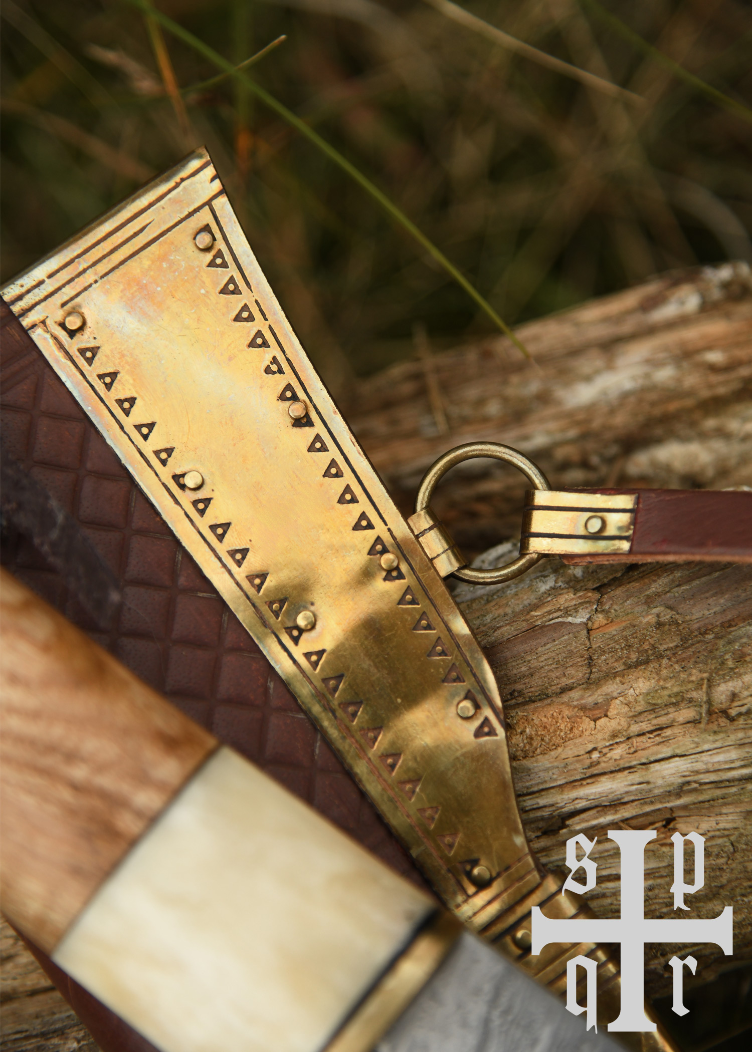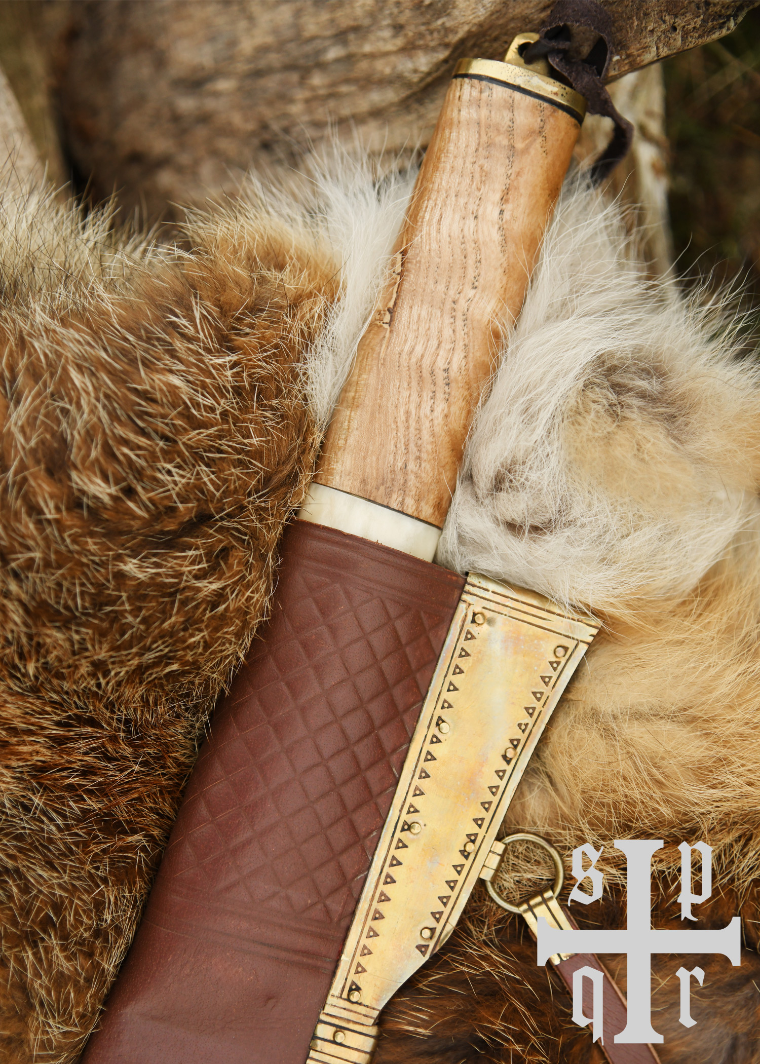 Die wunderschöne Scheide aus Leder ist mit Messingbeschlägen reich verziert. Dank zweier an Messingringe angebrachten Lederschlaufen lässt sich der Sax im typischen Wikingerstil horizontal am Gürtel tragen.