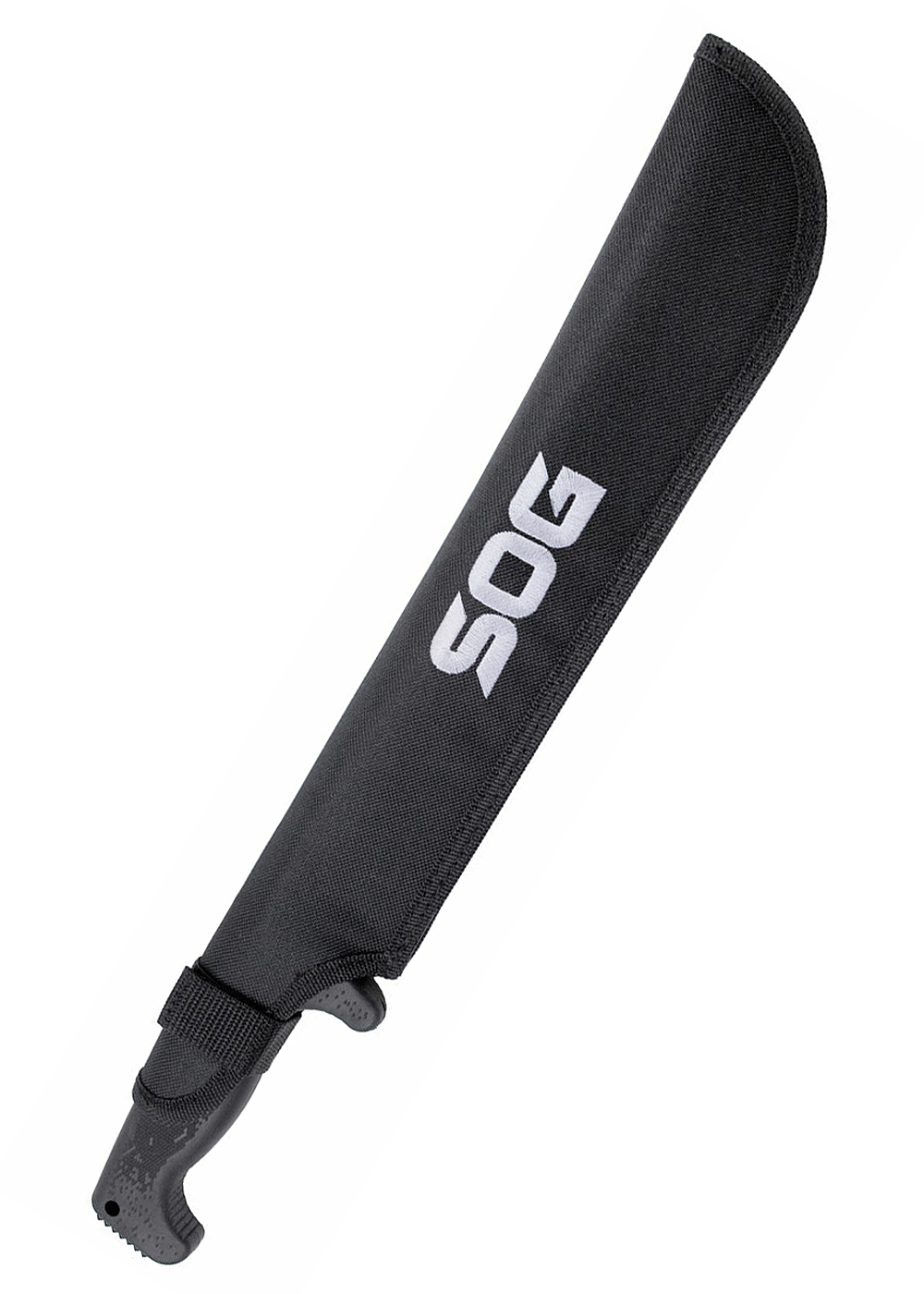 Die SOGfari Machete besteht aus schwarzem 3Cr13-Stahl und verfügt über einen gezahnten Rücken. Der texturierte Griff aus Kraton eignet sich perfekt für die Outdoor Arbeit. Die Löcher im Griff ermöglichen das Montieren von Tragebändern, um es einfach transportieren zu können.