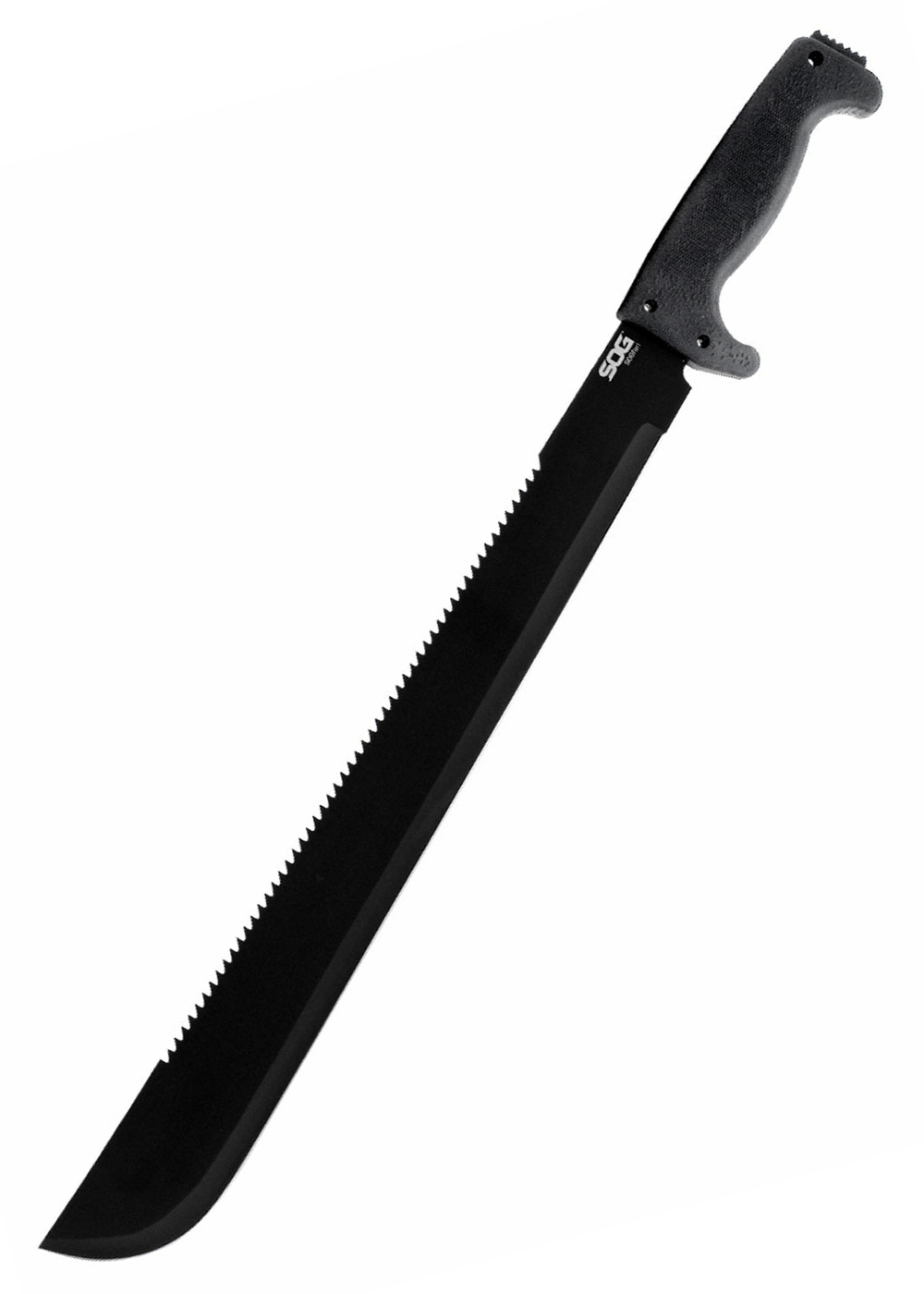 Die SOGfari Machete besteht aus schwarzem 3Cr13-Stahl und verfügt über einen gezahnten Rücken. Der texturierte Griff aus Kraton eignet sich perfekt für die Outdoor Arbeit. Die Löcher im Griff ermöglichen das Montieren von Tragebändern, um es einfach transportieren zu können.