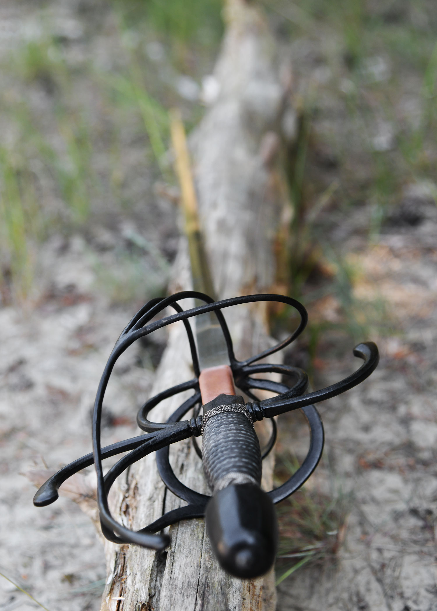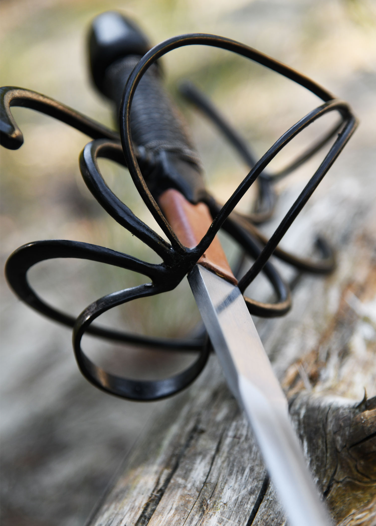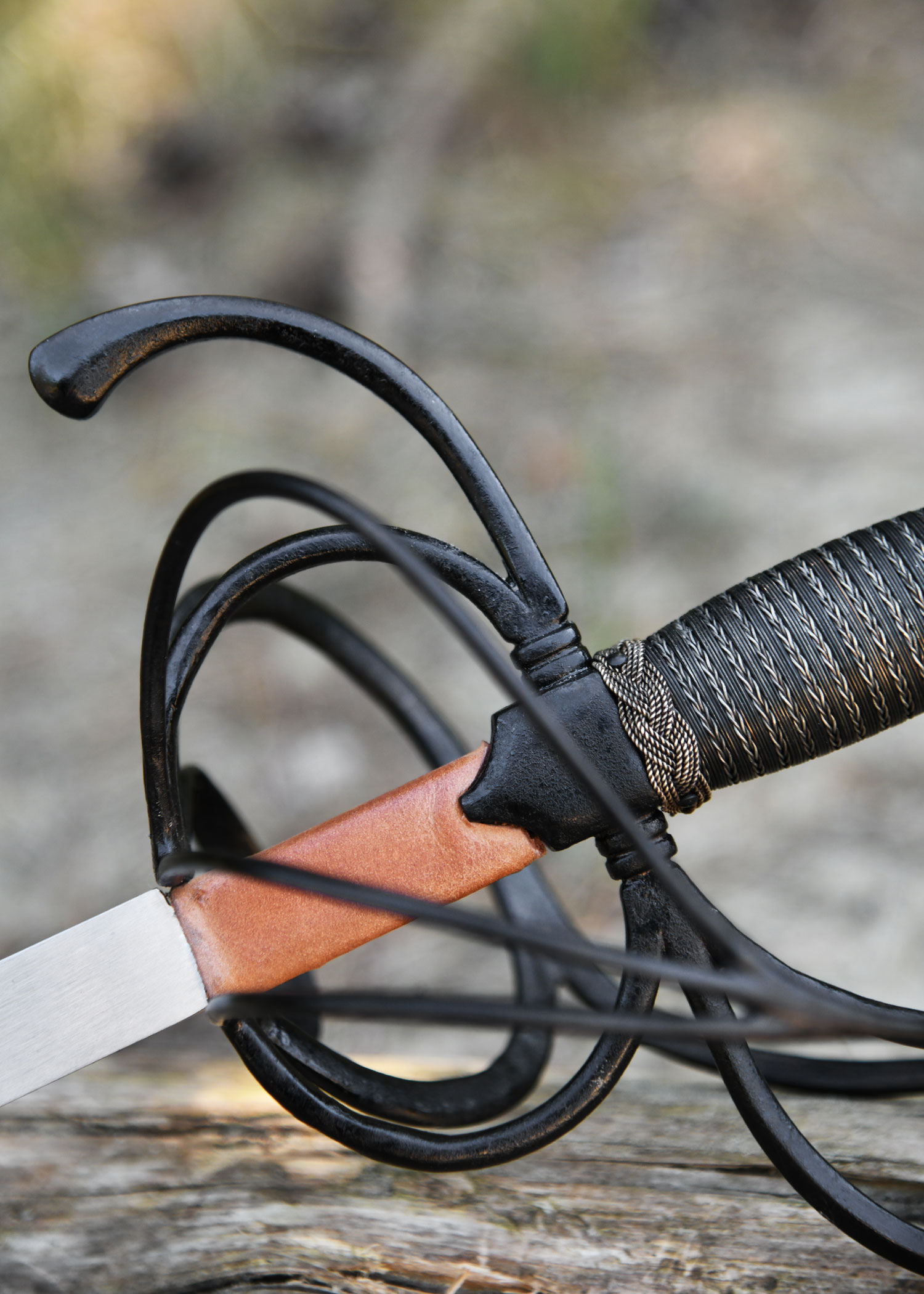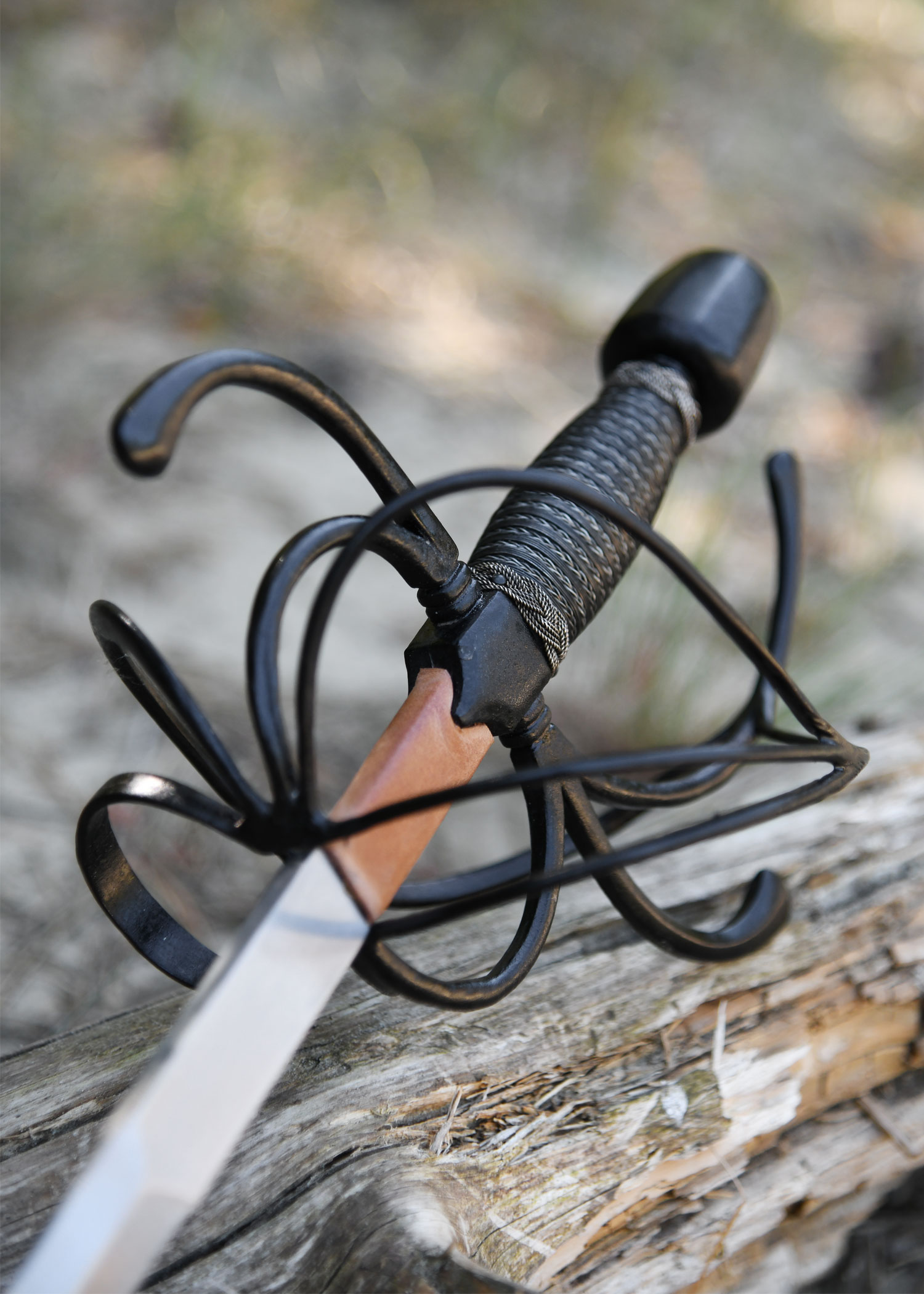 Das Swept Hilt Rapier - Rapier mit Korbgriff bzw. Spangengefäß - von Hanwei (Artikelnr. SH2205) verfügt über klassische Linien. Die Klinge ist aus flexibel gehärtetem Karbonstahl. Im Sinne eines geringen Pflegeaufwands ist das Heft aus rostfreiem Stahl hergestellt. Die besondere Parierstange kann als Klingenfänger (blade catcher) dienen, und der Griff ist mit verdrilltem Draht umwickelt. Da das Gefäß in genau derselben Größe angefertigt wurde wie die deutsche Originalvorlage aus dem 17. Jahrhundert, bietet es eine authentische Haptik und kommt auch im Hinblick auf Gewicht und Balance seinem Vorbild gleich.