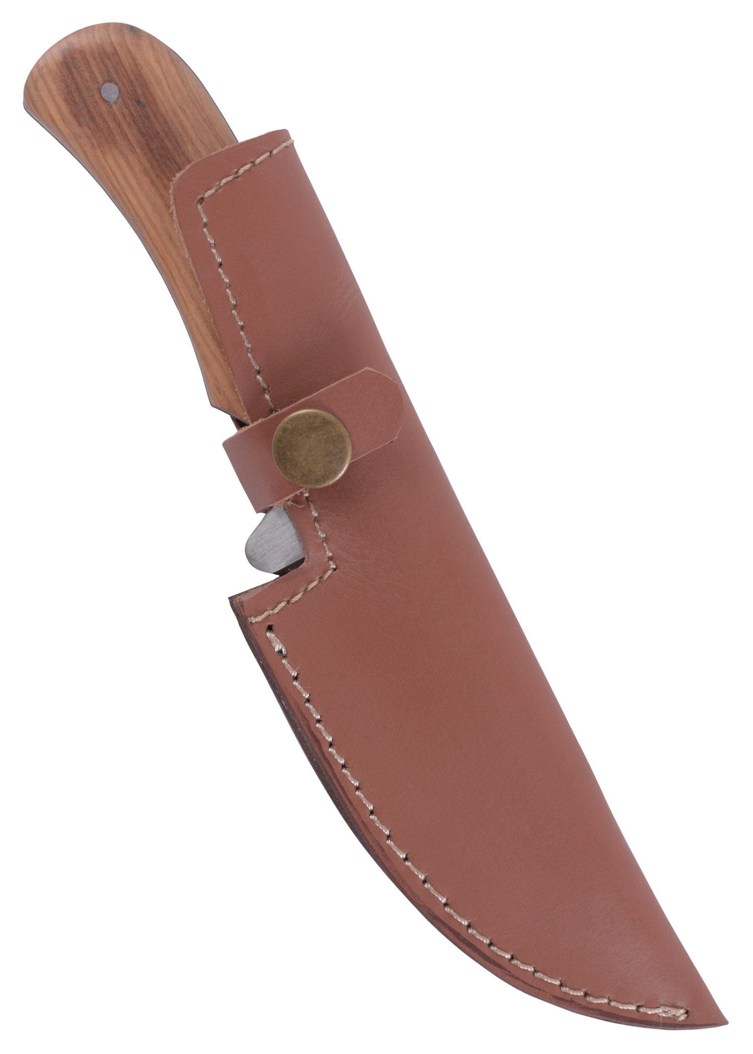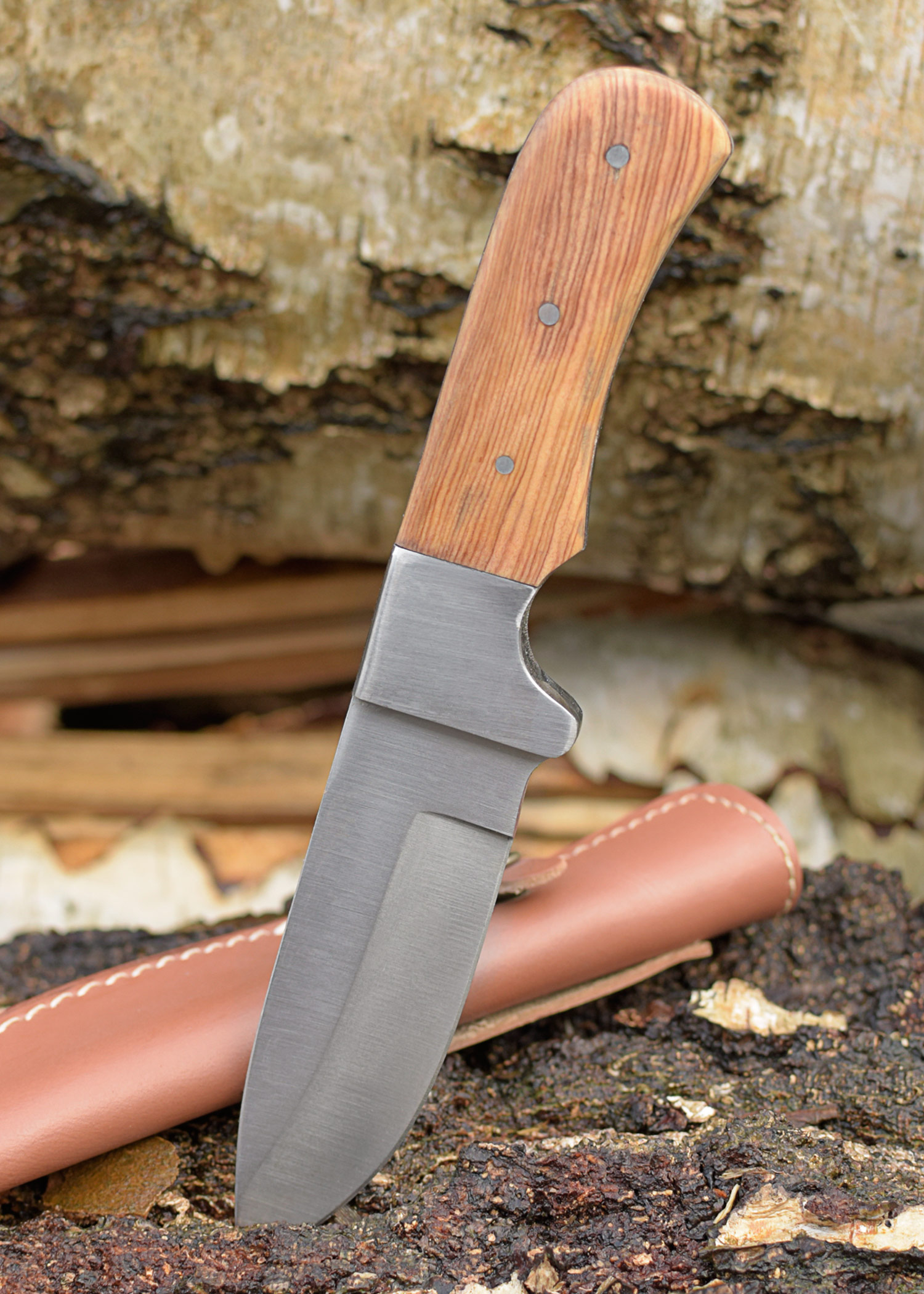 Praktisches Jagd- und Outdoortmesser mit Droppoint-Klinge aus 440er rostfreiem Stahl. Die Klinge geht bis zum Ende durch. Die Griffschalen aus schön maserieretem Olivenholz sind auf den Erl genietet.