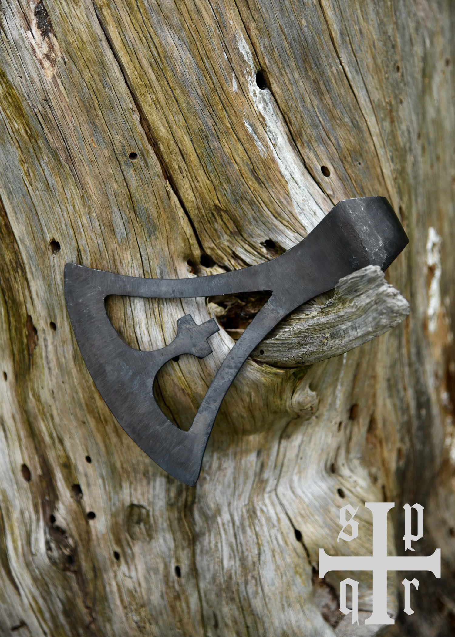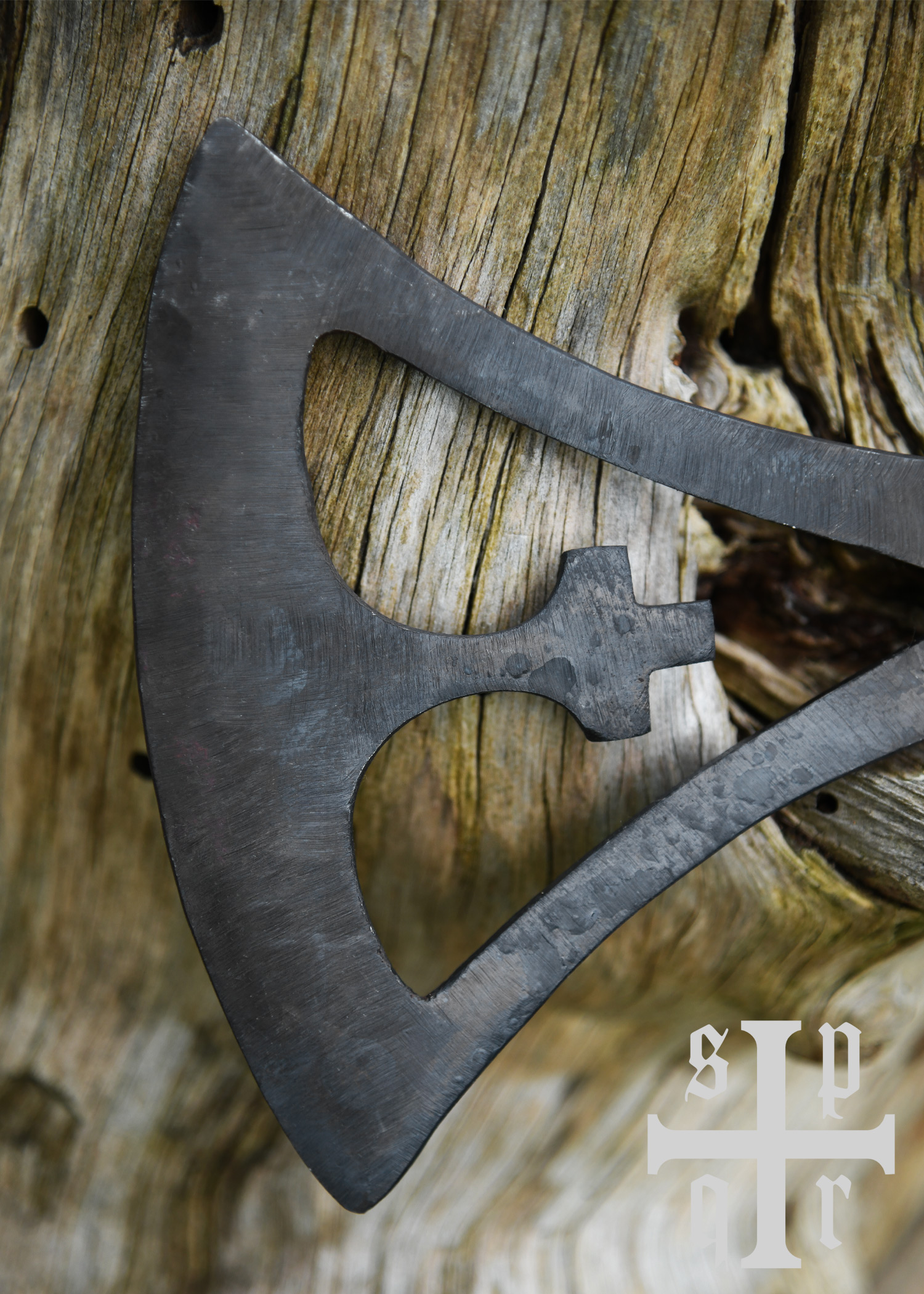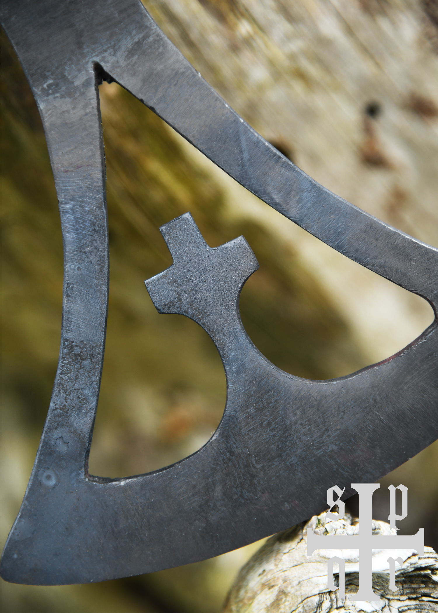 Das breite Axtblatt ist aus Karbonstahl geschmiedet, besitzt eine stumpfe Schneide und weist einen offenen Abschnitt auf, der in der Mitte ein Kreuz bildet. Die schmiedeschwarze Zunderschicht verleiht der Wikingeraxt einen rustikalen, authentischen Charakter.