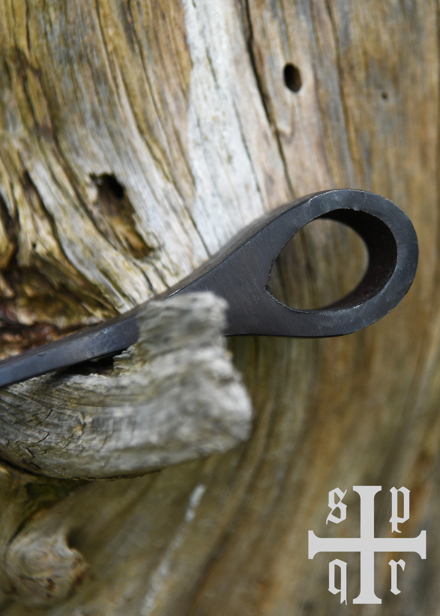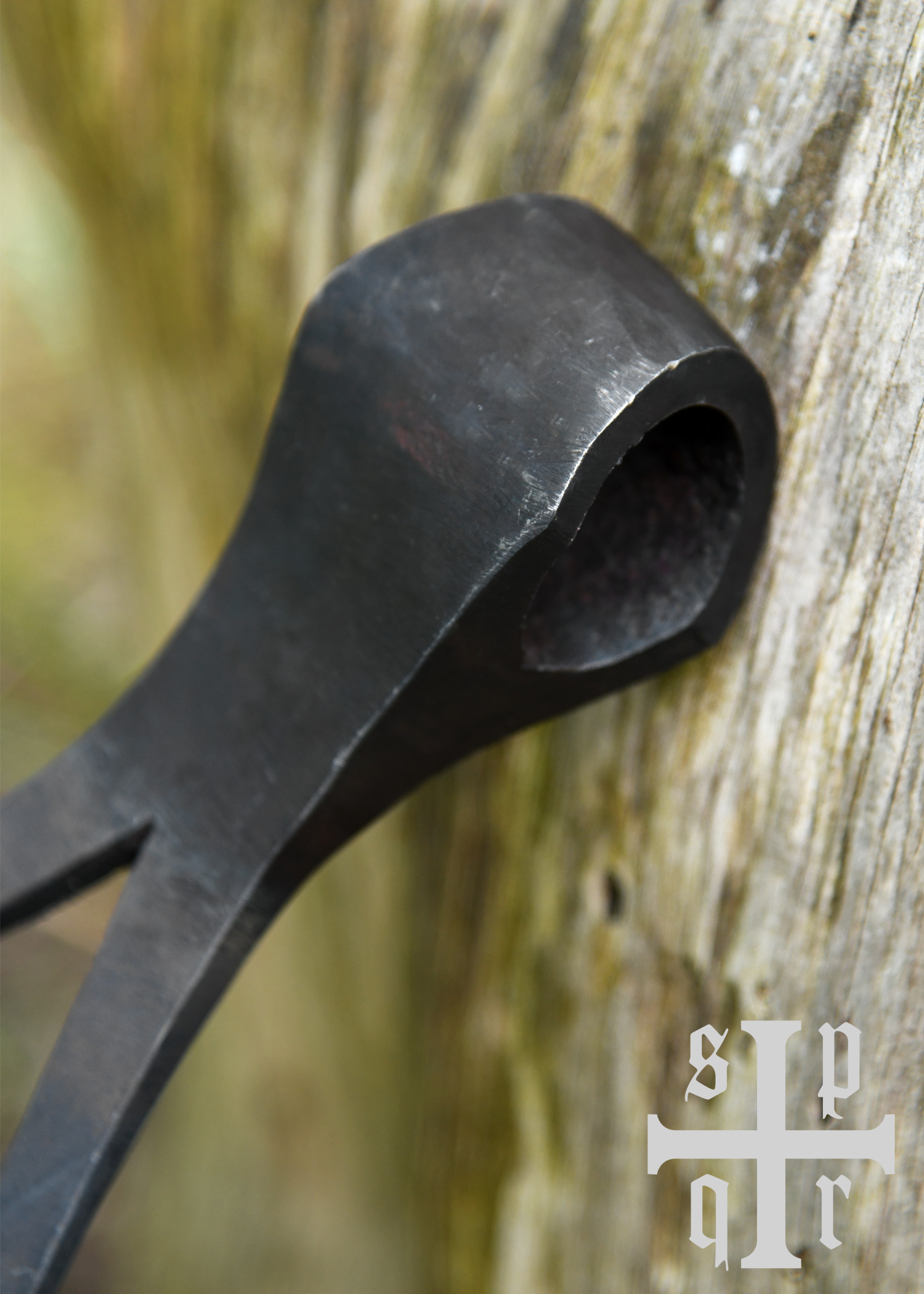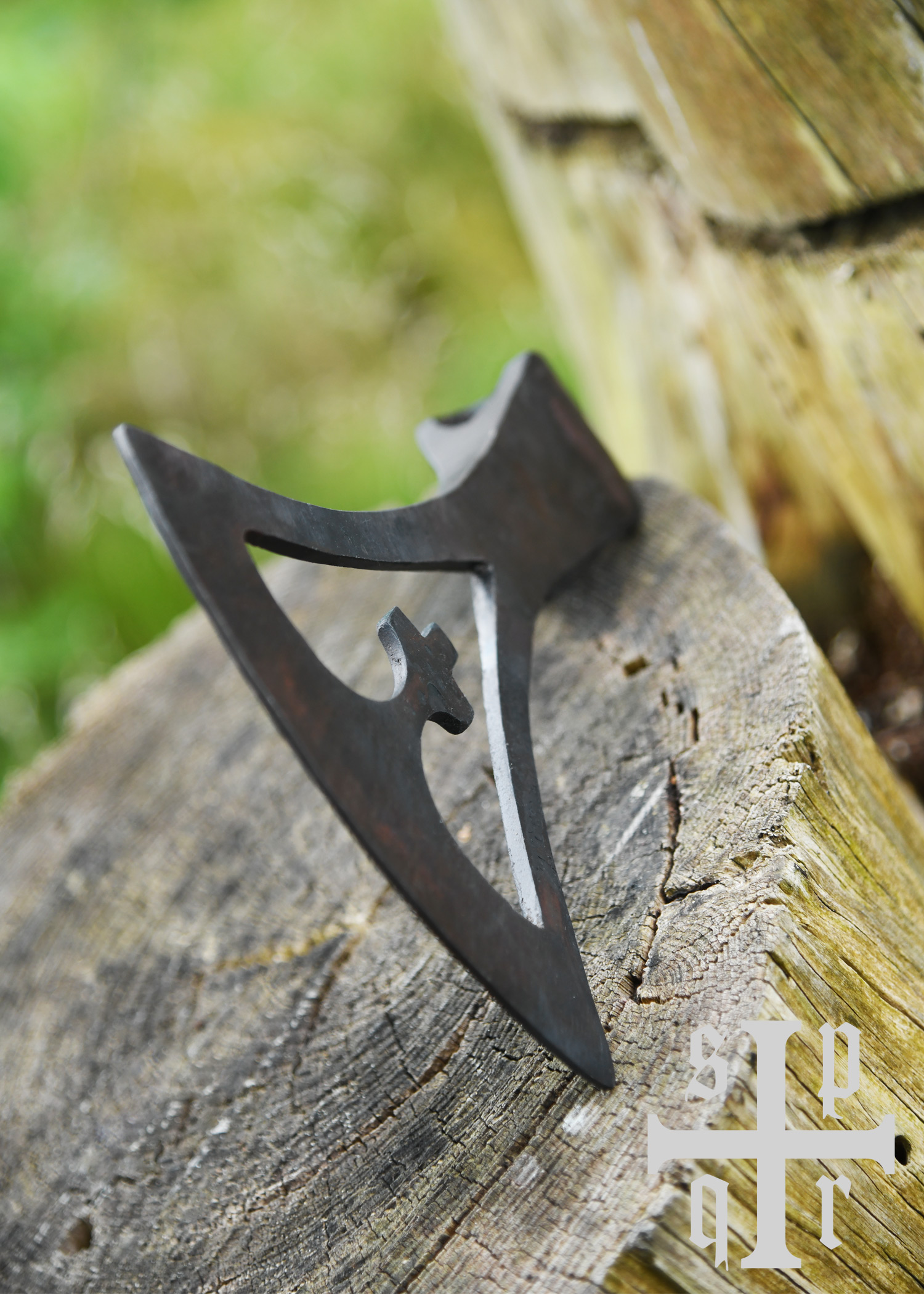 Das breite Axtblatt ist aus Karbonstahl geschmiedet, besitzt eine stumpfe Schneide und weist einen offenen Abschnitt auf, der in der Mitte ein Kreuz bildet. Die schmiedeschwarze Zunderschicht verleiht der Wikingeraxt einen rustikalen, authentischen Charakter.