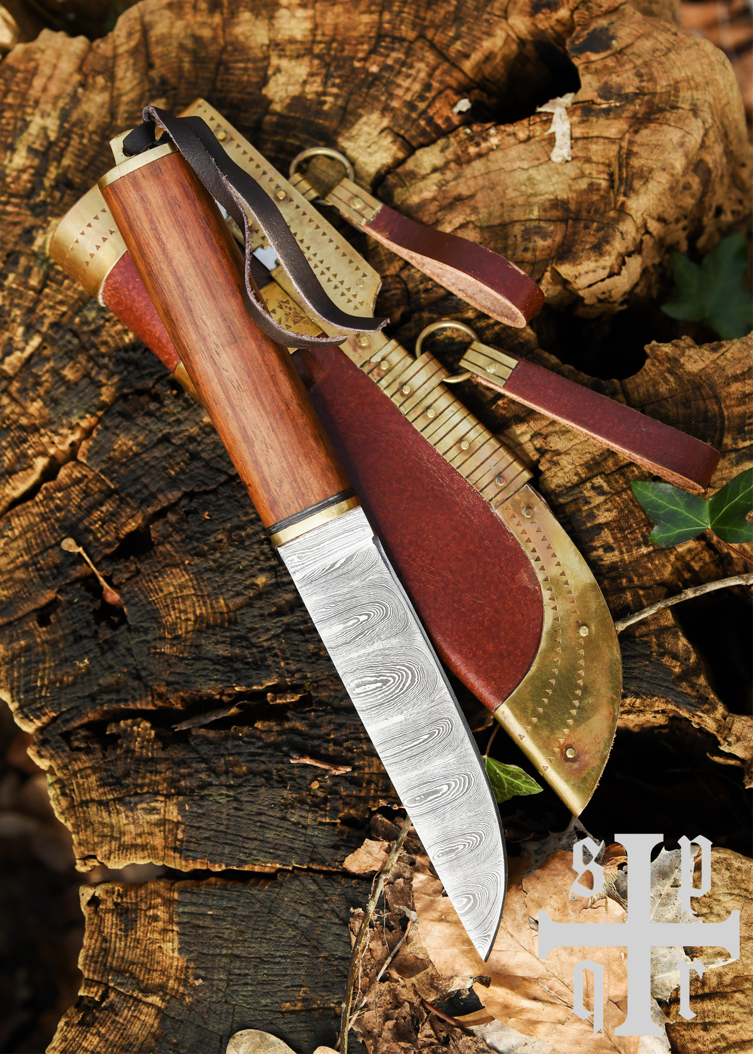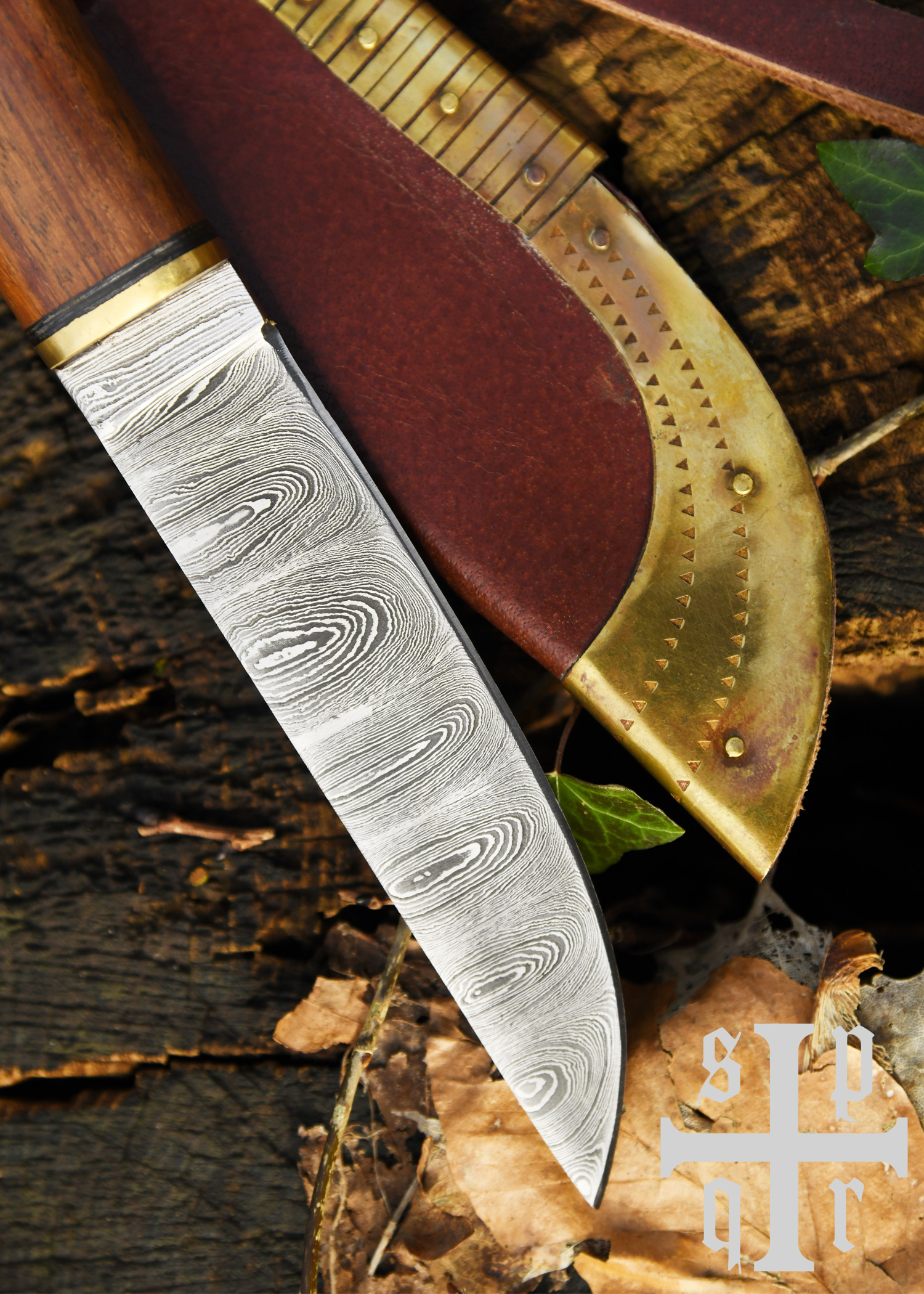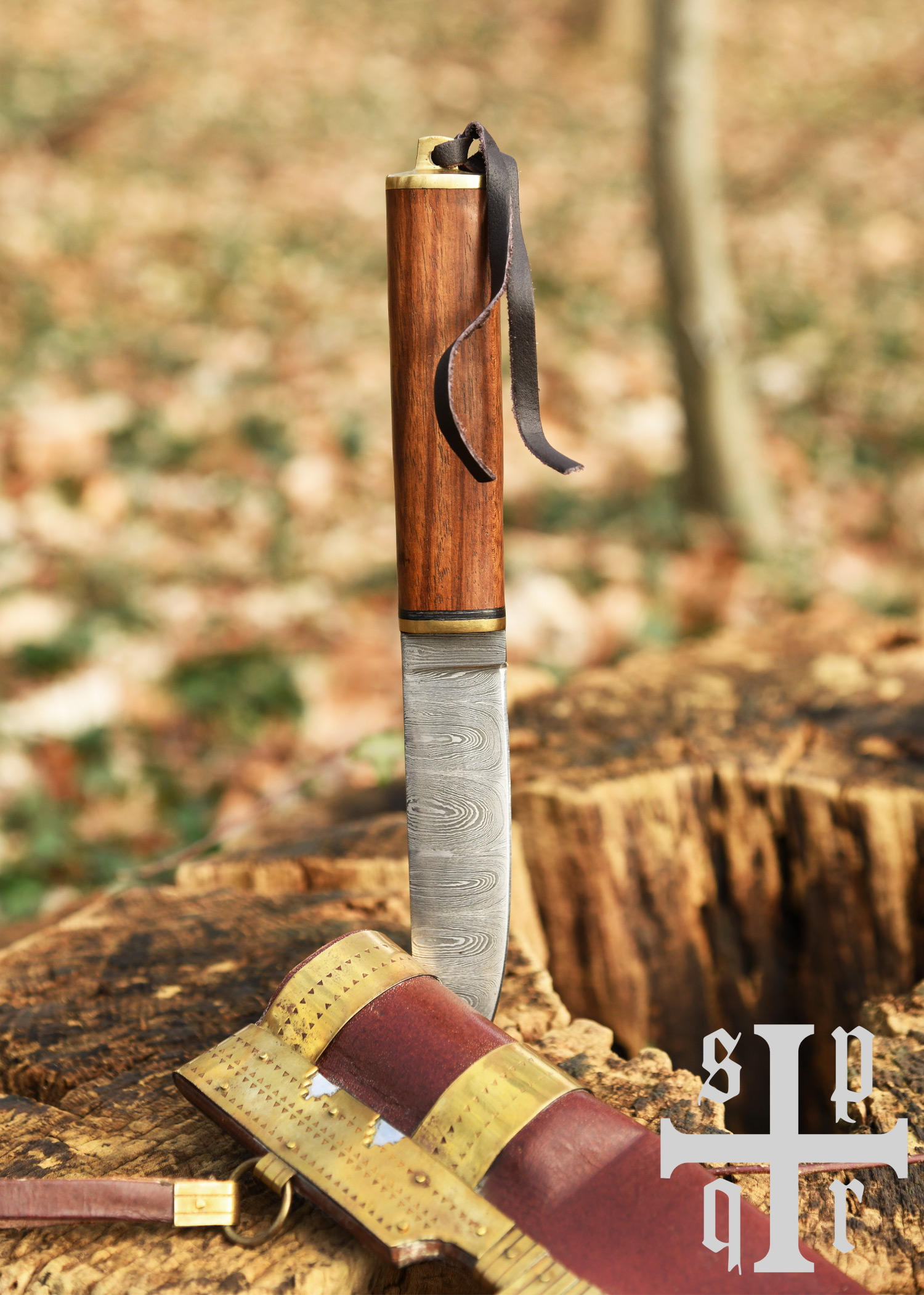 Dieses handgefertigte wikingerzeitliche Messer (Sax) besitzt eine scharfe Klinge aus 256-Lagen-Damaststahl und einen Griff aus Holz mit Endkappe und Zwinge aus Messing. Zum Lieferumfang gehört eine wunderschöne Scheide aus gegerbtem Leder mit reich verzierten Messingbeschlägen. Dank zweier an Messingringe angebrachten Lederschlaufen lässt sich das Messer im typischen Wikingerstil horizontal am Gürtel tragen.