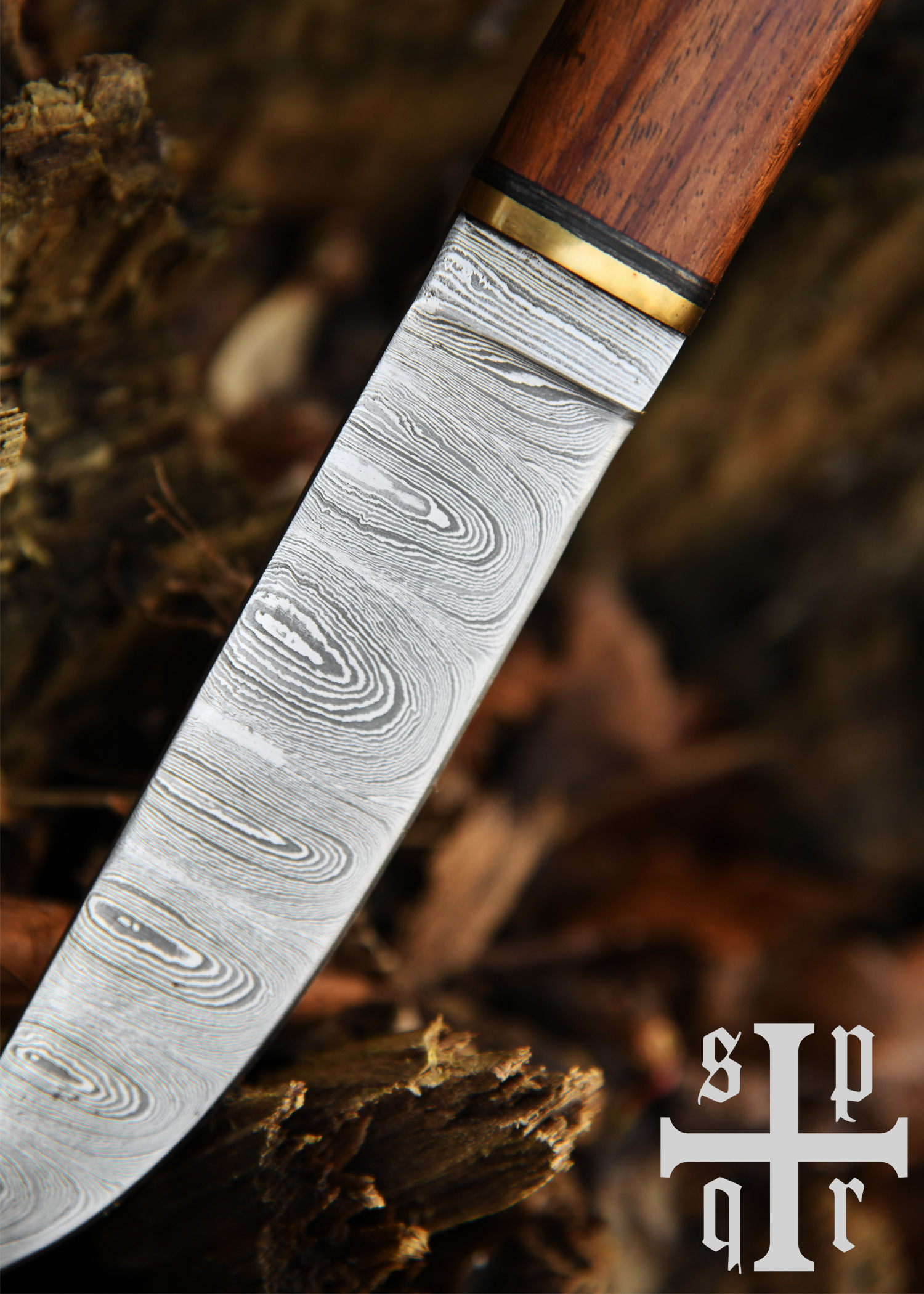 - Klingenmaterial: Damaststahl (256 Lagen), scharfe Schneide