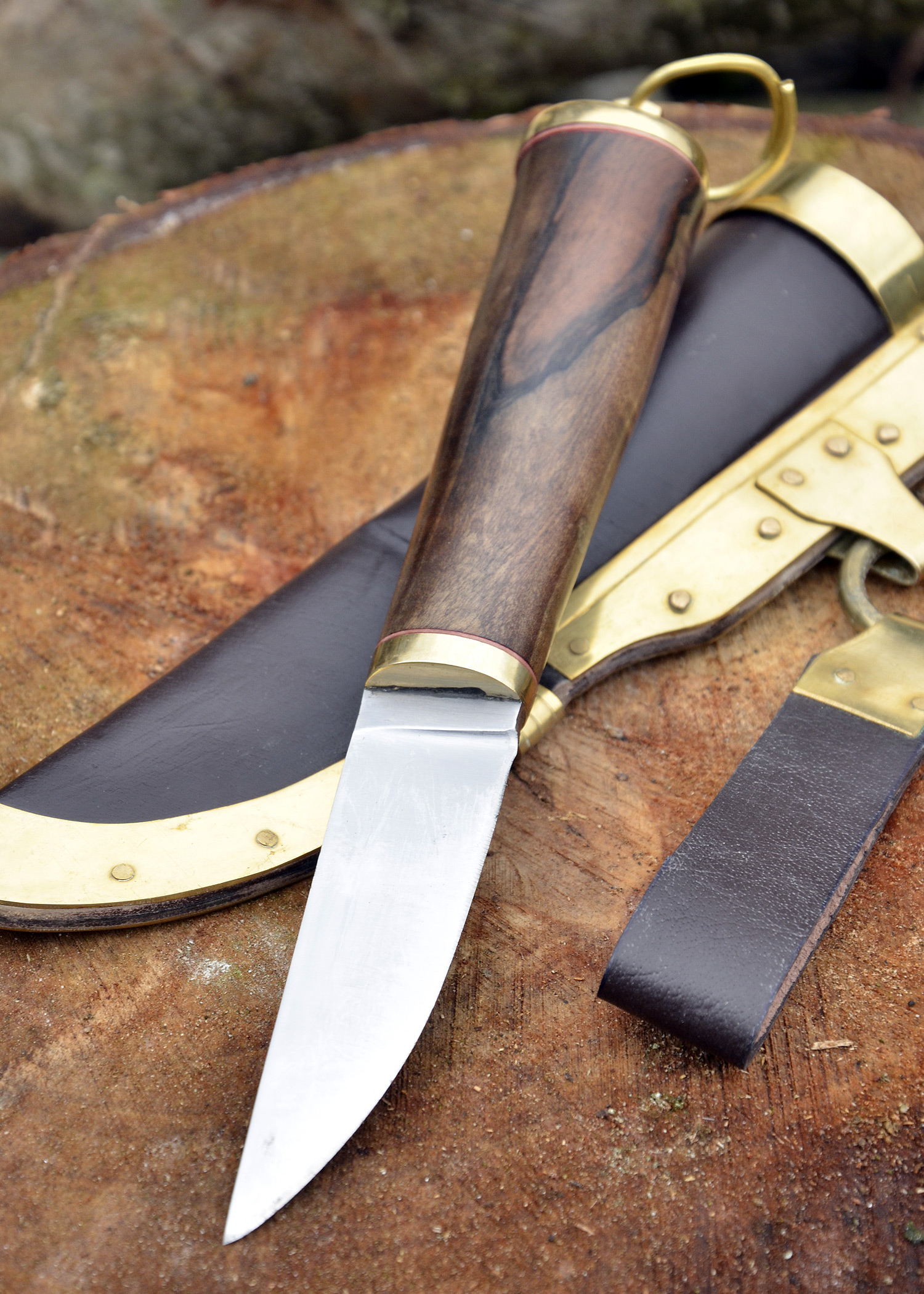 Schönes, handliches Wikinger Gebrauchsmesser mit geschmiedeter und geschärfter Karbonstahlklinge und Griff aus Walnussholz mit Messingeinfassung.